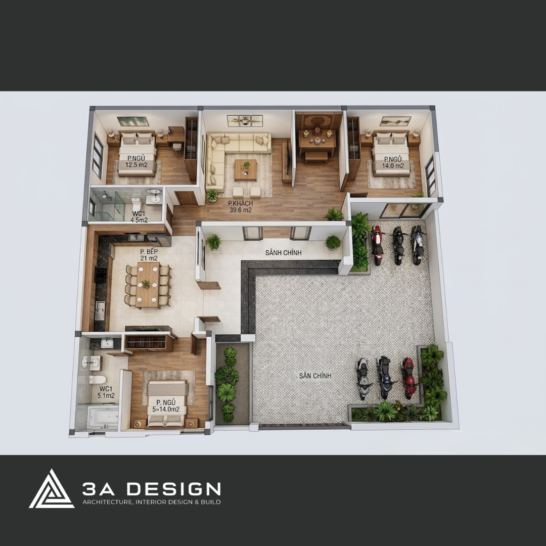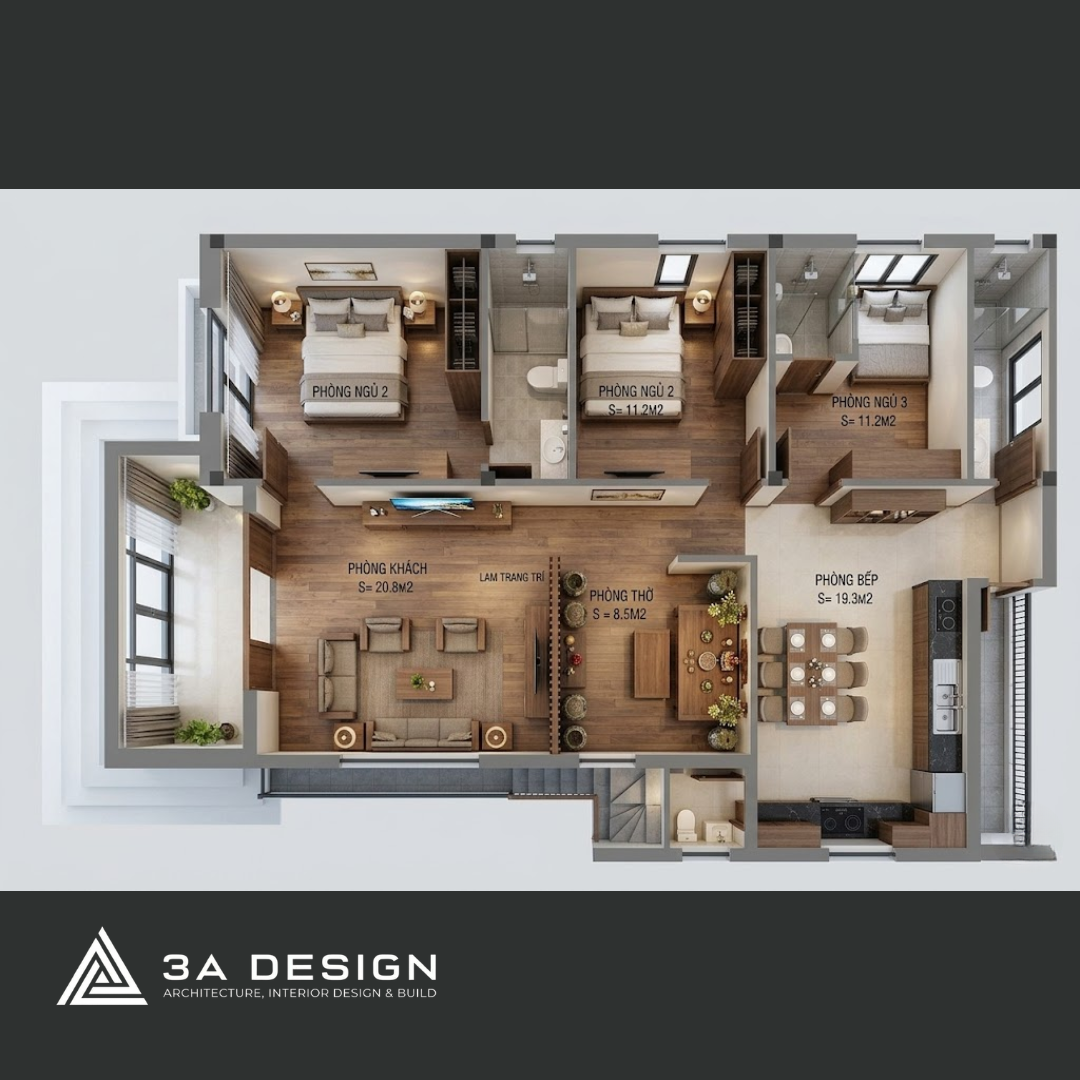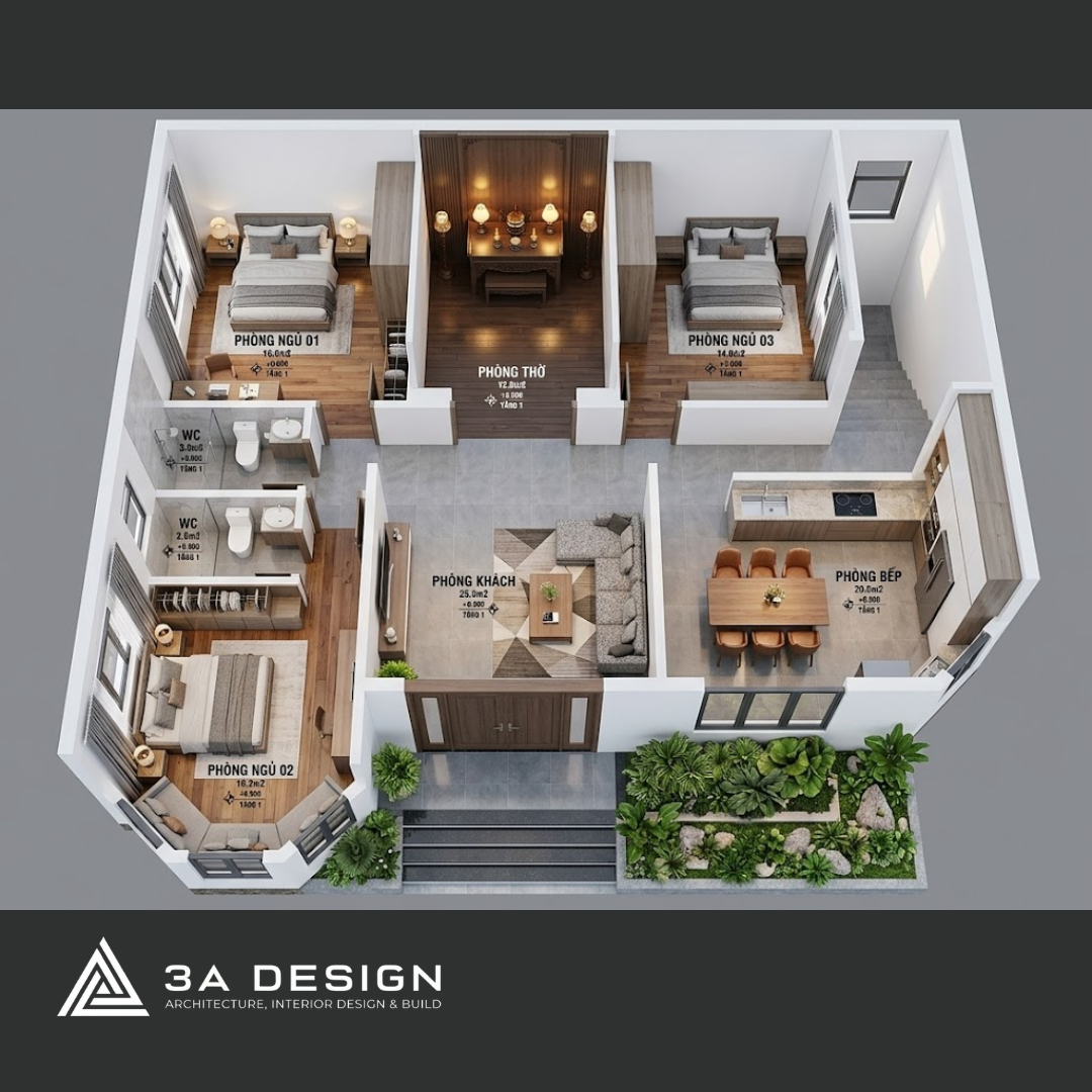 - Khu vực nghỉ ngơi: 3 phòng ngủ nên được bố trí ở các góc nhà. Nếu diện tích cho phép, hãy thiết kế ít nhất 1 phòng ngủ có nhà vệ sinh riêng (Master) và 1 nhà vệ sinh chung cho cả nhà.