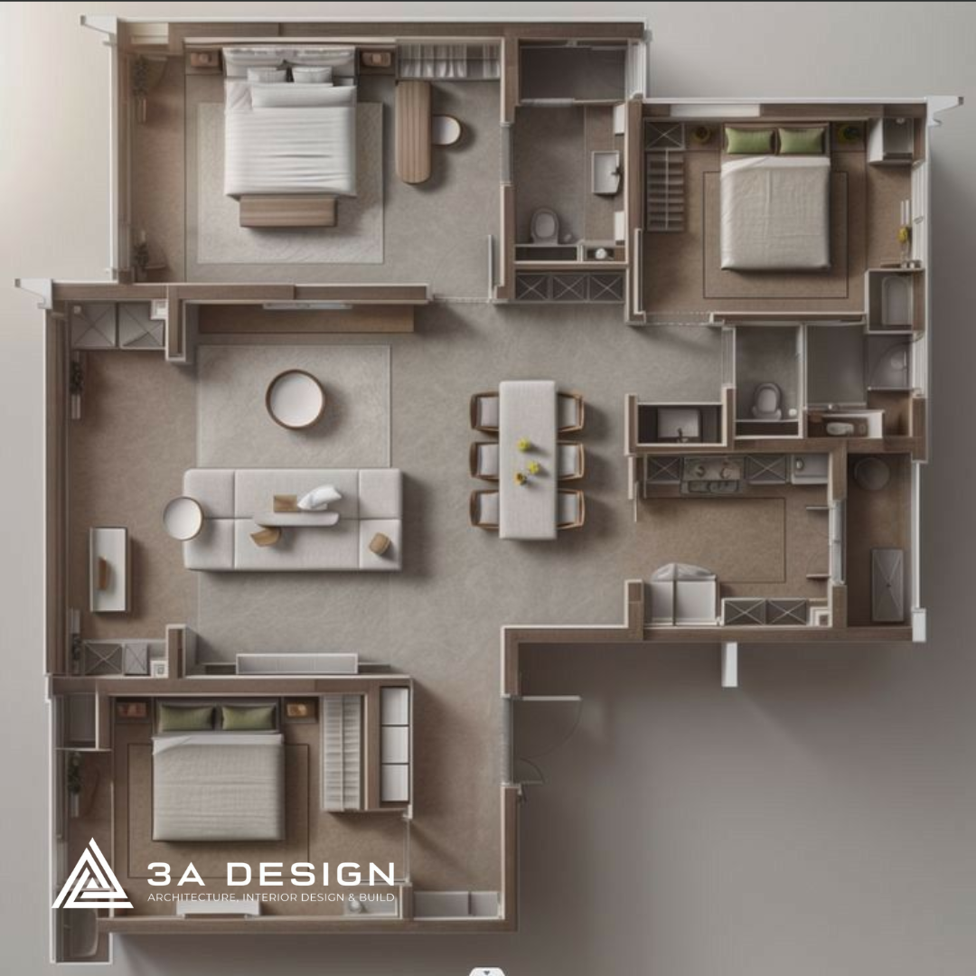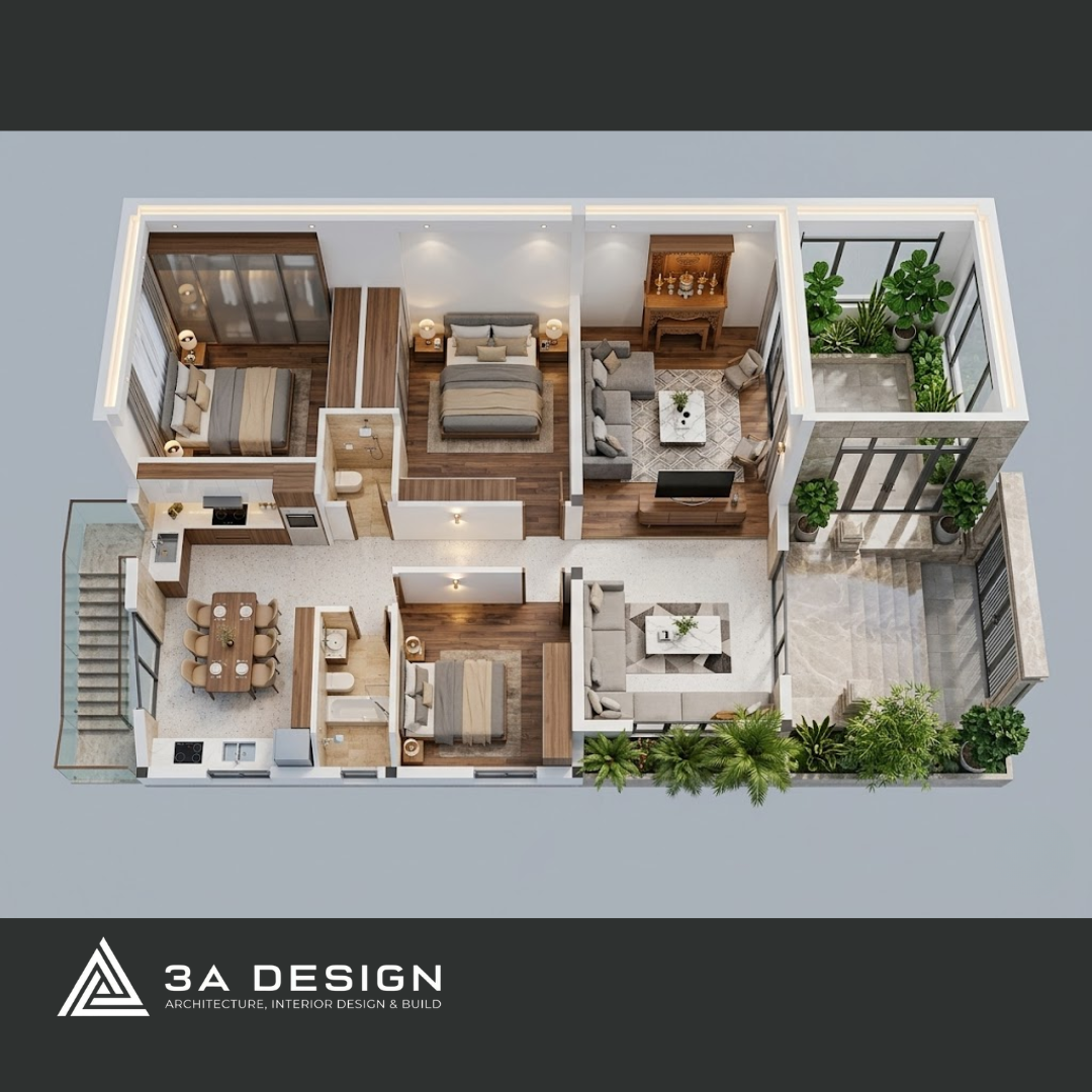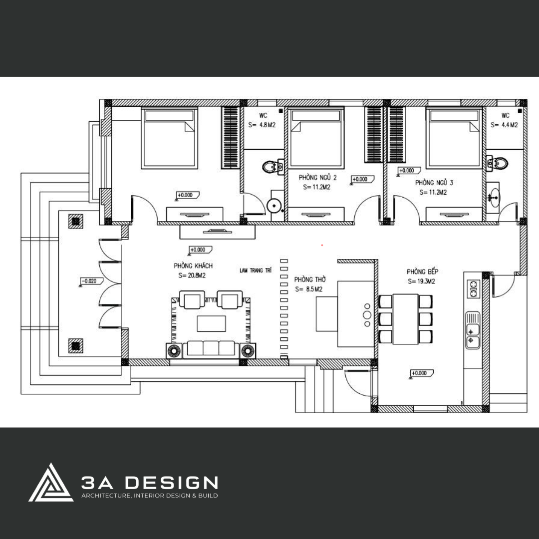 - Khu vực nghỉ ngơi: 3 phòng ngủ nên được bố trí ở các góc nhà. Nếu diện tích cho phép, hãy thiết kế ít nhất 1 phòng ngủ có nhà vệ sinh riêng (Master) và 1 nhà vệ sinh chung cho cả nhà.