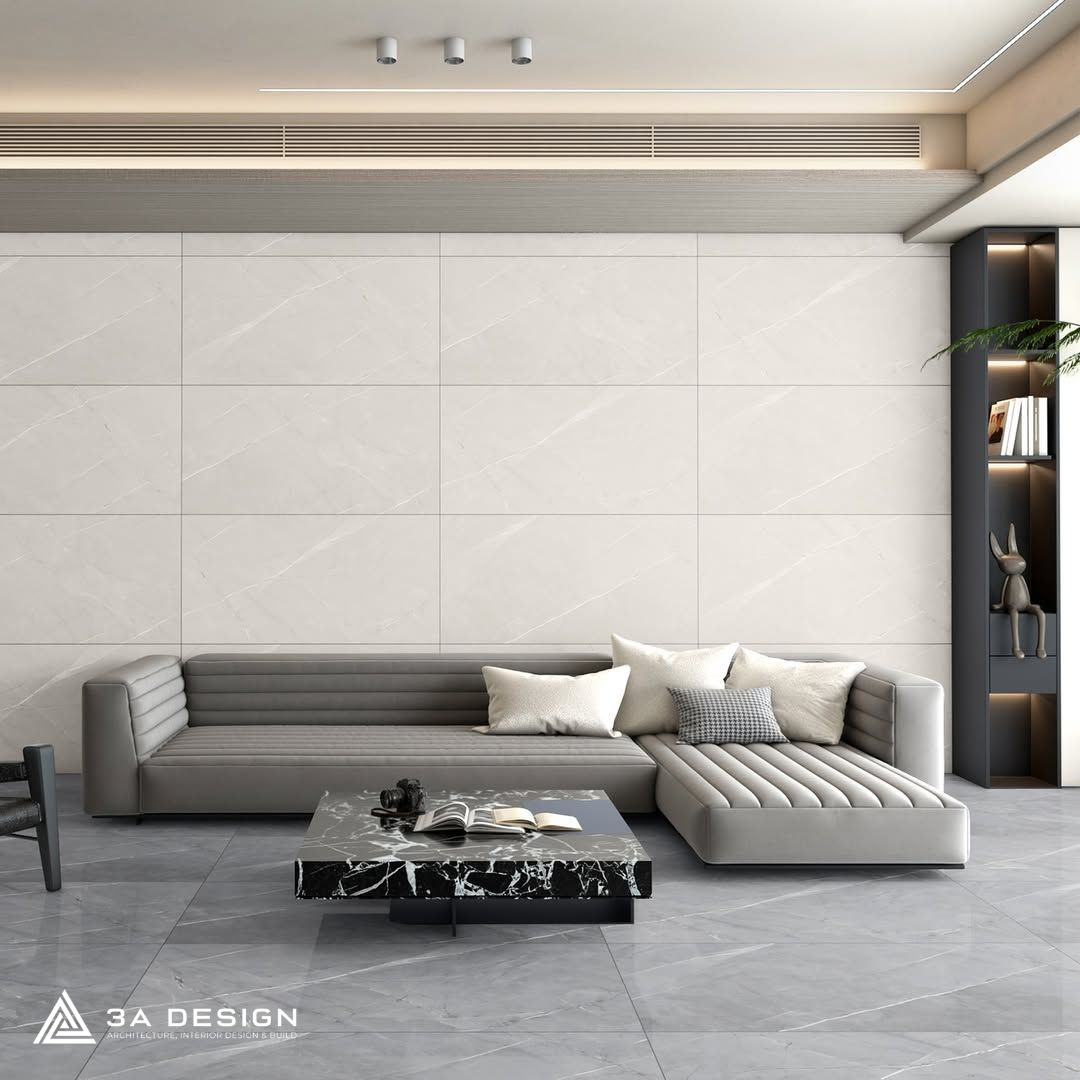 - Gạch khổ lớn (Big Slab) 60x120cm hoặc 120x240cm: Đây là “vua” của các loại gạch ốp tường phòng khách trong phân khúc hạng sang. Với ít đường ron (mạch gạch), không gian sẽ trở nên liền mạch, tạo cảm giác như được ốp bằng những khối đá tự nhiên khổng lồ.