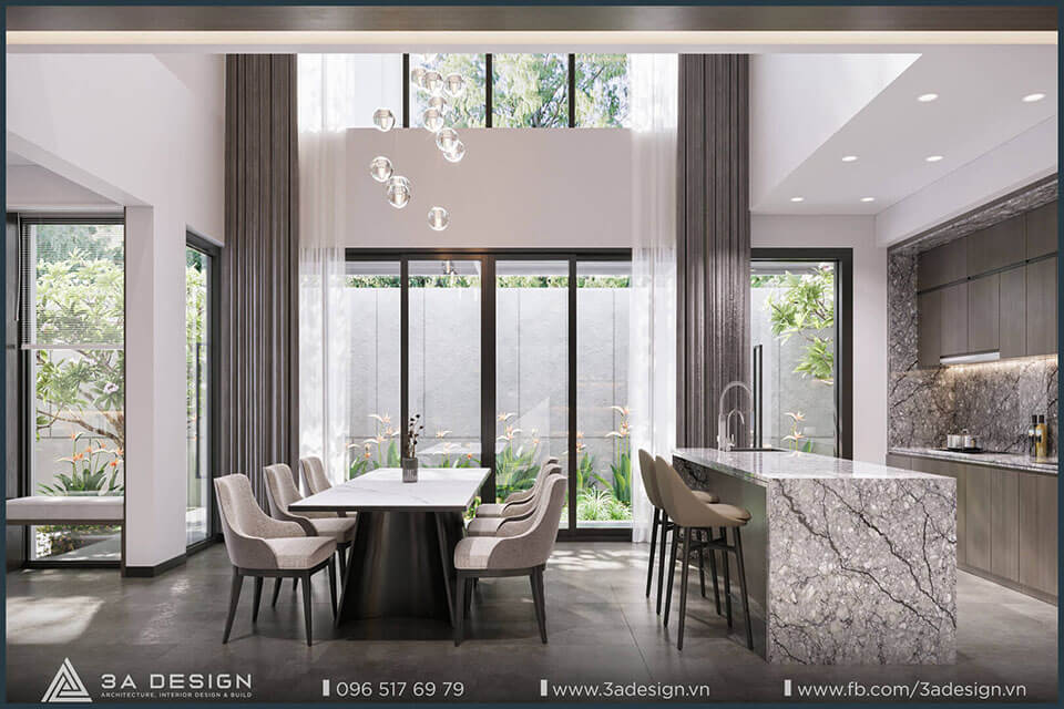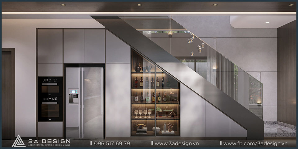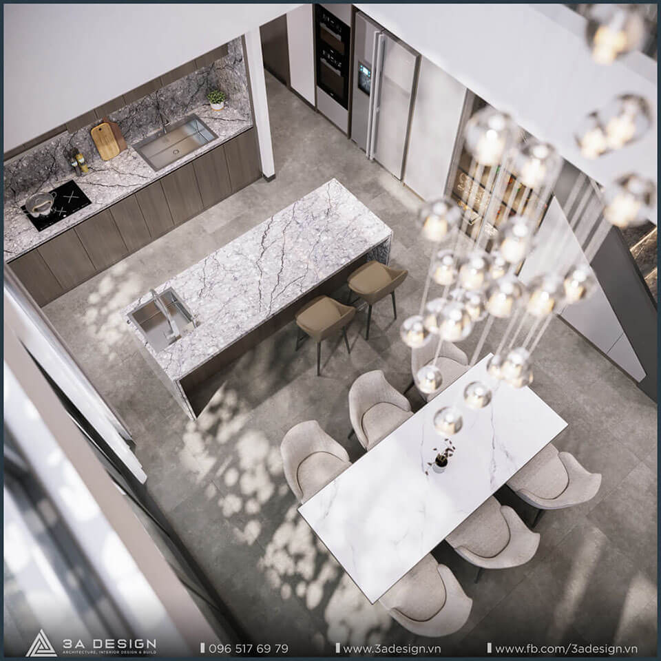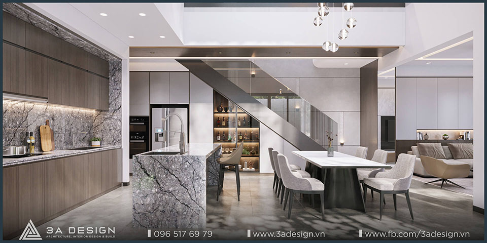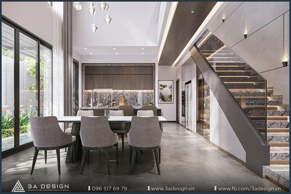 The kitchen space of D Villa is designed to take advantage of natural light through cleverly arranged glass door systems. This helps connect the kitchen space with other spaces in the house, bringing ventilation and brightness. In addition, the architects also incorporate wood grain and stone grain patterns into the kitchen space to create more liveliness and uniqueness. The combination of natural light and aesthetic elements in the design helps create a cozy and modern kitchen space for the homeowner’s family.