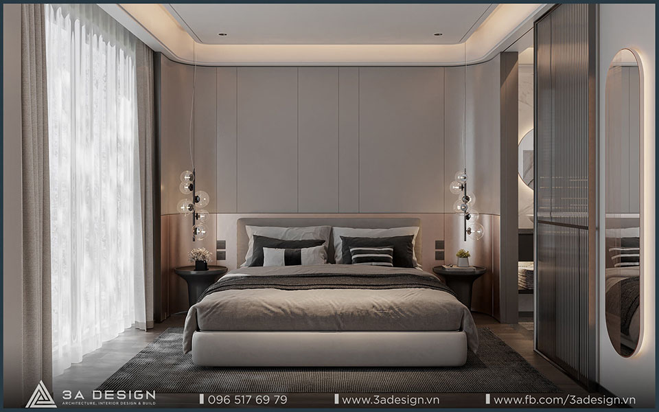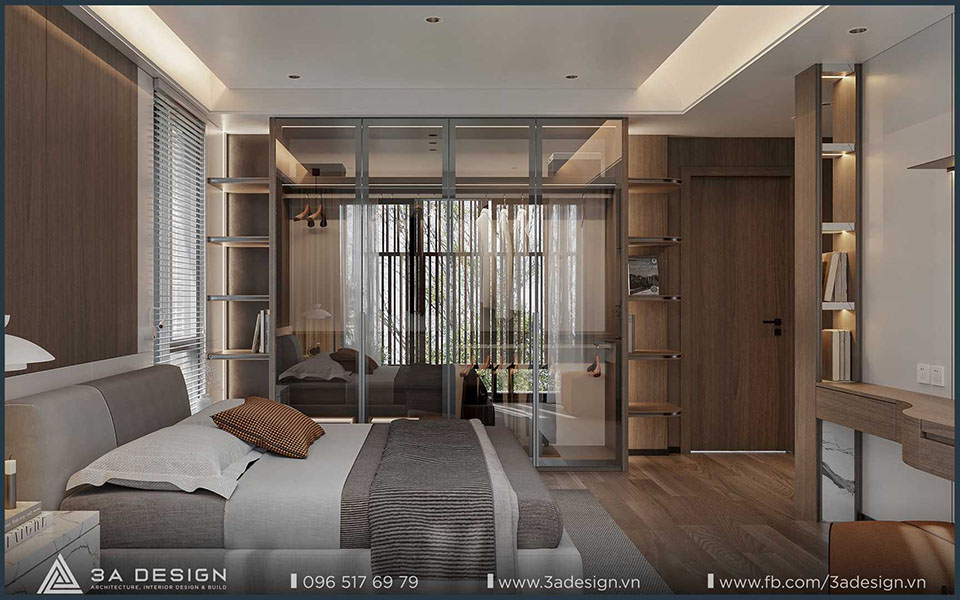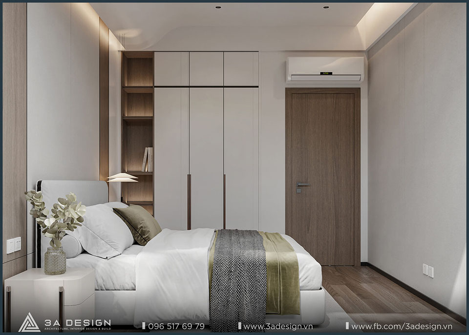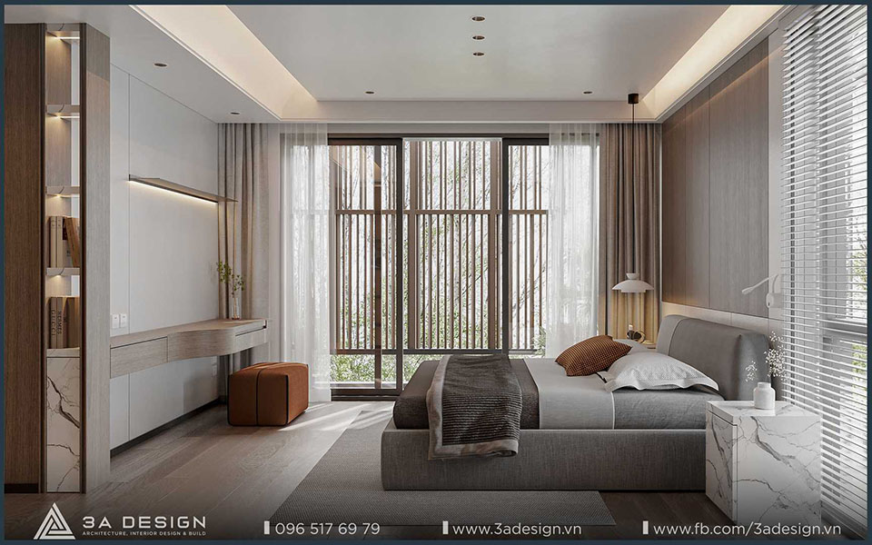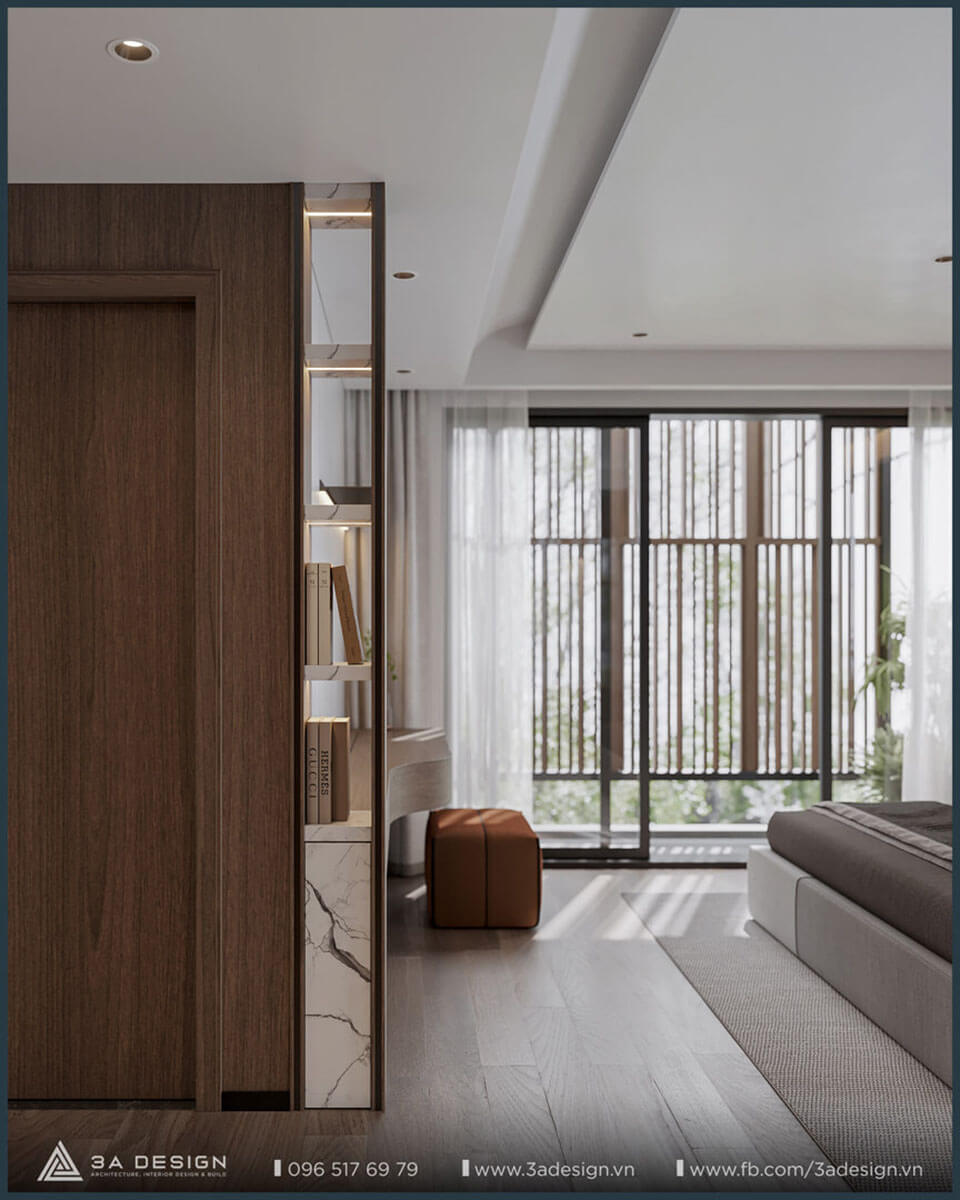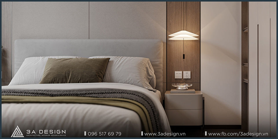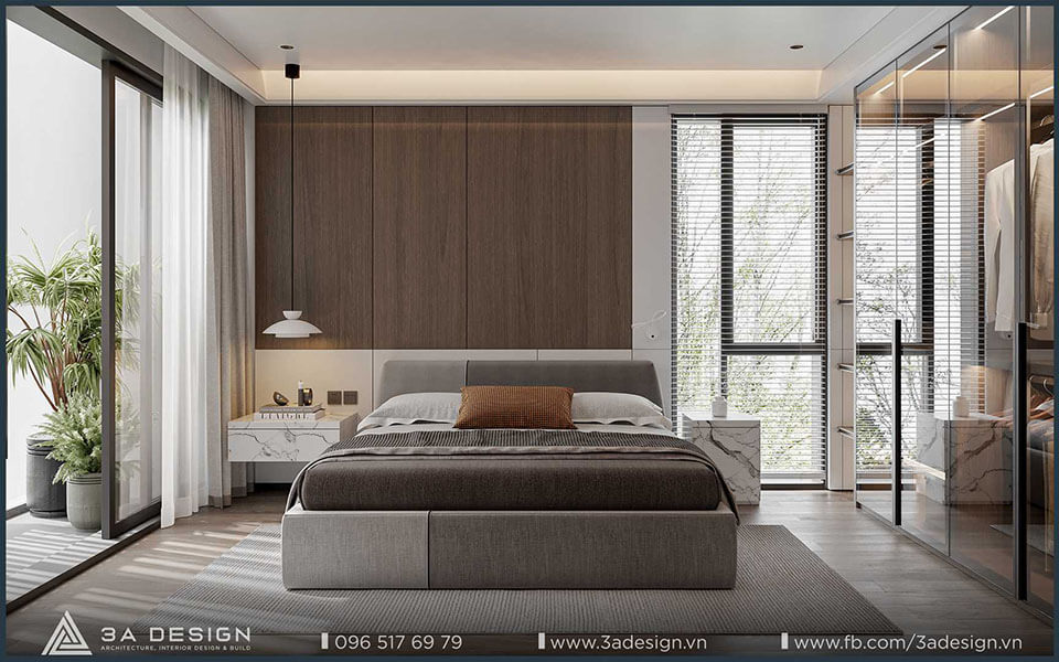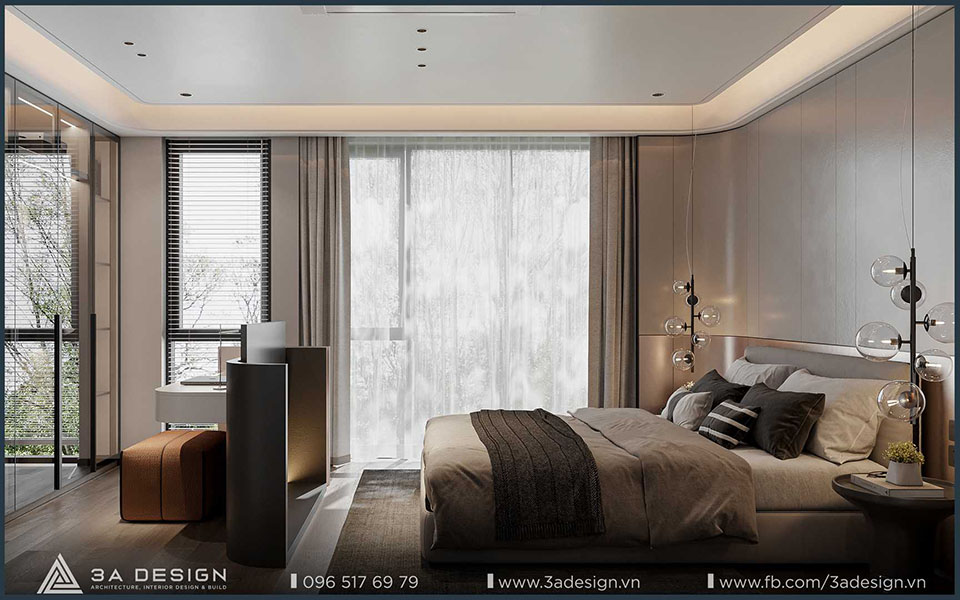 The Master bedroom at D Villa is designed to be spacious and has a direct balcony, providing a wide view and a comfortable resting space. The main color of the bedroom is gray-white, combined with other neutral colors, creating uniformity and expanding the space. Dark and warm brown wood details create a luxurious aesthetic effect, creating a classy resting space. Although not accounting for a high color ratio, these elements highlight and enhance the beauty of the Master bedroom at D Villa.