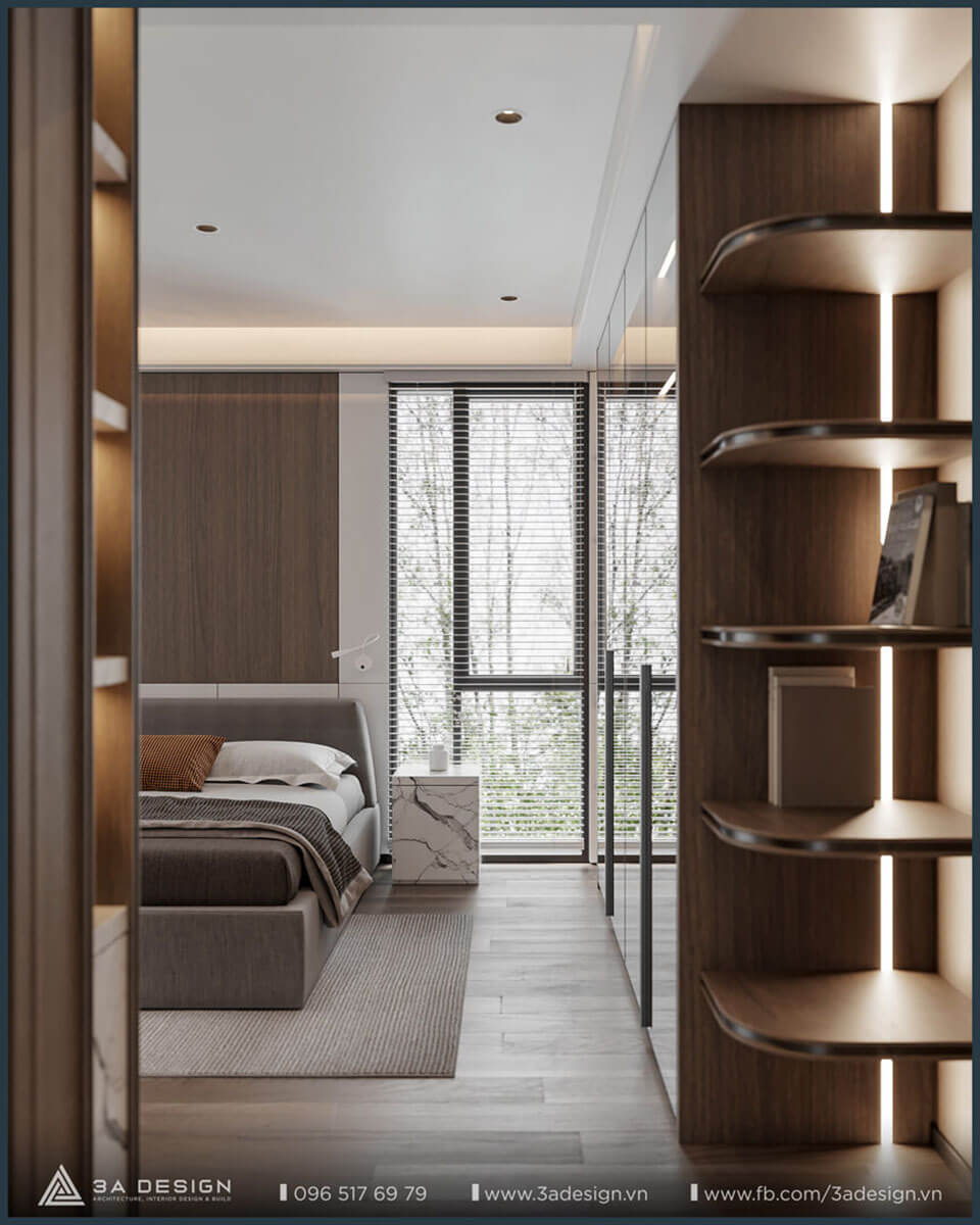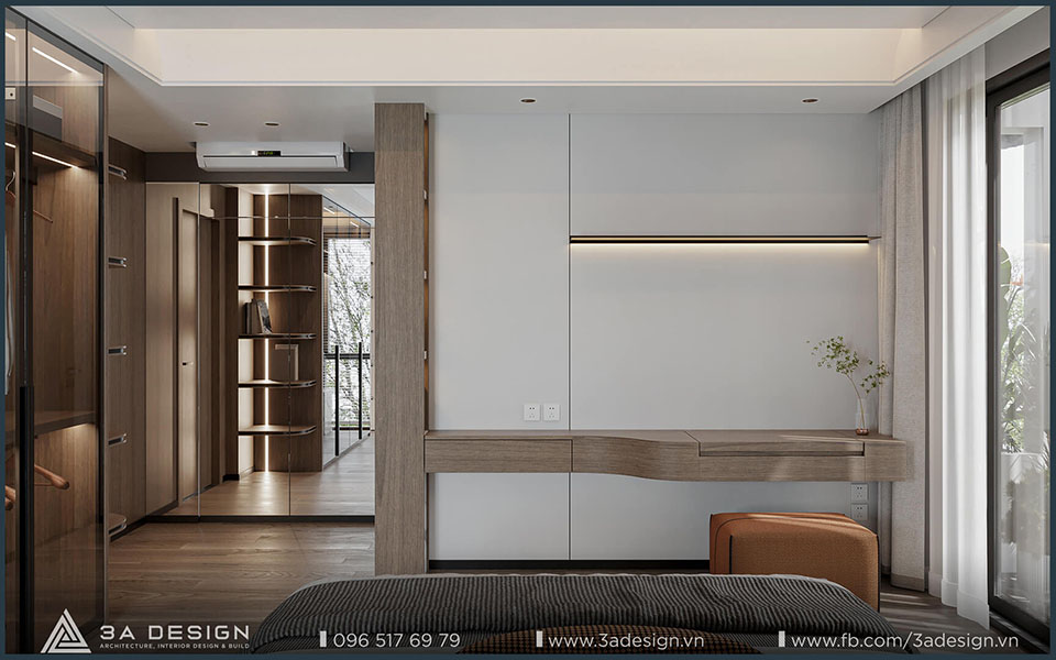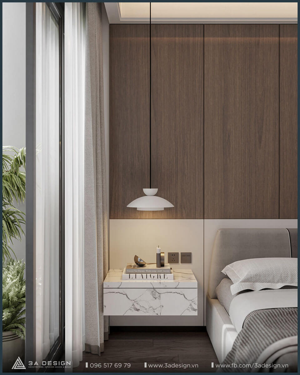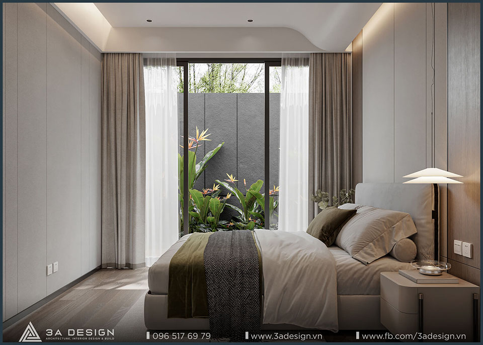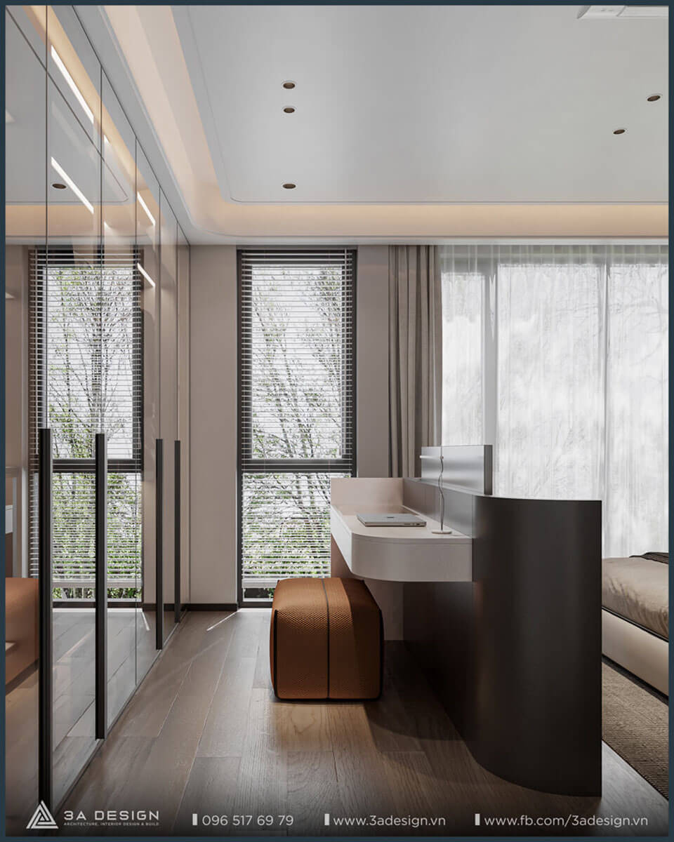 The Master bedroom at D Villa is designed to be spacious and has a direct balcony, providing a wide view and a comfortable resting space. The main color of the bedroom is gray-white, combined with other neutral colors, creating uniformity and expanding the space. Dark and warm brown wood details create a luxurious aesthetic effect, creating a classy resting space. Although not accounting for a high color ratio, these elements highlight and enhance the beauty of the Master bedroom at D Villa.