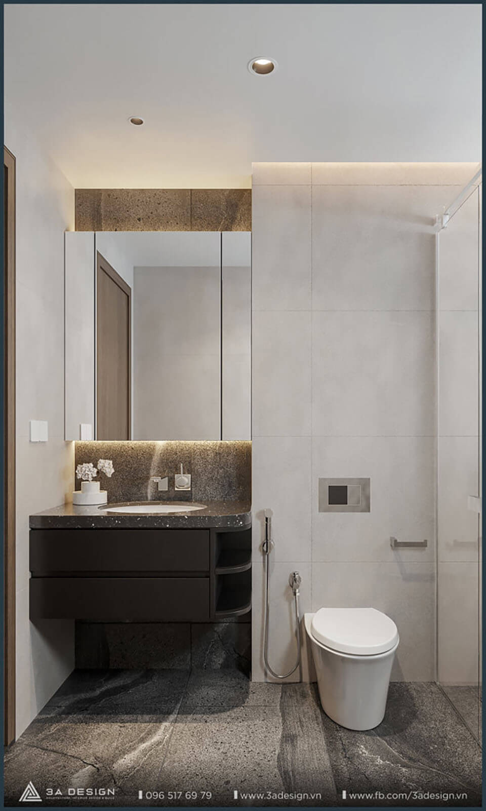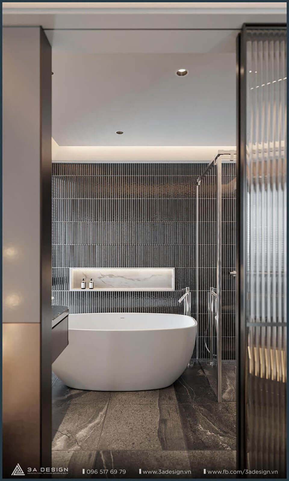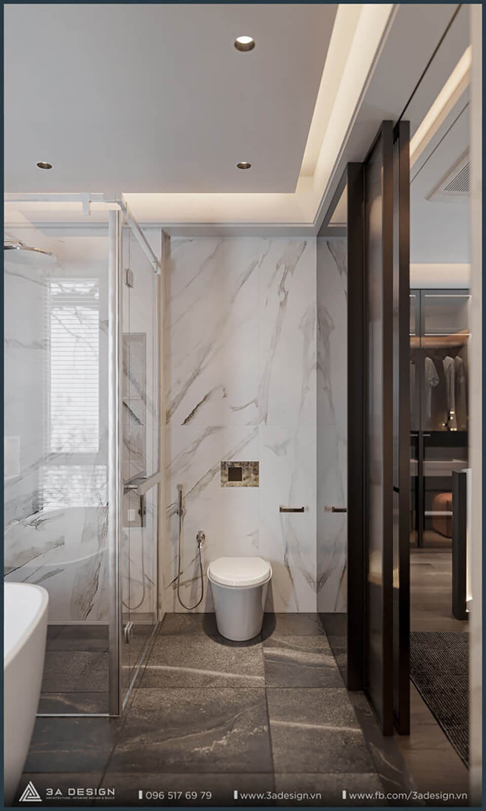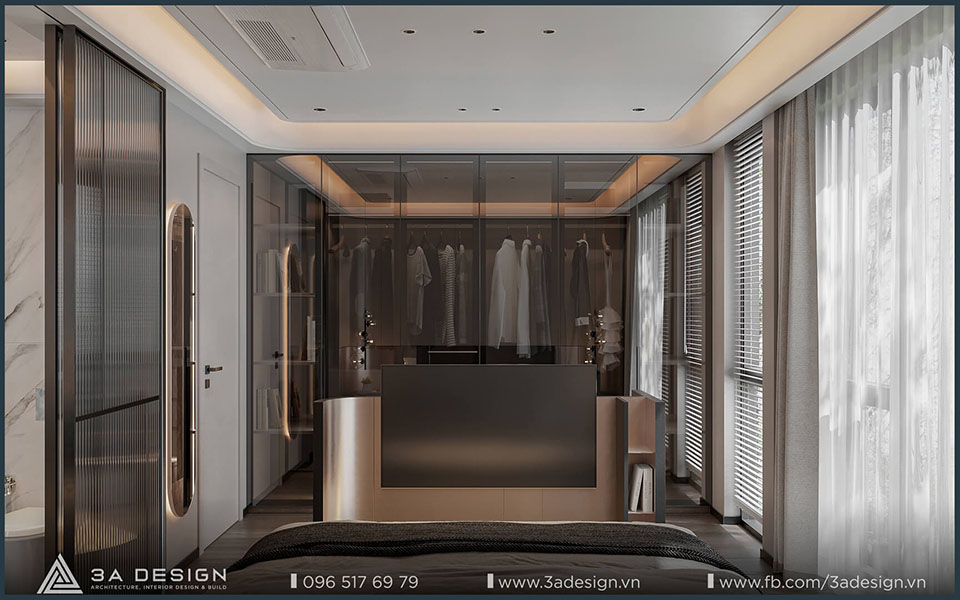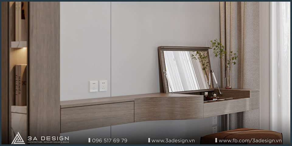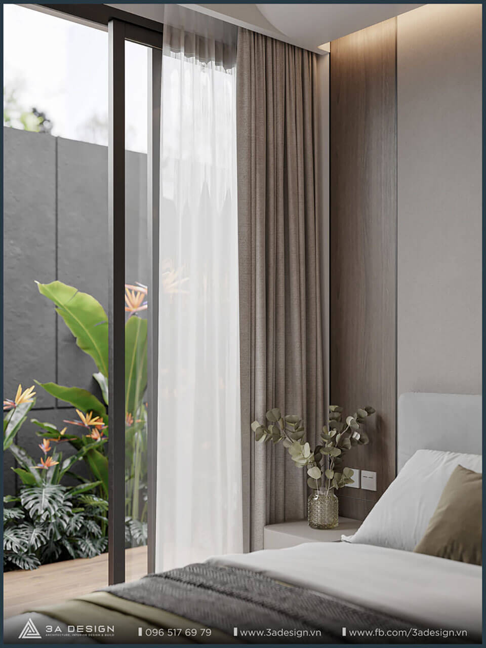 The Master bedroom at D Villa is designed to be spacious and has a direct balcony, providing a wide view and a comfortable resting space. The main color of the bedroom is gray-white, combined with other neutral colors, creating uniformity and expanding the space. Dark and warm brown wood details create a luxurious aesthetic effect, creating a classy resting space. Although not accounting for a high color ratio, these elements highlight and enhance the beauty of the Master bedroom at D Villa.