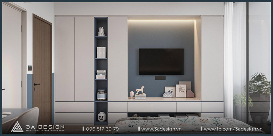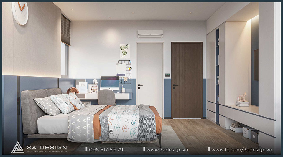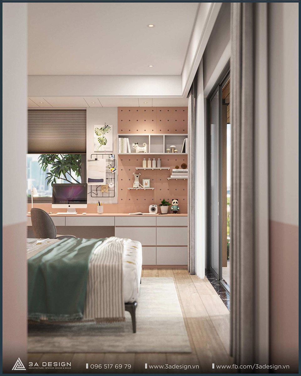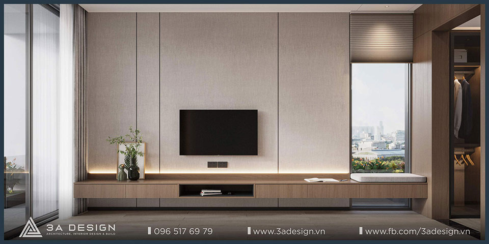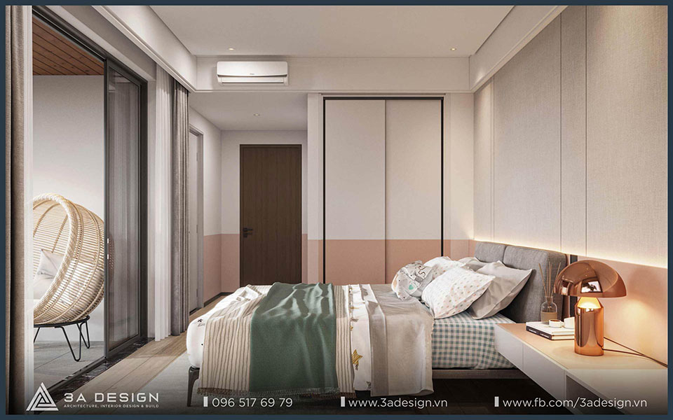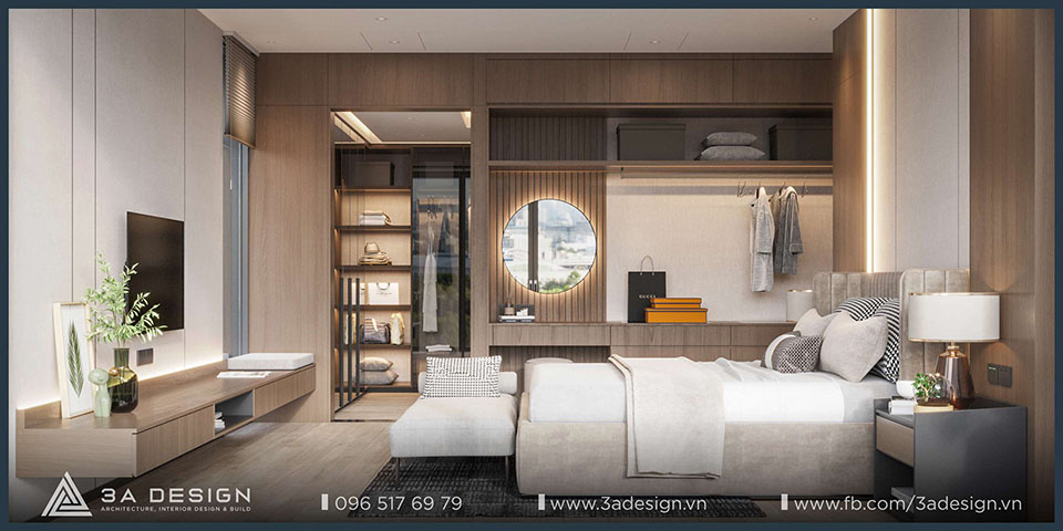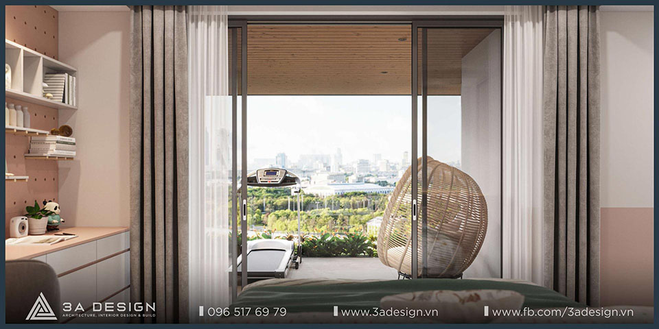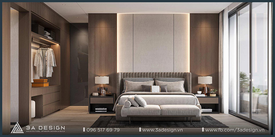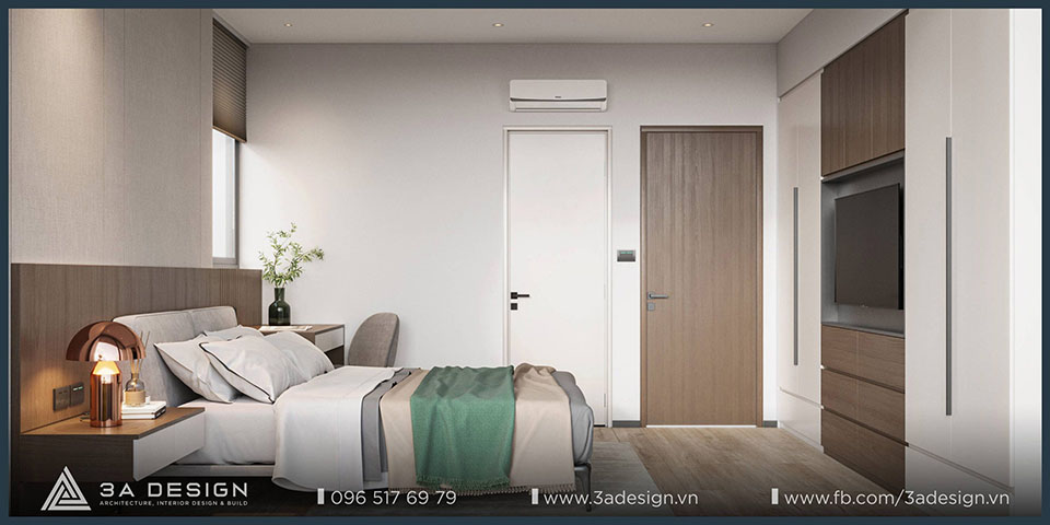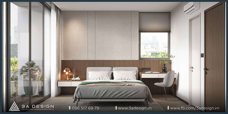 The modern master bedroom features convenient furnishings, and the television is discreetly integrated into the room, ensuring both convenience and ideal privacy. Furthermore, the master bedroom view opens out to a balcony with lush greenery. As a result, the room is always filled with natural light and fresh air, making the space more airy and cool.