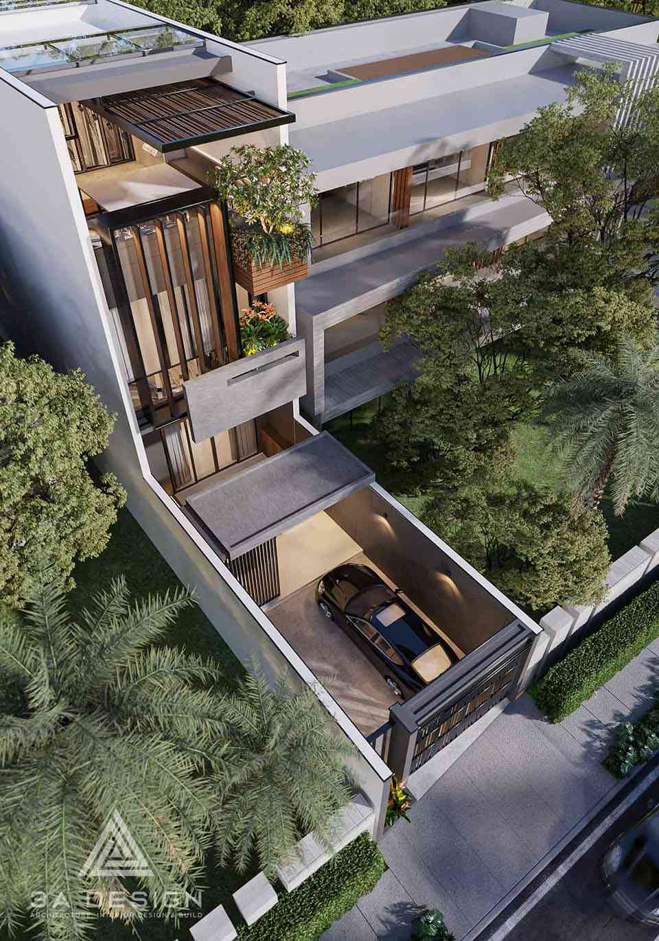 Given the house’s front-facing location on a high-traffic main road, the architects skillfully incorporated a front setback to facilitate easier vehicle access and parking, while simultaneously mitigating traffic noise. The rear setback was also strategically utilized as a small garden, interwoven with green elements, which significantly enhances the aesthetic value of the home.