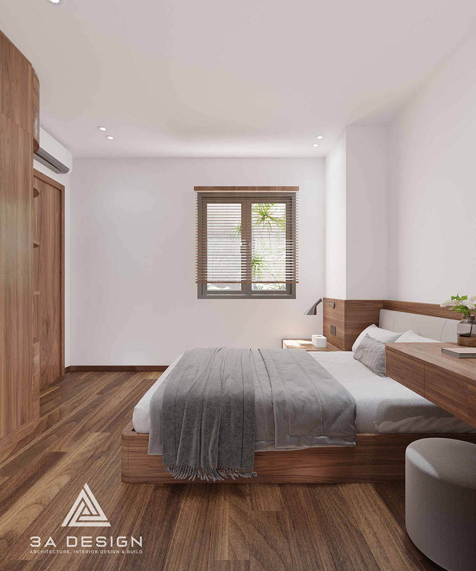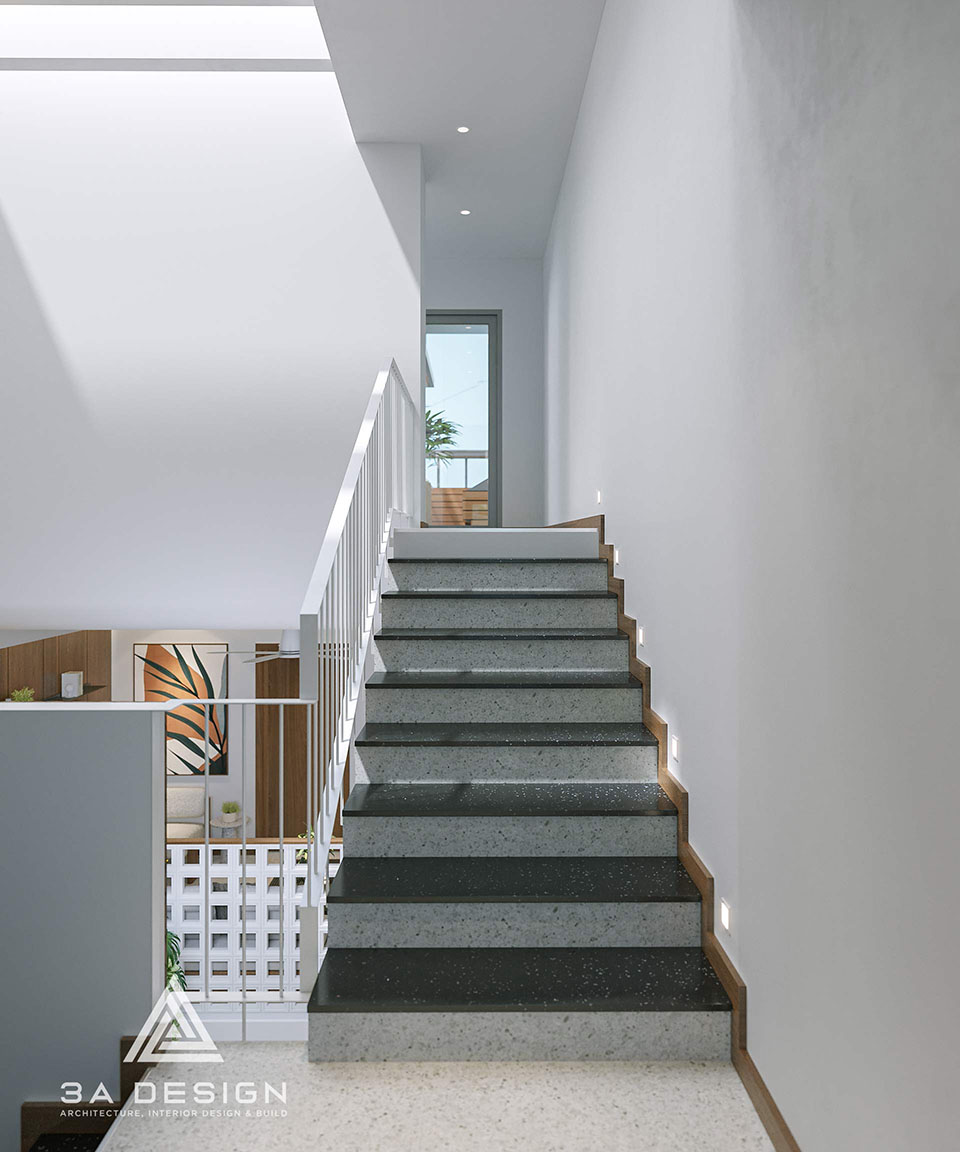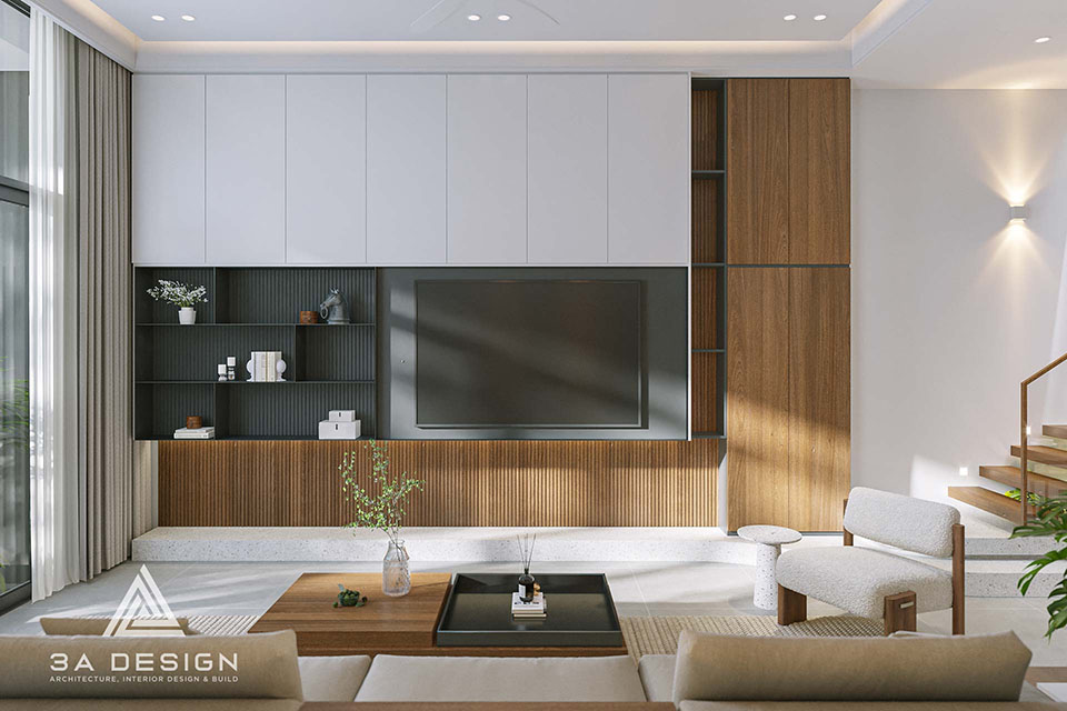 The TT House townhouse, situated on a west-facing plot, is significantly exposed to harsh sunlight. To address this challenge, 3A Design’s architects implemented a special architectural solution: creating a solid-void composition for the façade, combined with a protective roof overhang to mitigate sun exposure. In addition, a layer of wood-imitation plastic louvers integrated with greenery helps block thermal radiation, ensuring the owner enjoys a cool living space that is closely connected to nature.