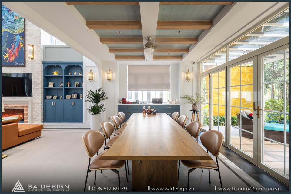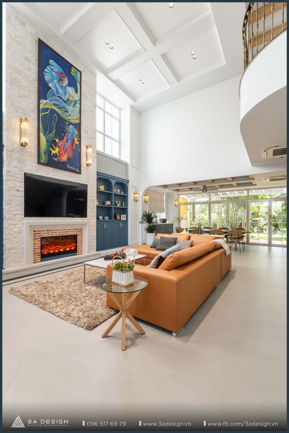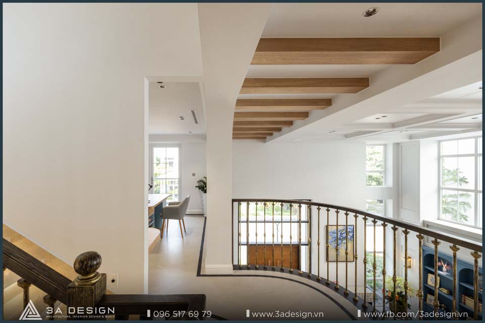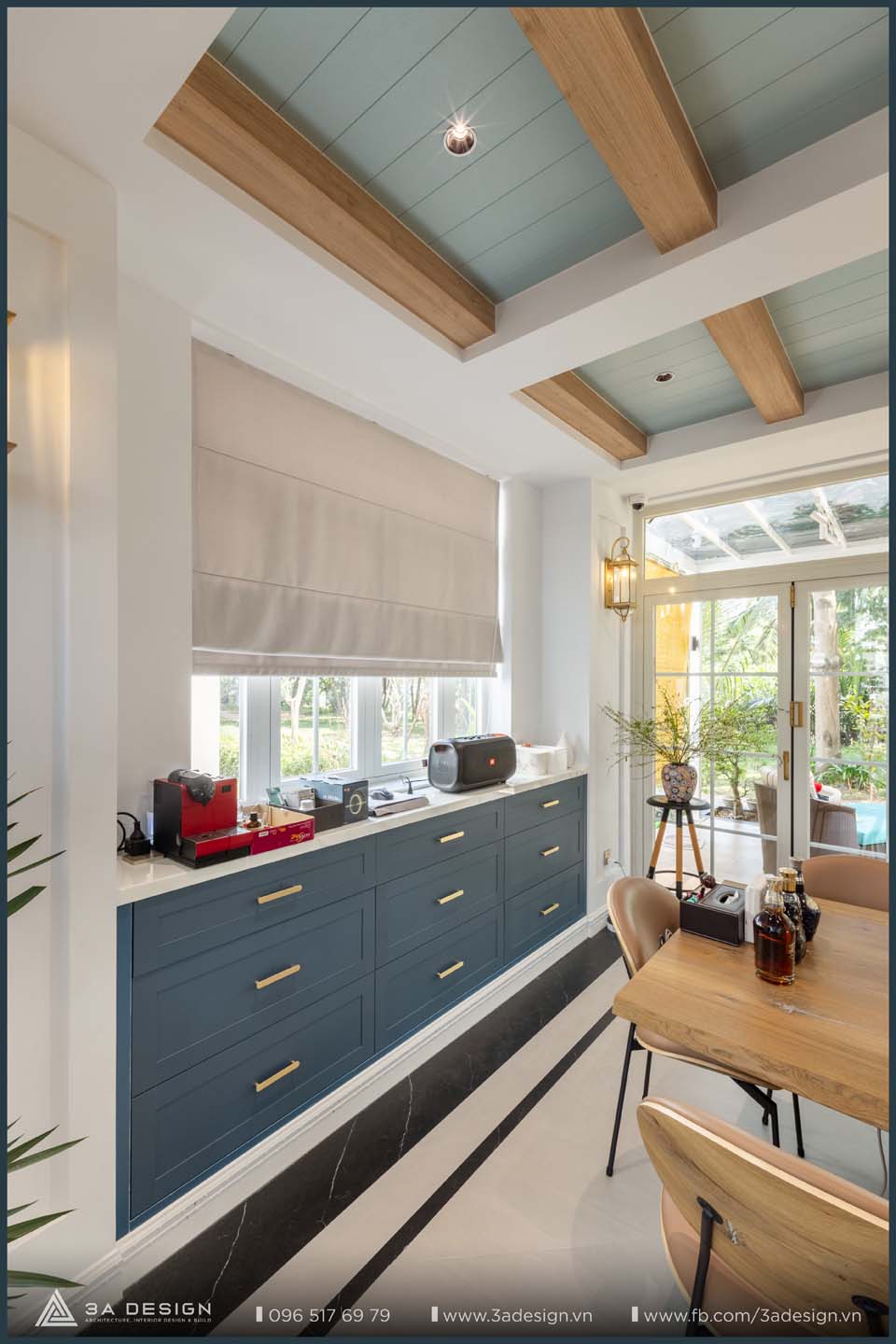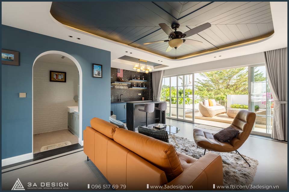 Yếu tố vòm cũng được sử dụng nhiều trong kiến trúc và nội thất của căn nhà này. Những khoảng chuyển không gian được tạo ra nhờ vào yếu tố này, mang lại sự nhẹ nhàng và thanh lịch đặc trưng của phong cách nội thất đồng quê. Đồ nội thất được sử dụng trong toàn bộ căn villa đều theo lối hiện đại và tiện dụng. Tone màu kem sữa và xanh coban làm chủ đạo, cùng với những đường nét nhẹ nhàng tạo nên sự ấm áp và gần gũi. Điều này cũng phản ánh sự tiện nghi và lối sống giản dị của gia chủ.