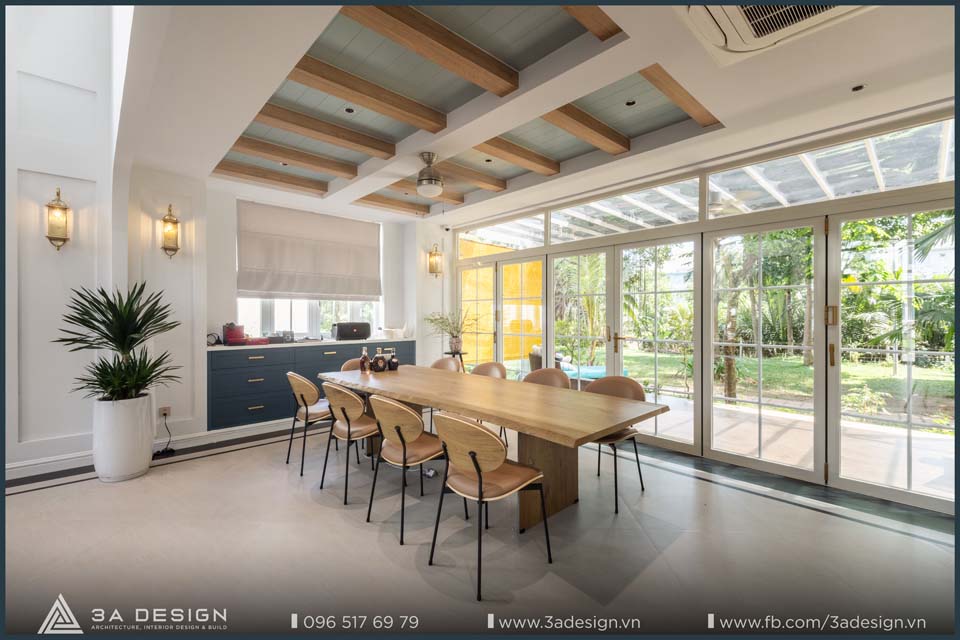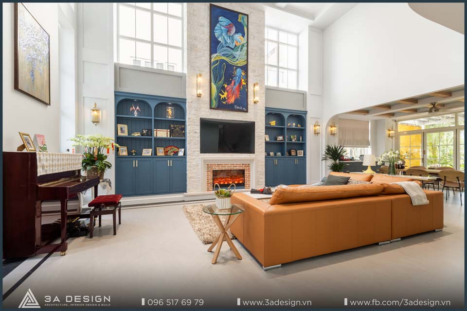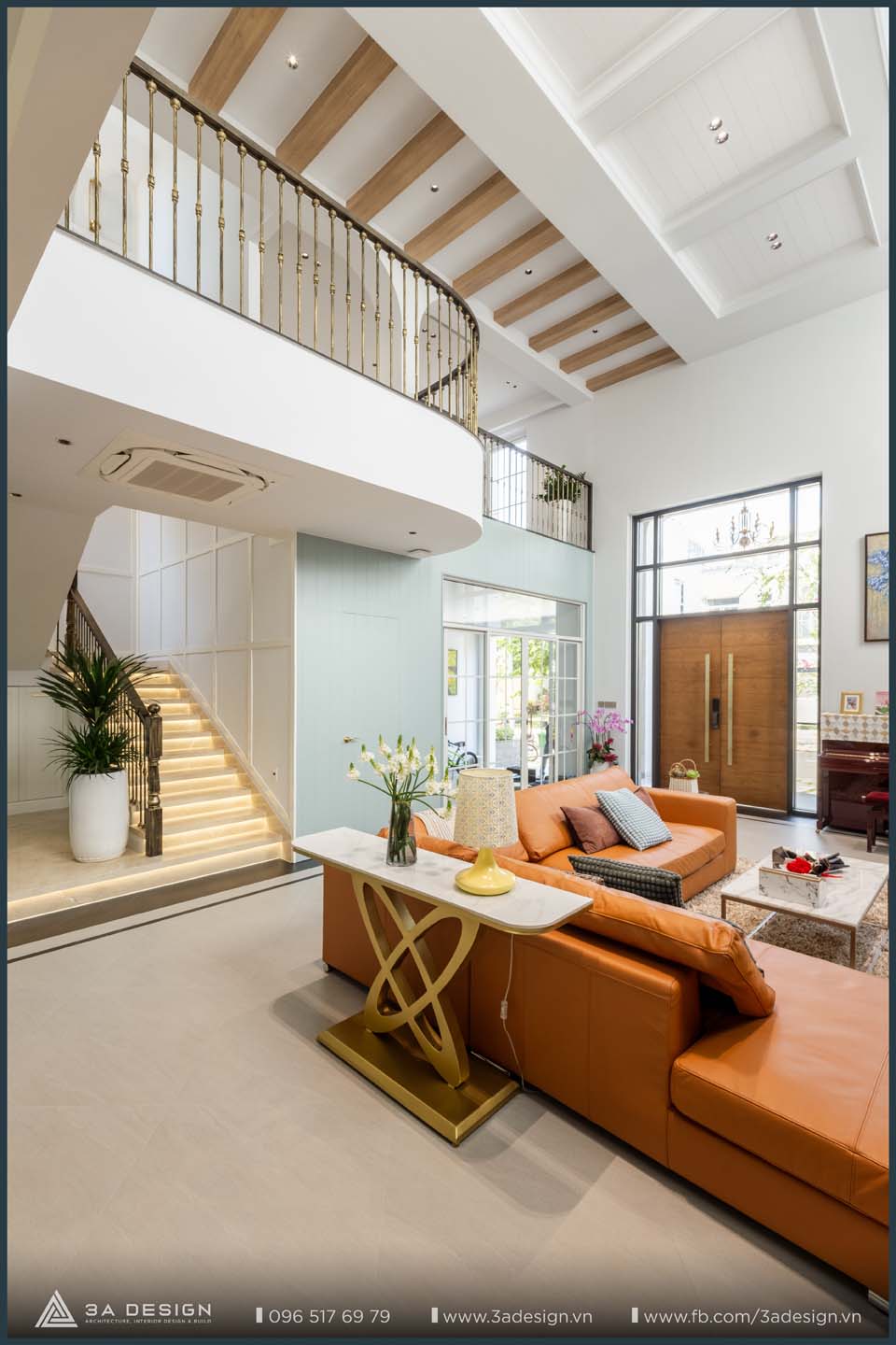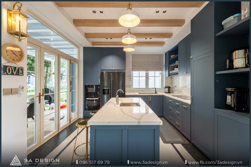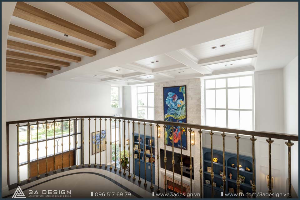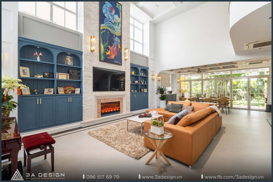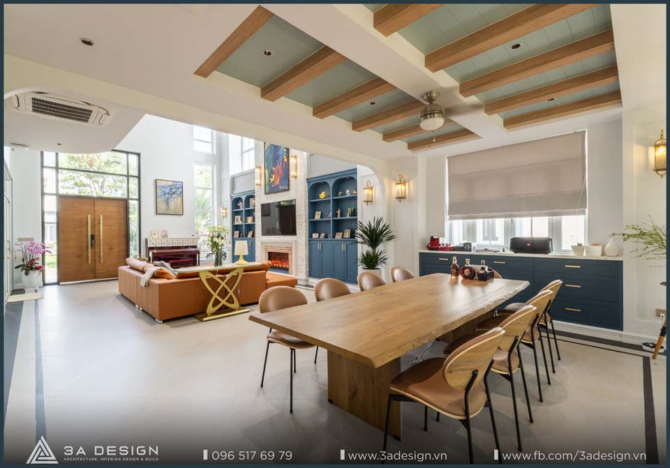 Yếu tố vòm cũng được sử dụng nhiều trong kiến trúc và nội thất của căn nhà này. Những khoảng chuyển không gian được tạo ra nhờ vào yếu tố này, mang lại sự nhẹ nhàng và thanh lịch đặc trưng của phong cách nội thất đồng quê. Đồ nội thất được sử dụng trong toàn bộ căn villa đều theo lối hiện đại và tiện dụng. Tone màu kem sữa và xanh coban làm chủ đạo, cùng với những đường nét nhẹ nhàng tạo nên sự ấm áp và gần gũi. Điều này cũng phản ánh sự tiện nghi và lối sống giản dị của gia chủ.