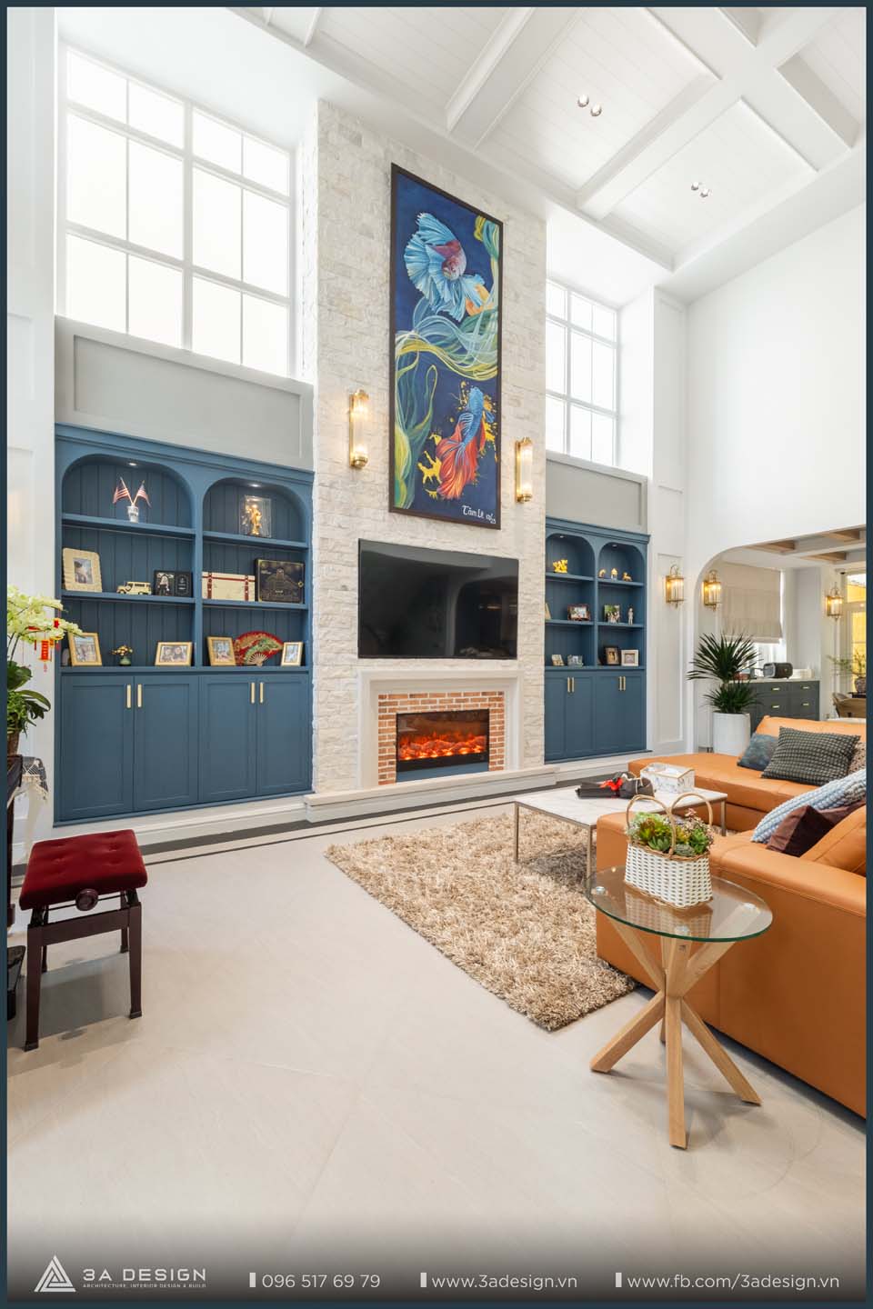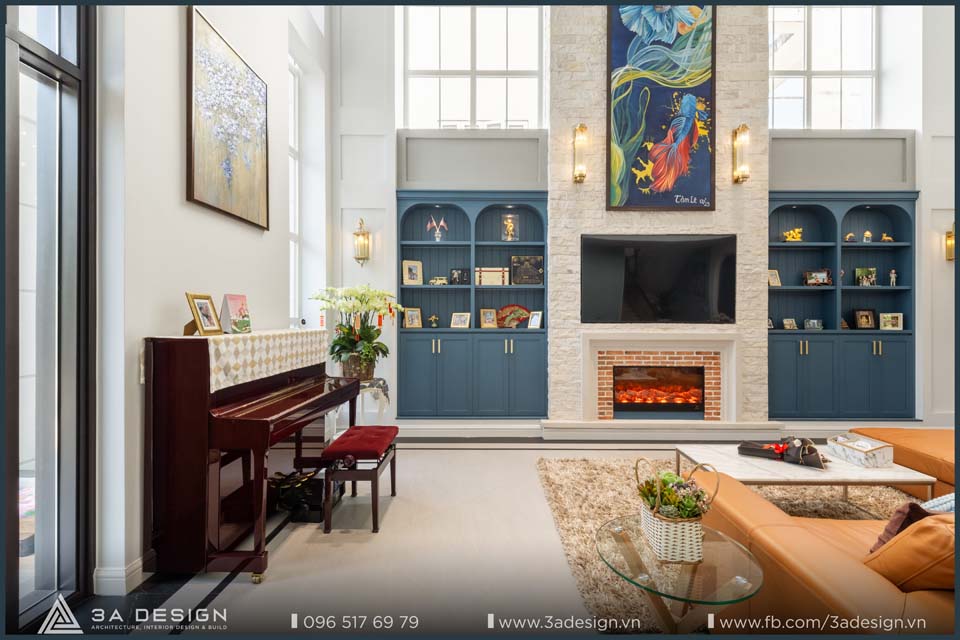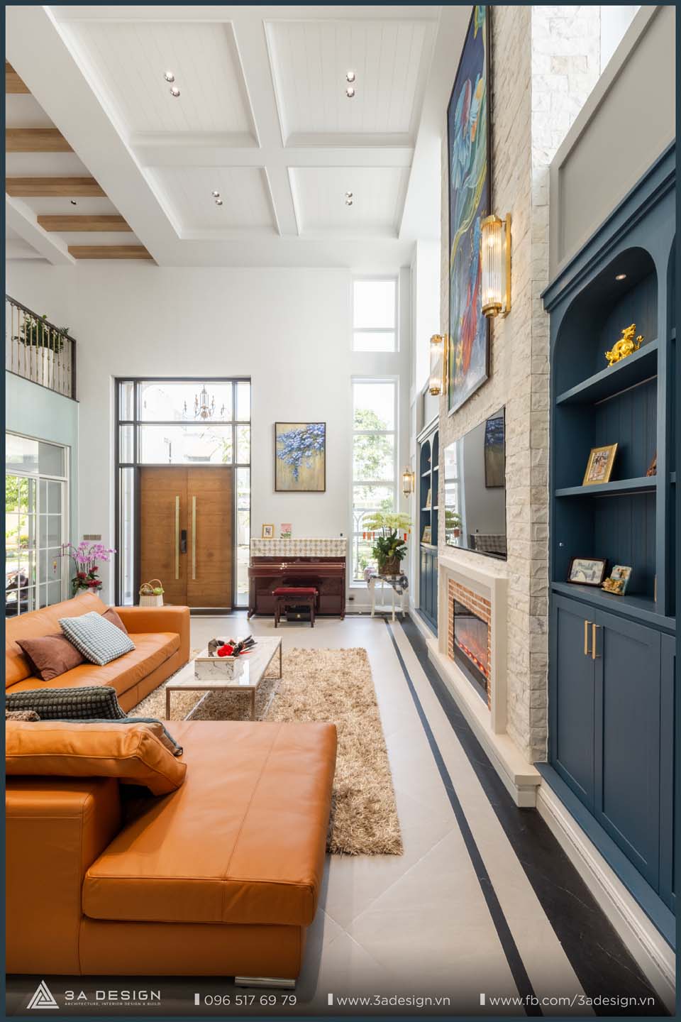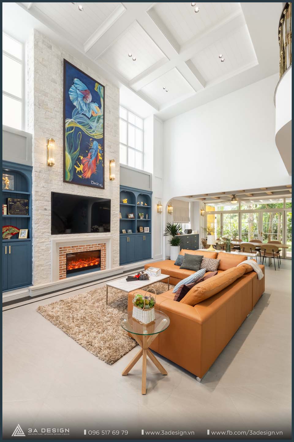 Yếu tố vòm cũng được sử dụng nhiều trong kiến trúc và nội thất của căn nhà này. Những khoảng chuyển không gian được tạo ra nhờ vào yếu tố này, mang lại sự nhẹ nhàng và thanh lịch đặc trưng của phong cách nội thất đồng quê. Đồ nội thất được sử dụng trong toàn bộ căn villa đều theo lối hiện đại và tiện dụng. Tone màu kem sữa và xanh coban làm chủ đạo, cùng với những đường nét nhẹ nhàng tạo nên sự ấm áp và gần gũi. Điều này cũng phản ánh sự tiện nghi và lối sống giản dị của gia chủ.
