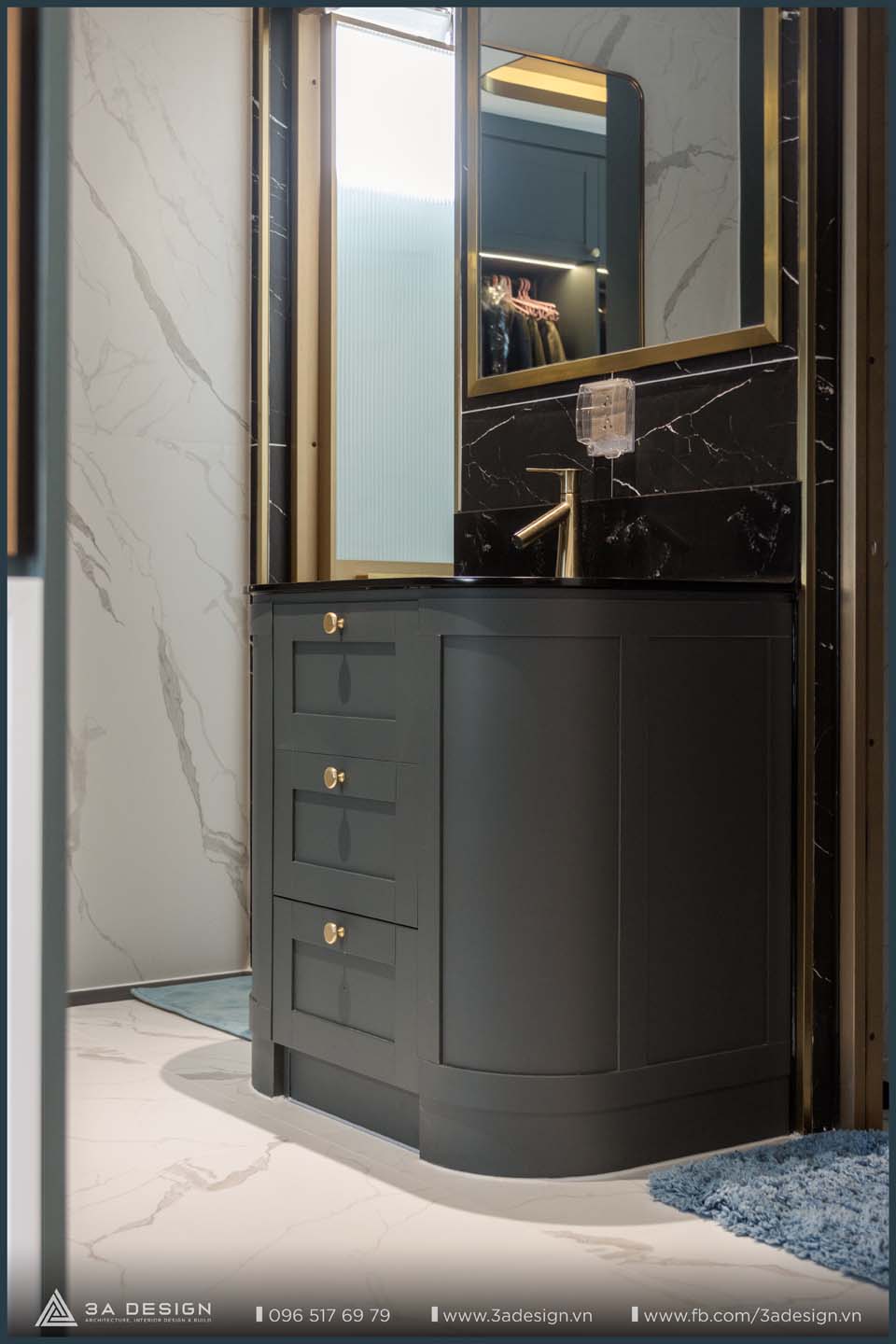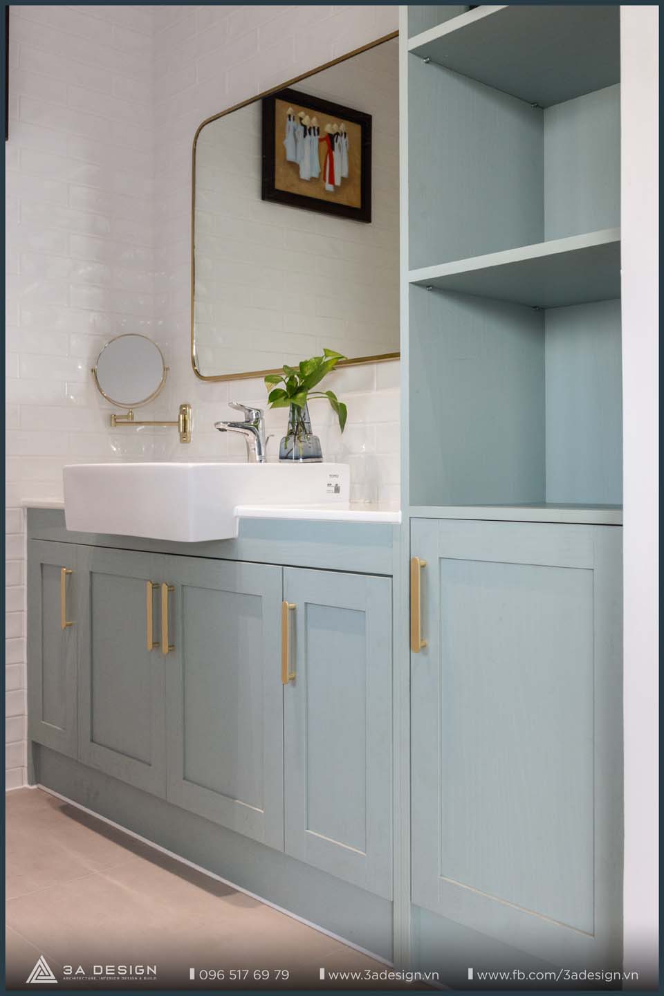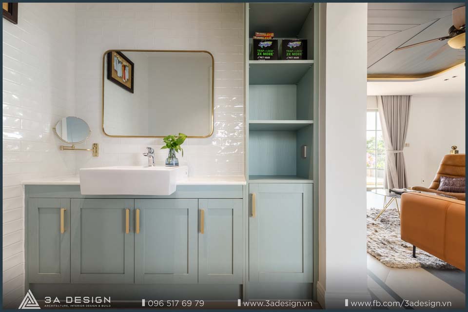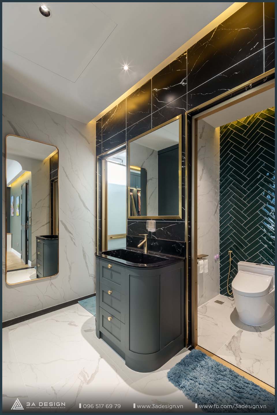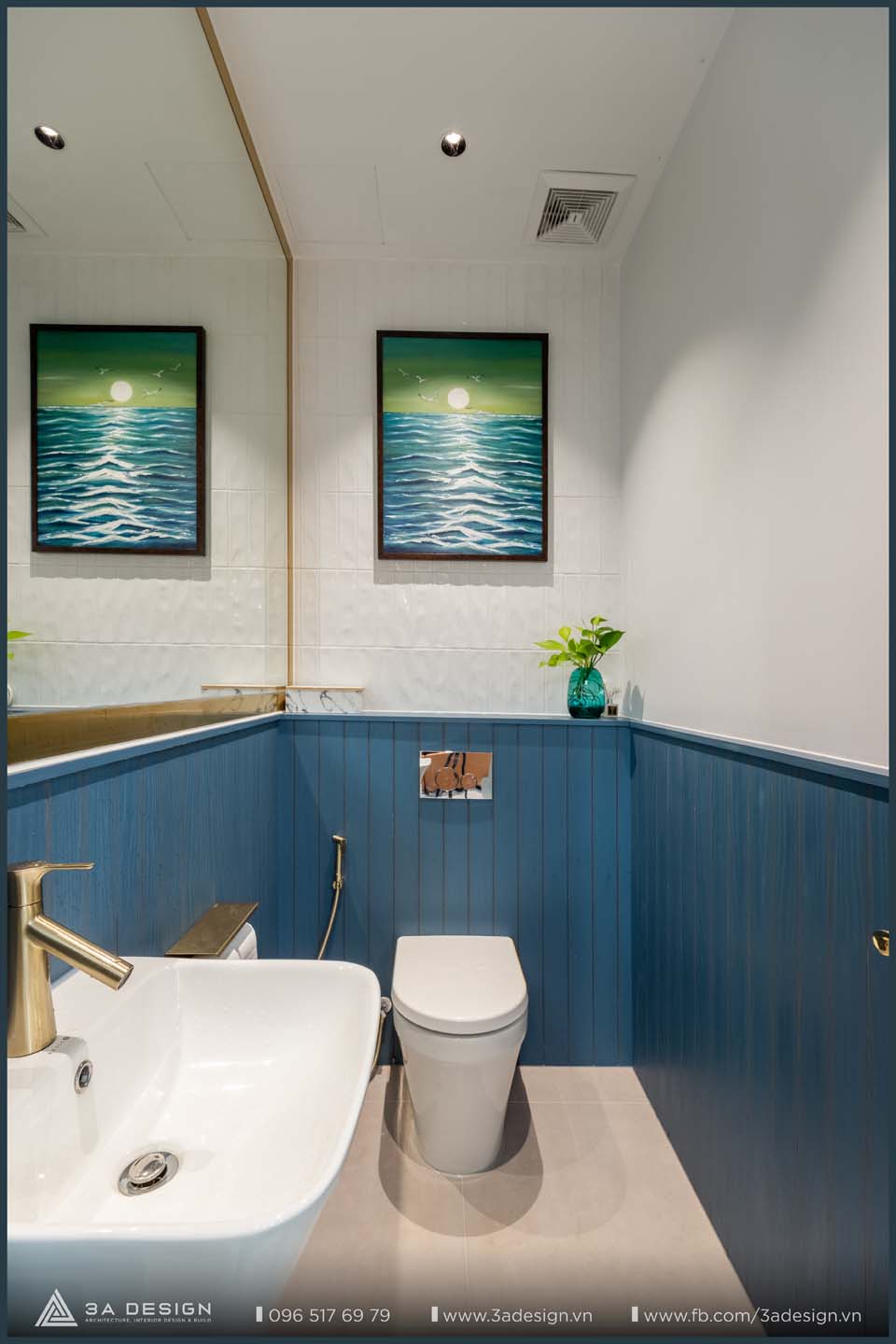 Khu vực phòng tắm và nhà vệ sinh của T Villa được thiết kế với tone màu xanh biển và sử dụng má marble vân mây để tạo nên vẻ đẹp tự nhiên và gần gũi với thiên nhiên. Điều này giúp tạo nên một không gian tắm rất thư giãn và thoải mái cho gia đình.