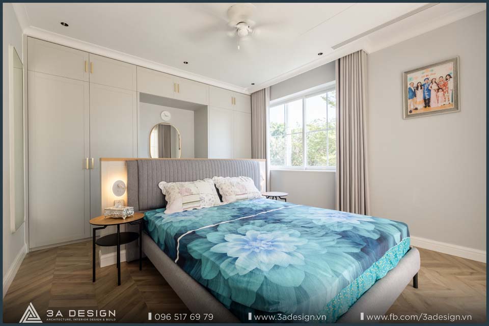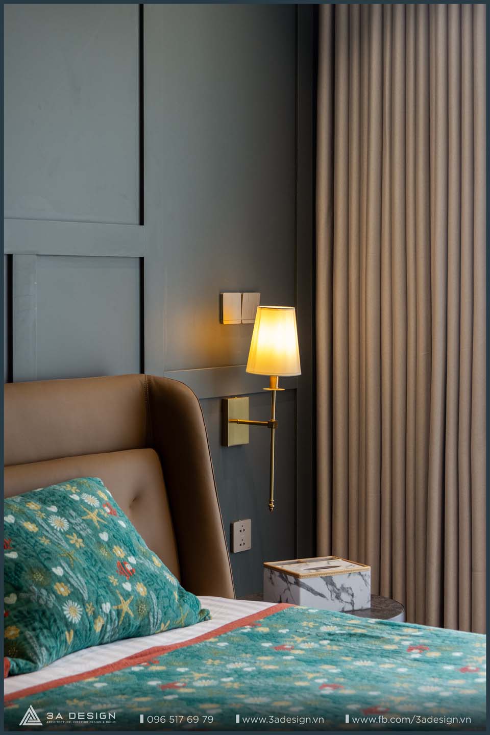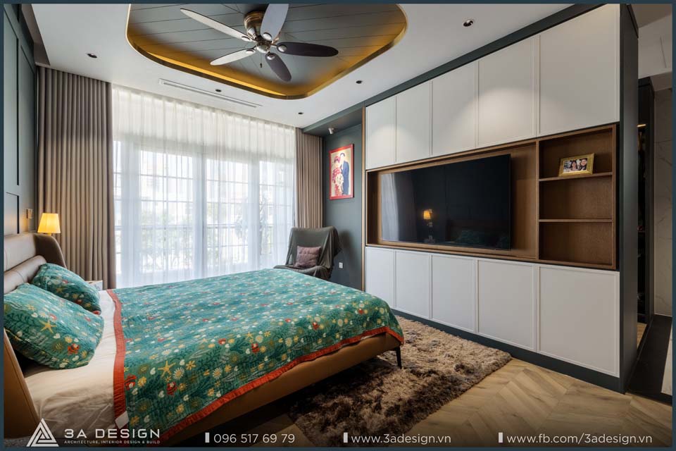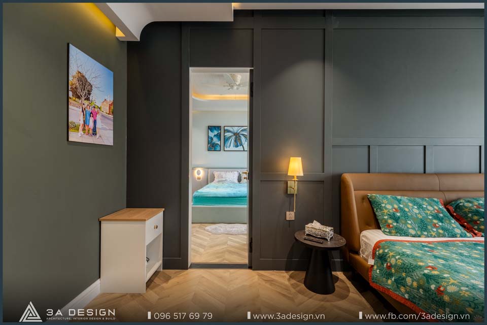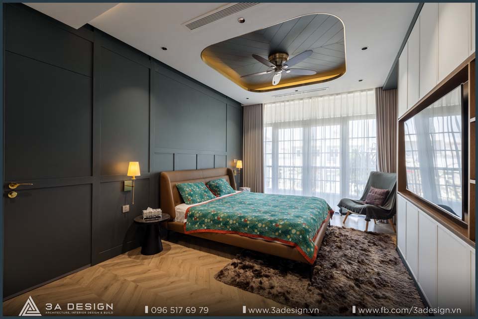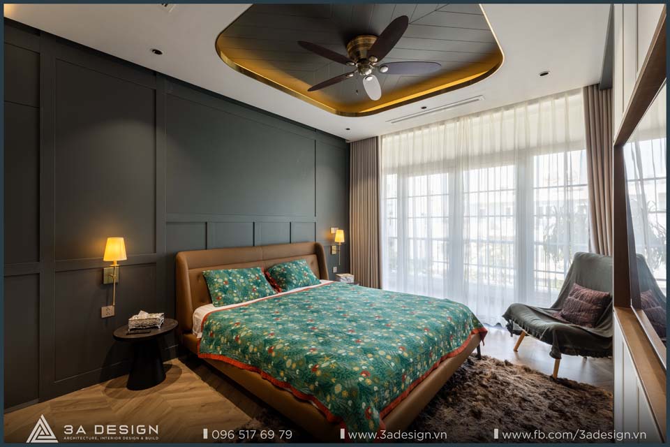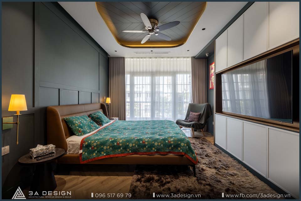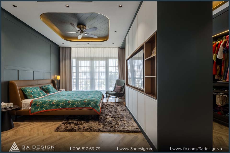 Mỗi không gian phòng ngủ khác nhau đều được trang trí phù hợp với sở thích của mỗi thành viên trong gia đình. Đối với phòng ngủ chính, các KTS đã khéo léo thay đổi một chút về tone màu, không sử dụng tone màu chủ đạo xuyên suốt giống với những không gian khác, mà thay vào đó không gian phòng ngủ Master được sử dụng một tone màu xanh lệch tone đặc biệt hơn so với những không gian khác để tạo sự khác biệt cho không gian riêng của vợ chồng gia chủ. Điểm nhấn của phòng ngủ này là những đường cong phào được sử dụng theo sở thích của gia chủ, kết hợp với vật liệu inox mạ đồng tạo nên những chi tiết tinh tế và đẹp mắt. Không chỉ là nơi để nghỉ ngơi sau một ngày làm việc mệt mỏi, phòng ngủ còn mang lại cho gia đình cảm giác thư thái và yên bình.