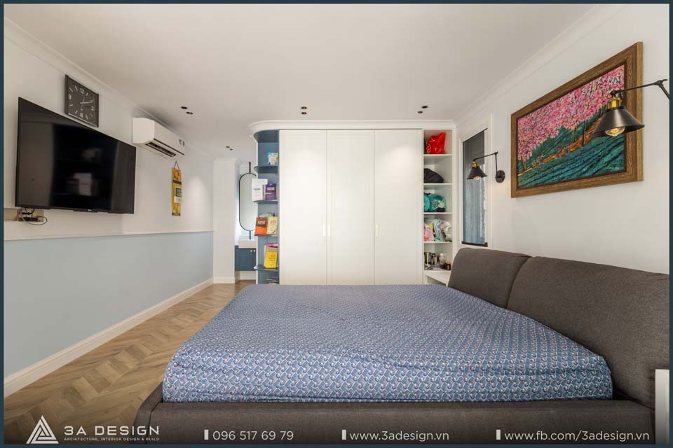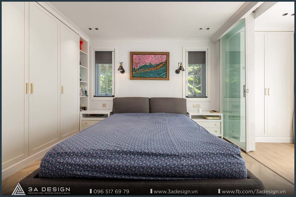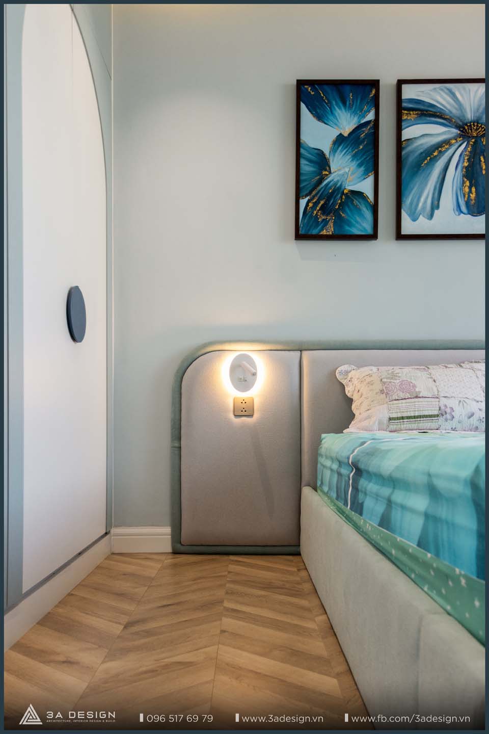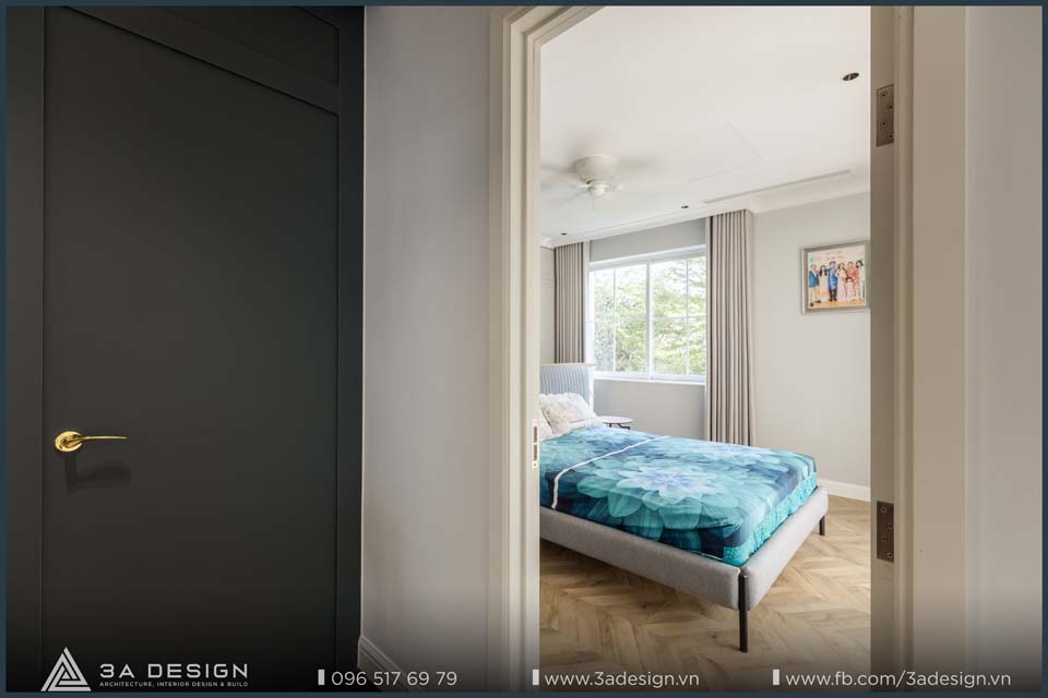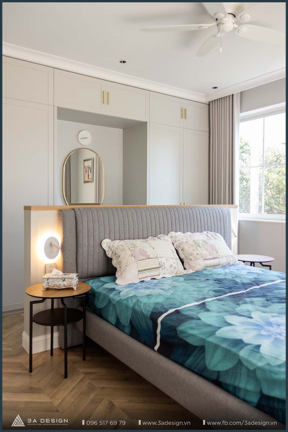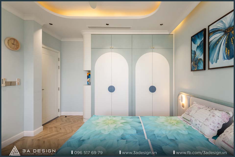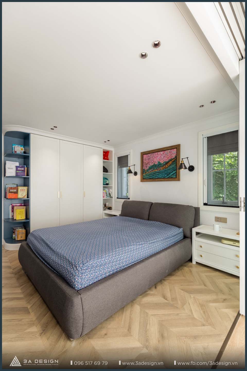 Mỗi không gian phòng ngủ khác nhau đều được trang trí phù hợp với sở thích của mỗi thành viên trong gia đình. Đối với phòng ngủ chính, các KTS đã khéo léo thay đổi một chút về tone màu, không sử dụng tone màu chủ đạo xuyên suốt giống với những không gian khác, mà thay vào đó không gian phòng ngủ Master được sử dụng một tone màu xanh lệch tone đặc biệt hơn so với những không gian khác để tạo sự khác biệt cho không gian riêng của vợ chồng gia chủ. Điểm nhấn của phòng ngủ này là những đường cong phào được sử dụng theo sở thích của gia chủ, kết hợp với vật liệu inox mạ đồng tạo nên những chi tiết tinh tế và đẹp mắt. Không chỉ là nơi để nghỉ ngơi sau một ngày làm việc mệt mỏi, phòng ngủ còn mang lại cho gia đình cảm giác thư thái và yên bình.