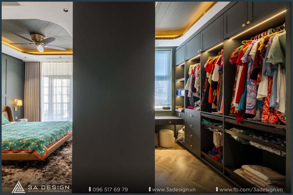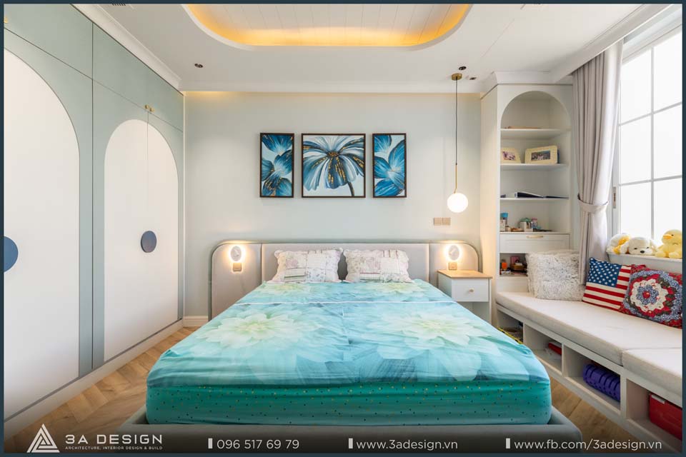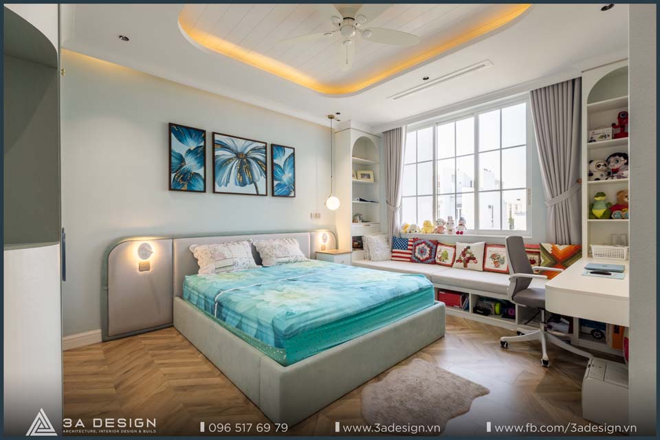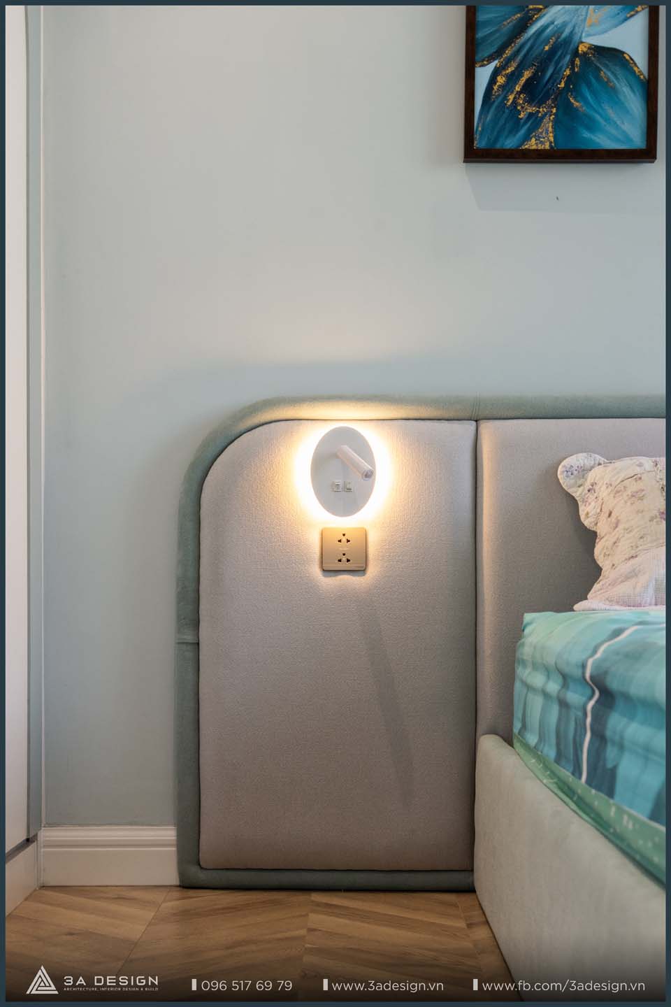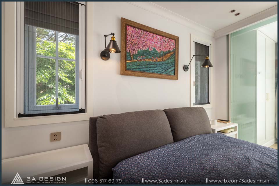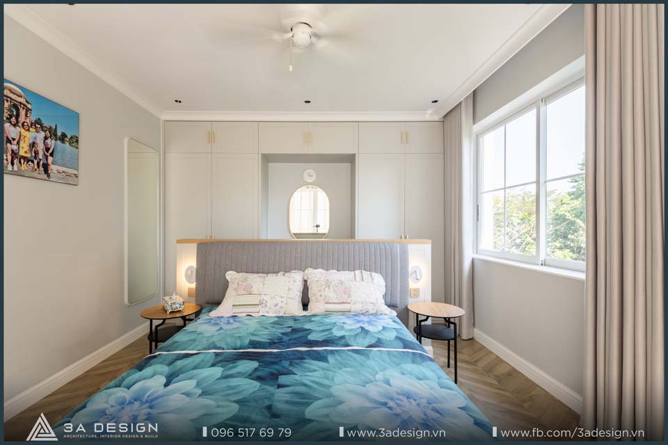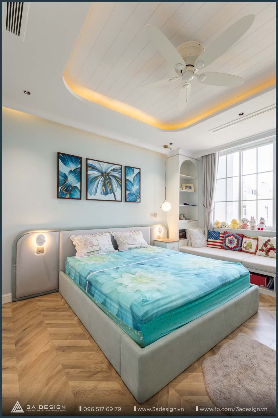 Mỗi không gian phòng ngủ khác nhau đều được trang trí phù hợp với sở thích của mỗi thành viên trong gia đình. Đối với phòng ngủ chính, các KTS đã khéo léo thay đổi một chút về tone màu, không sử dụng tone màu chủ đạo xuyên suốt giống với những không gian khác, mà thay vào đó không gian phòng ngủ Master được sử dụng một tone màu xanh lệch tone đặc biệt hơn so với những không gian khác để tạo sự khác biệt cho không gian riêng của vợ chồng gia chủ. Điểm nhấn của phòng ngủ này là những đường cong phào được sử dụng theo sở thích của gia chủ, kết hợp với vật liệu inox mạ đồng tạo nên những chi tiết tinh tế và đẹp mắt. Không chỉ là nơi để nghỉ ngơi sau một ngày làm việc mệt mỏi, phòng ngủ còn mang lại cho gia đình cảm giác thư thái và yên bình.