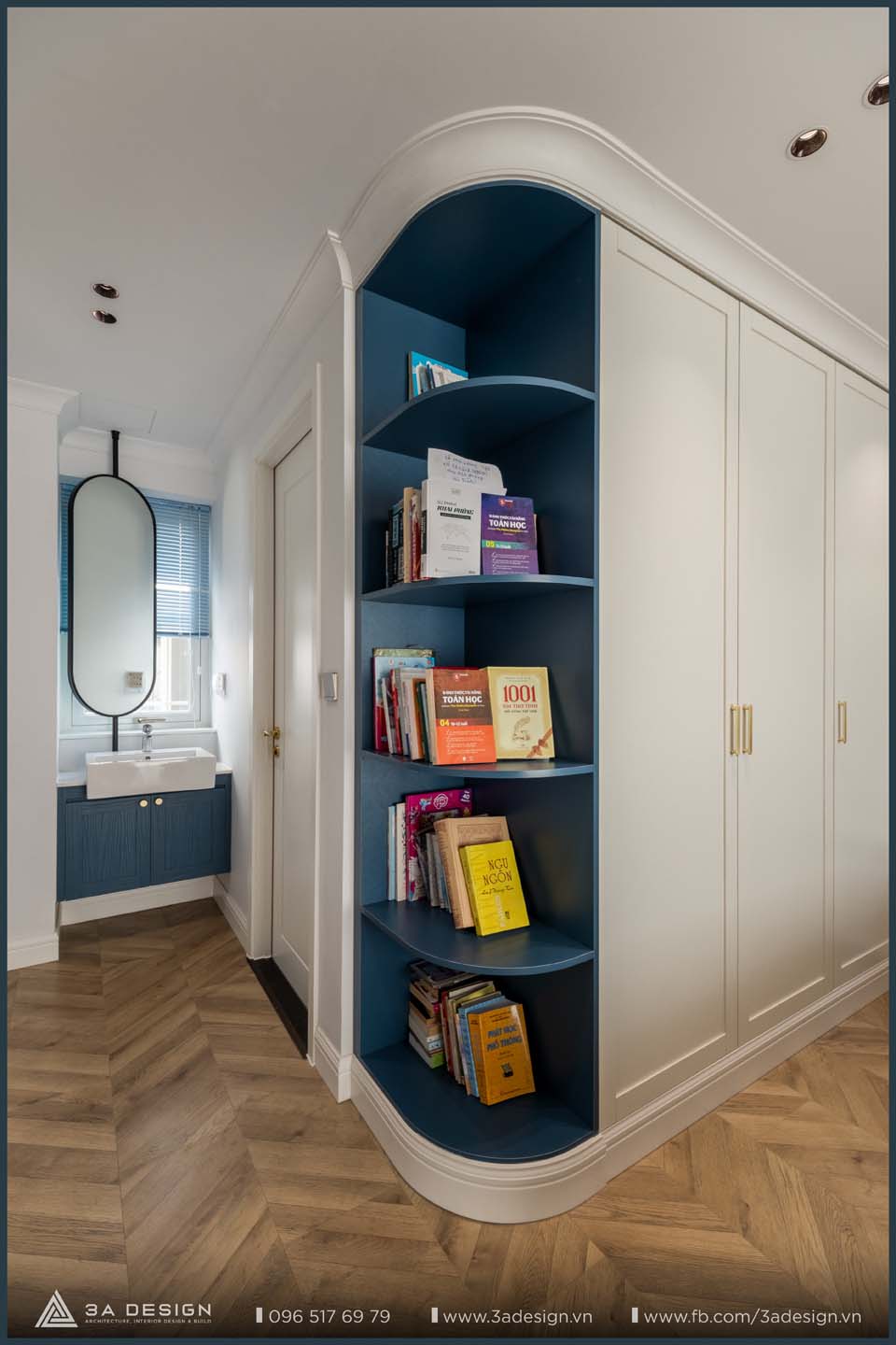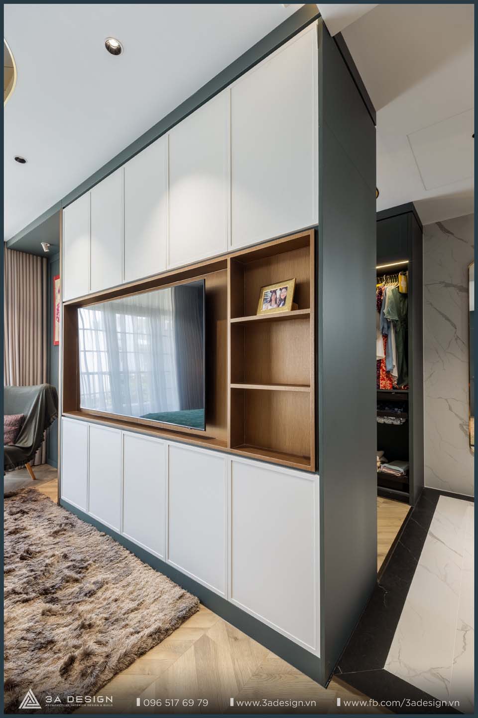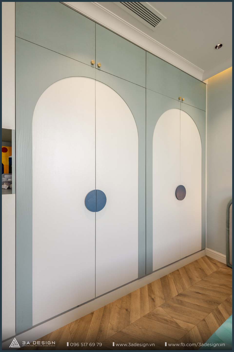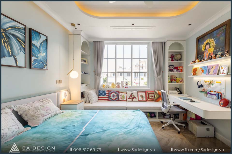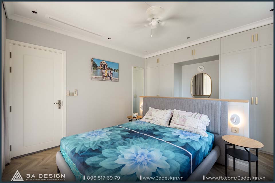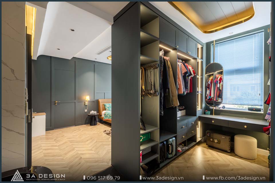 Mỗi không gian phòng ngủ khác nhau đều được trang trí phù hợp với sở thích của mỗi thành viên trong gia đình. Đối với phòng ngủ chính, các KTS đã khéo léo thay đổi một chút về tone màu, không sử dụng tone màu chủ đạo xuyên suốt giống với những không gian khác, mà thay vào đó không gian phòng ngủ Master được sử dụng một tone màu xanh lệch tone đặc biệt hơn so với những không gian khác để tạo sự khác biệt cho không gian riêng của vợ chồng gia chủ. Điểm nhấn của phòng ngủ này là những đường cong phào được sử dụng theo sở thích của gia chủ, kết hợp với vật liệu inox mạ đồng tạo nên những chi tiết tinh tế và đẹp mắt. Không chỉ là nơi để nghỉ ngơi sau một ngày làm việc mệt mỏi, phòng ngủ còn mang lại cho gia đình cảm giác thư thái và yên bình.