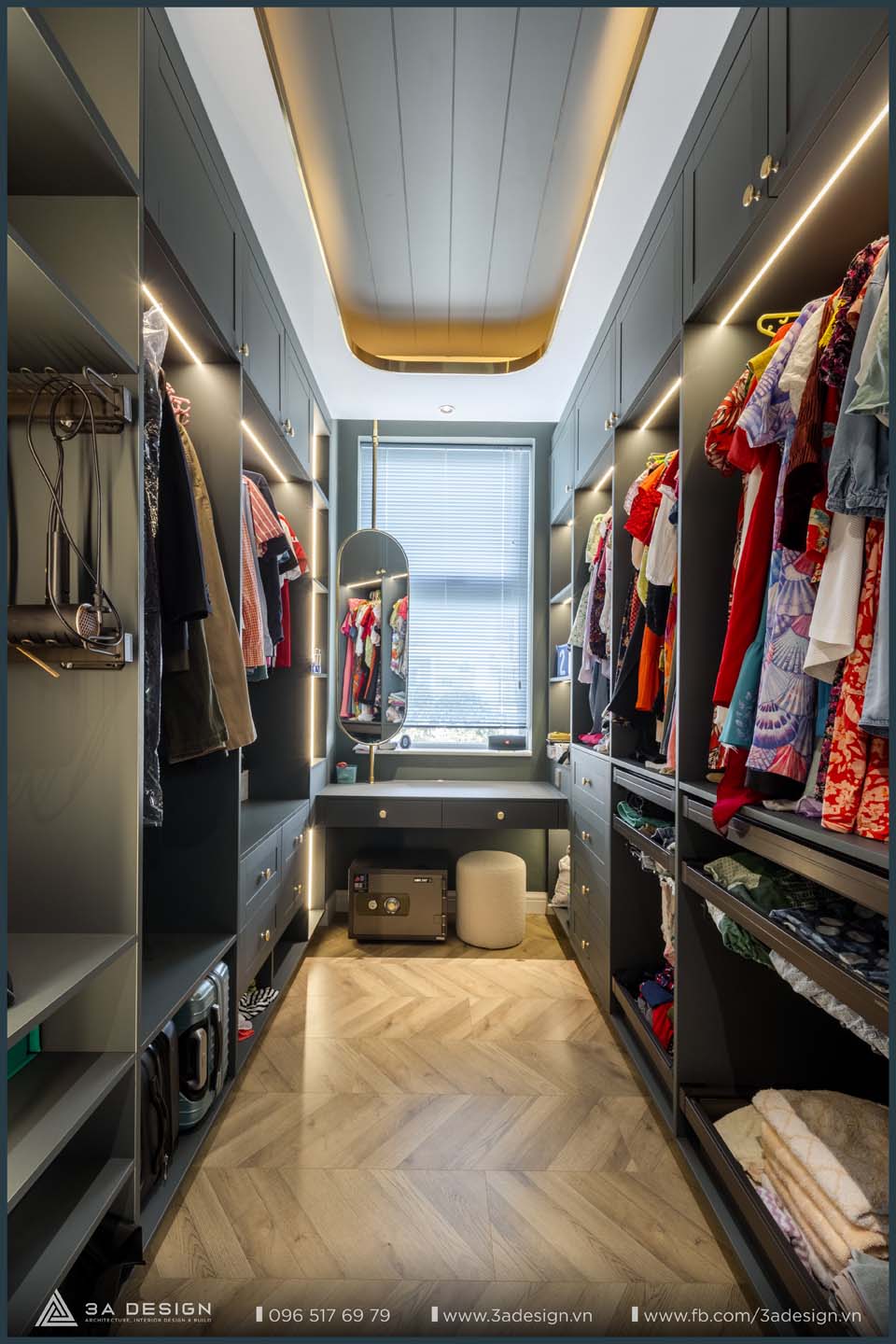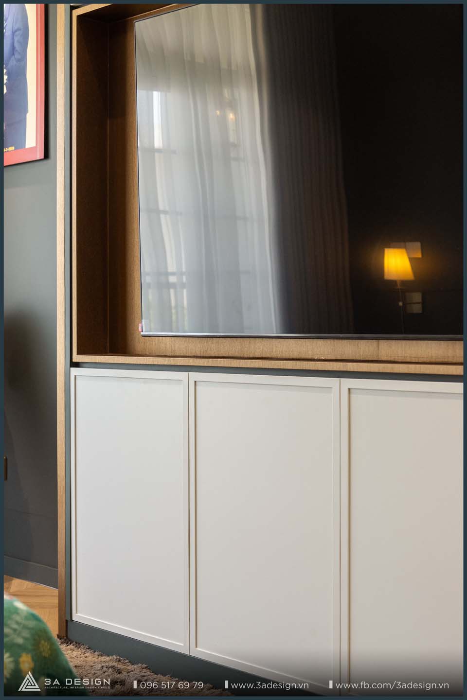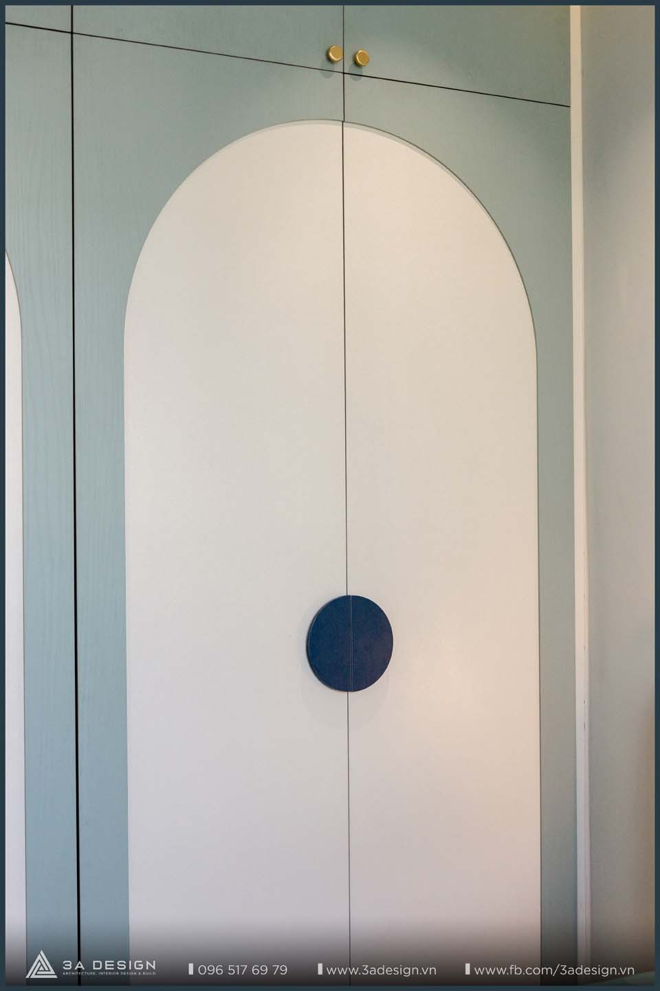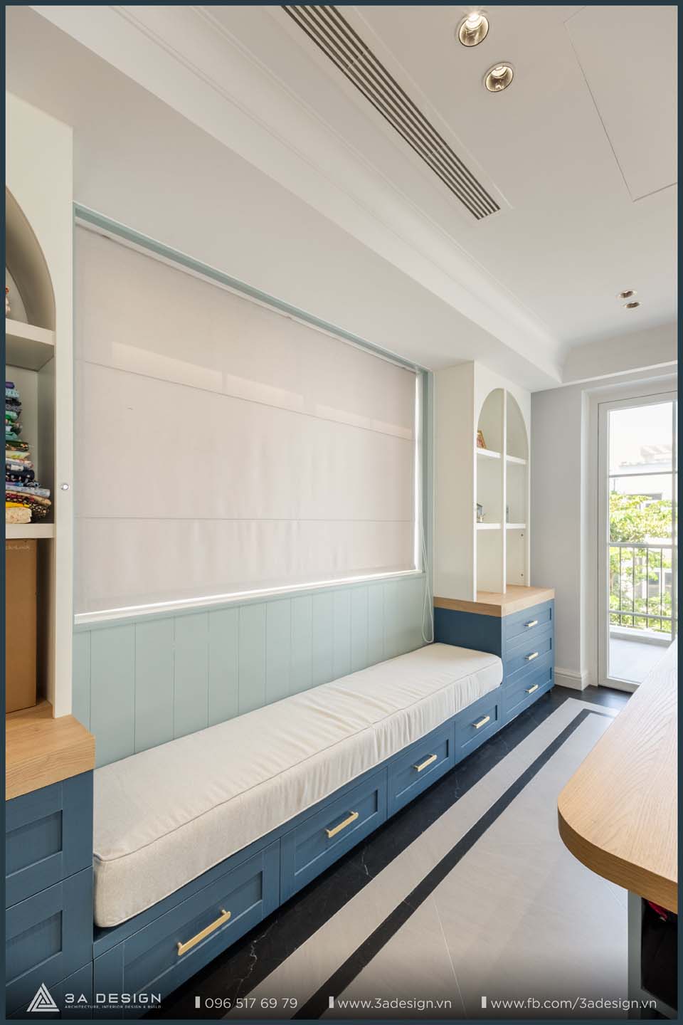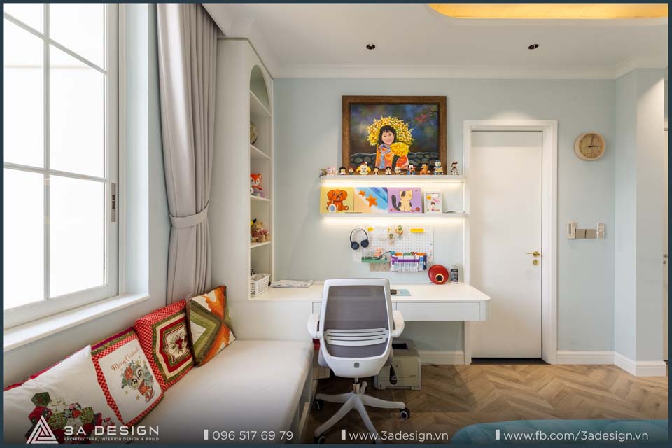 Mỗi không gian phòng ngủ khác nhau đều được trang trí phù hợp với sở thích của mỗi thành viên trong gia đình. Đối với phòng ngủ chính, các KTS đã khéo léo thay đổi một chút về tone màu, không sử dụng tone màu chủ đạo xuyên suốt giống với những không gian khác, mà thay vào đó không gian phòng ngủ Master được sử dụng một tone màu xanh lệch tone đặc biệt hơn so với những không gian khác để tạo sự khác biệt cho không gian riêng của vợ chồng gia chủ. Điểm nhấn của phòng ngủ này là những đường cong phào được sử dụng theo sở thích của gia chủ, kết hợp với vật liệu inox mạ đồng tạo nên những chi tiết tinh tế và đẹp mắt. Không chỉ là nơi để nghỉ ngơi sau một ngày làm việc mệt mỏi, phòng ngủ còn mang lại cho gia đình cảm giác thư thái và yên bình.