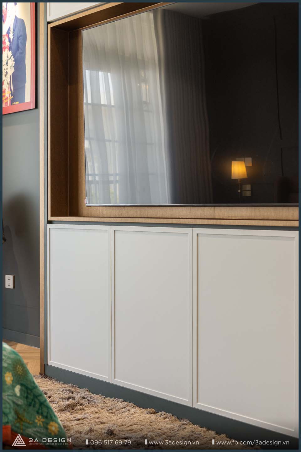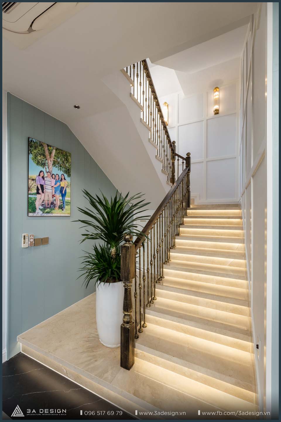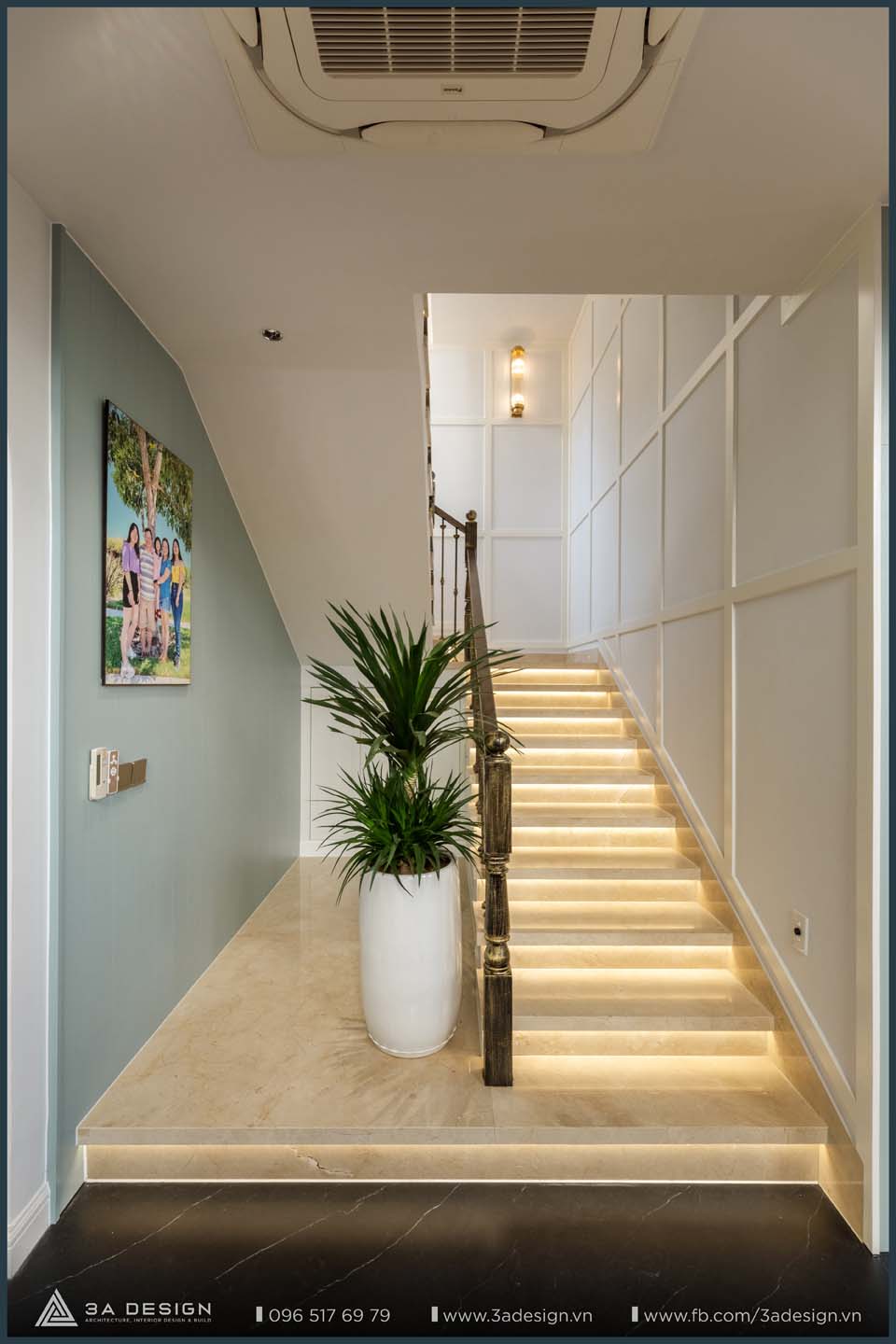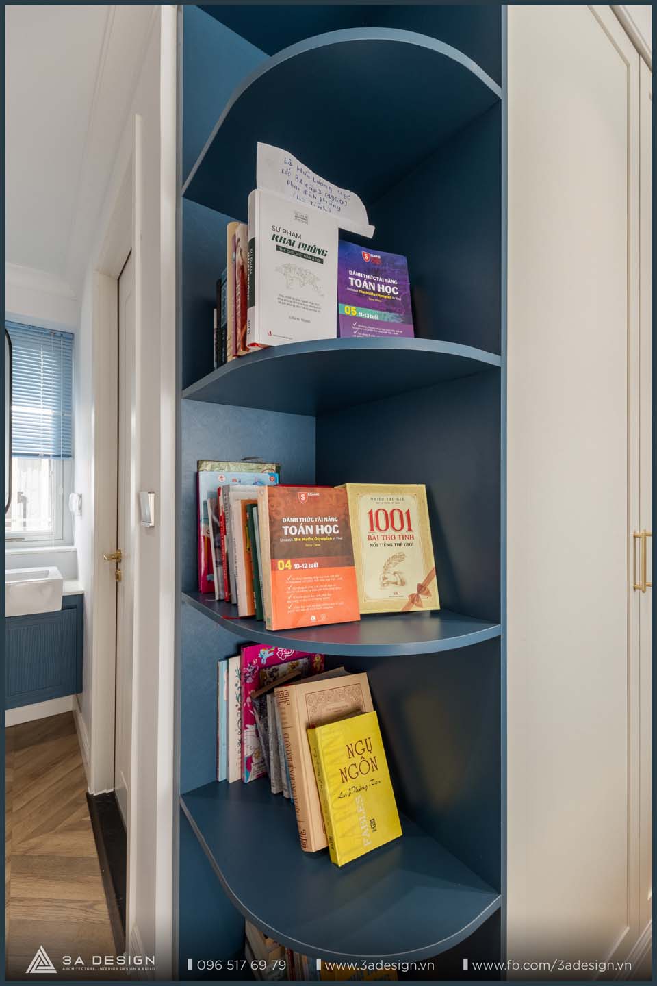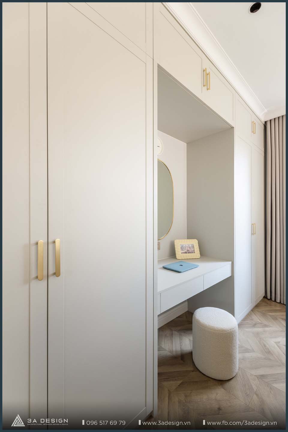 Mỗi không gian phòng ngủ khác nhau đều được trang trí phù hợp với sở thích của mỗi thành viên trong gia đình. Đối với phòng ngủ chính, các KTS đã khéo léo thay đổi một chút về tone màu, không sử dụng tone màu chủ đạo xuyên suốt giống với những không gian khác, mà thay vào đó không gian phòng ngủ Master được sử dụng một tone màu xanh lệch tone đặc biệt hơn so với những không gian khác để tạo sự khác biệt cho không gian riêng của vợ chồng gia chủ. Điểm nhấn của phòng ngủ này là những đường cong phào được sử dụng theo sở thích của gia chủ, kết hợp với vật liệu inox mạ đồng tạo nên những chi tiết tinh tế và đẹp mắt. Không chỉ là nơi để nghỉ ngơi sau một ngày làm việc mệt mỏi, phòng ngủ còn mang lại cho gia đình cảm giác thư thái và yên bình.