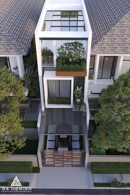 Các đường nét bên ngoài vuông vức tạo thành một khối chắc chắn thêm vào đó là những mảng màu xanh của cây được đan xen với nhau, tạo vẻ ngoài của ngôi nhà trở nên bắt mắt hơn bao giờ hết.
