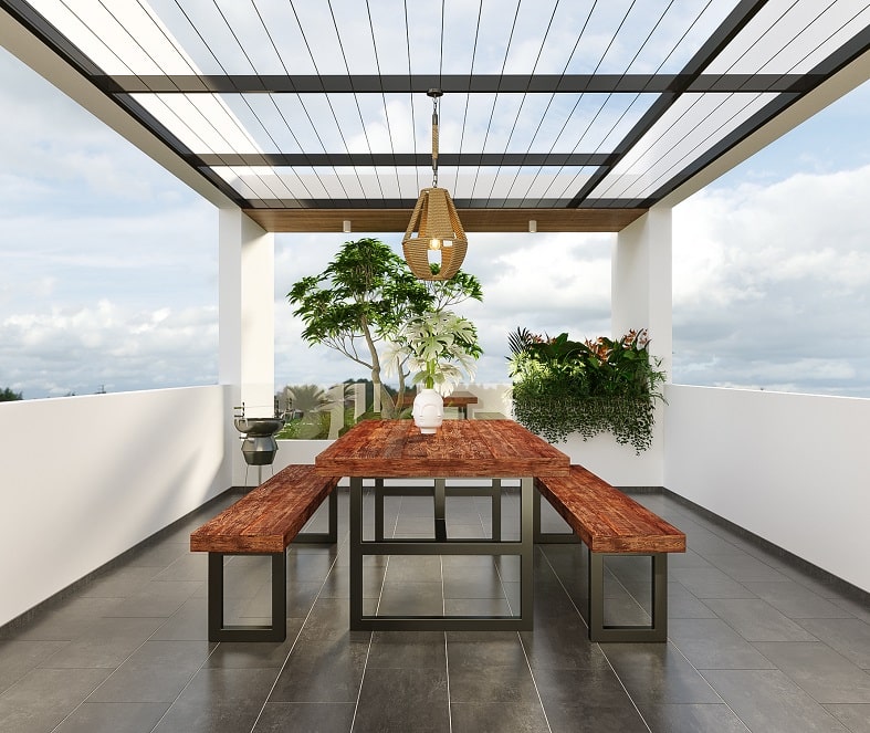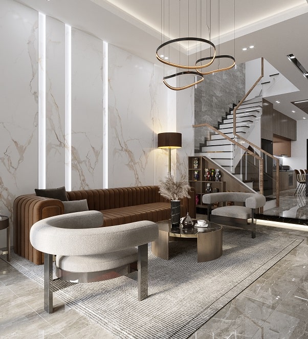 Thiết kế kiến trúc và nội thất nhà phố tại Long An theo phong cách Tropical và xen lẫn nét hiện đại.