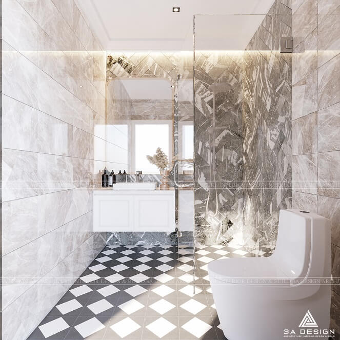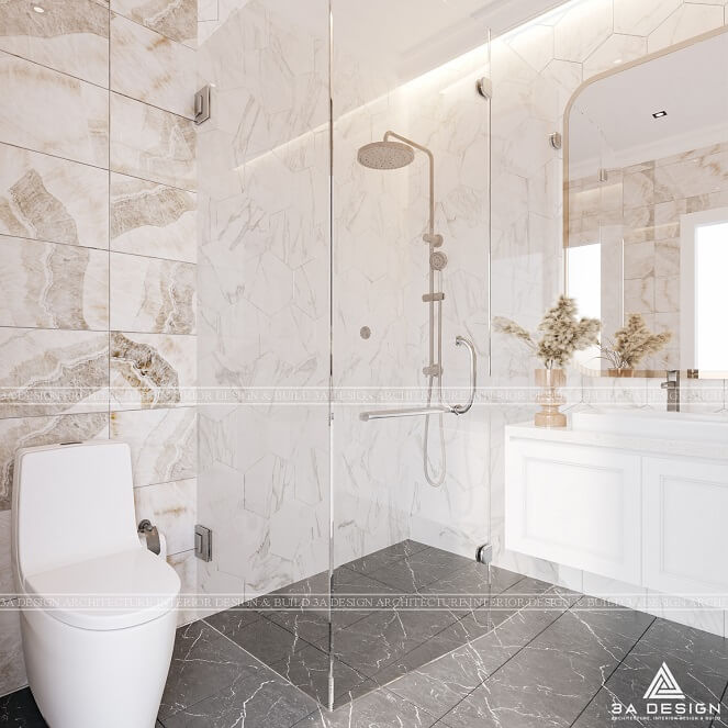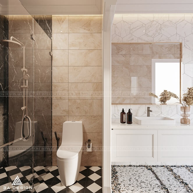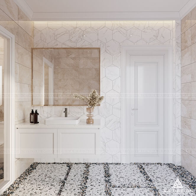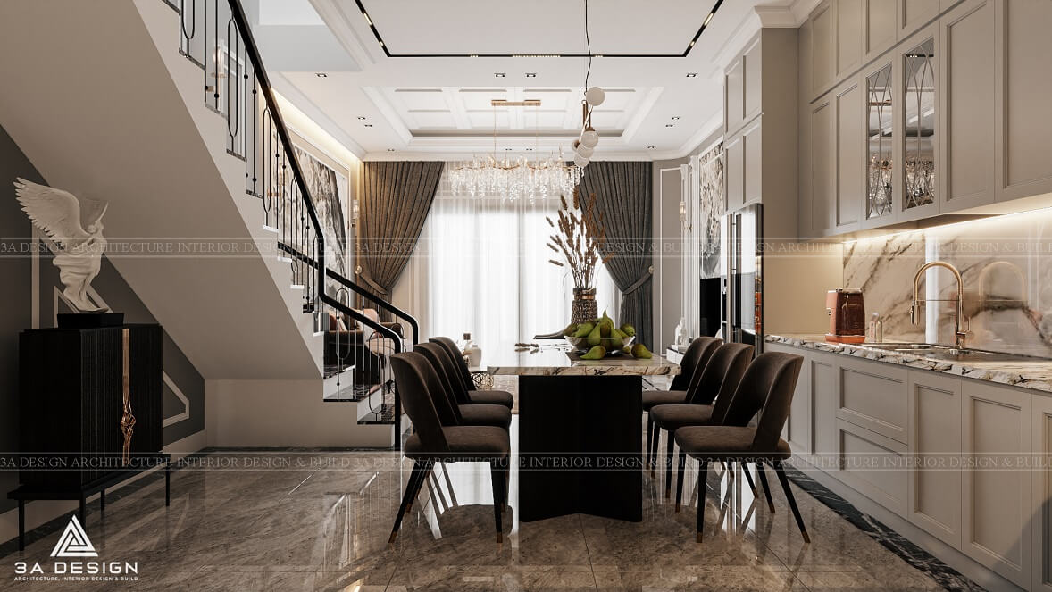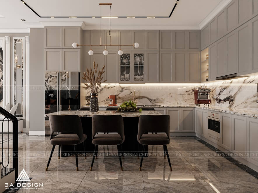 Bếp và phòng ăn được thiết kế với tông màu trắng sáng, tạo nên sự tươi mới và trong lành. Bàn ăn và ghế ăn có thiết kế cổ điển với bàn vân đá và ghế , kết hợp với các chi tiết trang trí như bức tranh hoặc gương trang điểm tạo nên không gian ấm áp và lịch lãm cho bữa ăn gia đình.