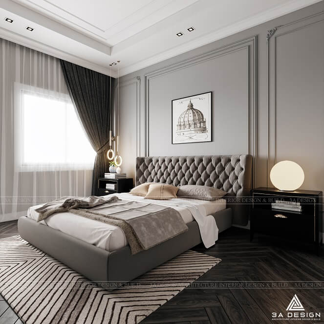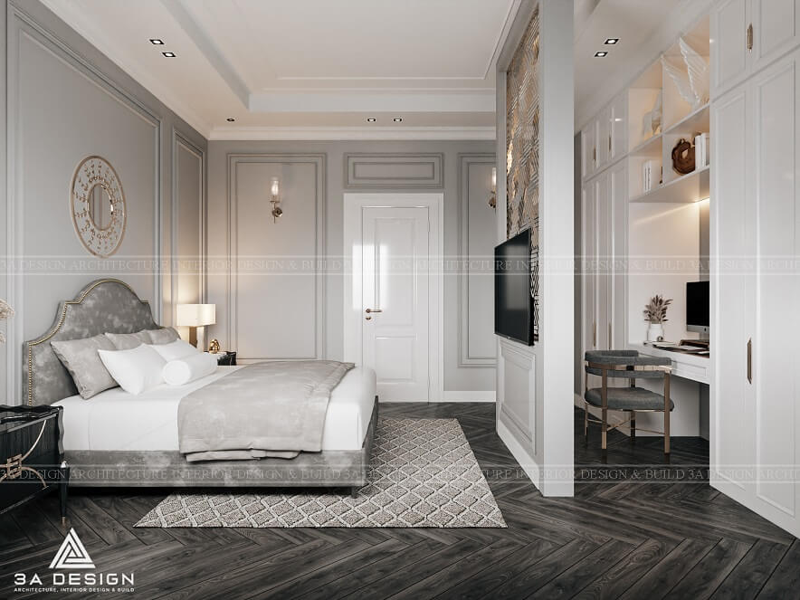 Trong phòng ngủ, màu trắng tạo cảm giác yên bình và thư giãn. Giường ngủ với đầu giường hoặc đầu giường gỗ tạo điểm nhấn trong căn phòng. Tủ quần áo và tủ trang điểm có kiểu dáng tân cổ điển giúp tối ưu hóa không gian lưu trữ và tạo sự thanh lị cho phòng ngủ.