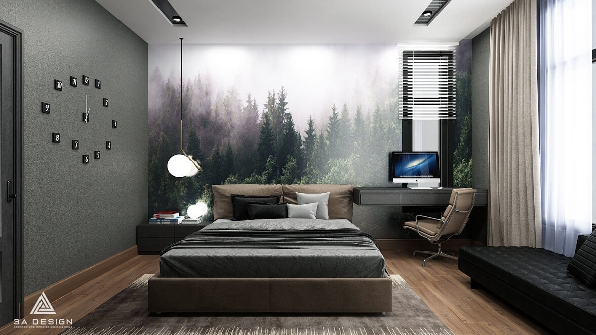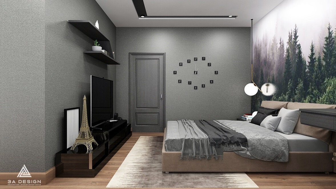 Khi bước vào phòng ngủ, bạn sẽ bị cuốn hút bởi sự ấm áp và thân thiện của nền gạch giả gỗ. Màu sắc ấm áp này tạo ra không gian thư giãn và thoải mái, tạo điều kiện tốt cho giấc ngủ đêm tốt lành. Giường ngủ được thiết kế với đầu giường màu đen hoặc xám, tạo nên sự đối lập độc đáo và tạo điểm nhấn cho không gian. Ngoài ra, các chi tiết trang trí như đèn trần, tấm tranh treo tường hay thảm trải sàn, cũng đều mang sắc màu đen và xám, tạo nên sự nhất quán và ấn tượng cho phòng ngủ này.