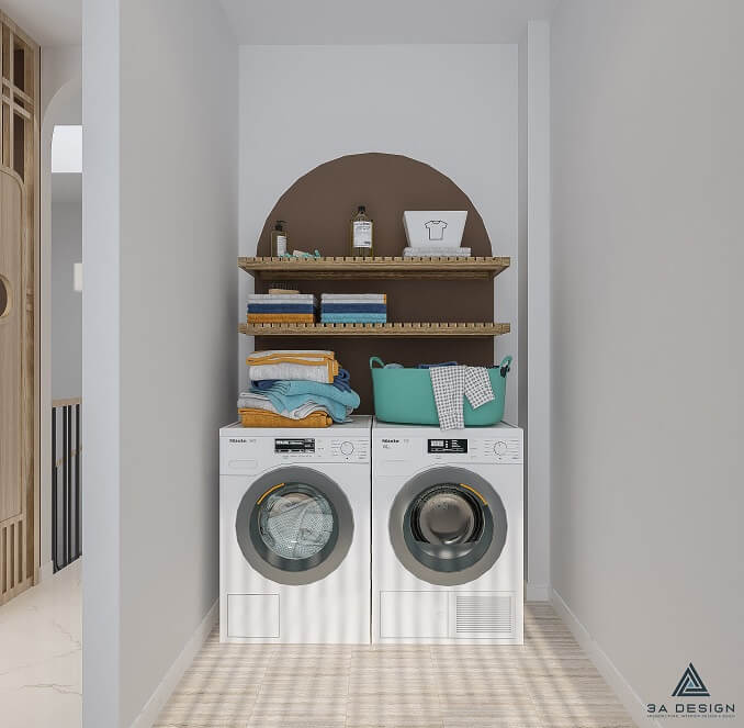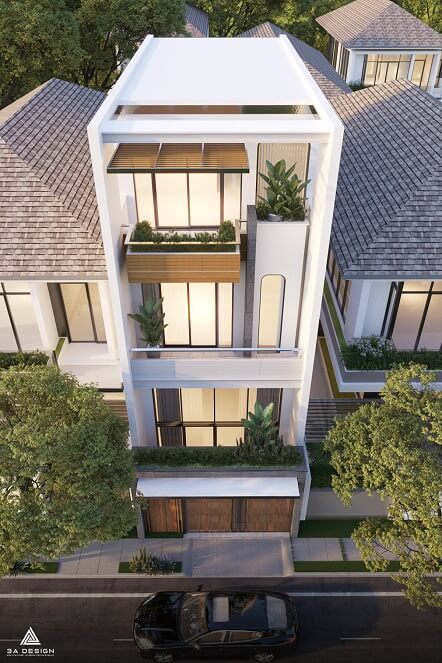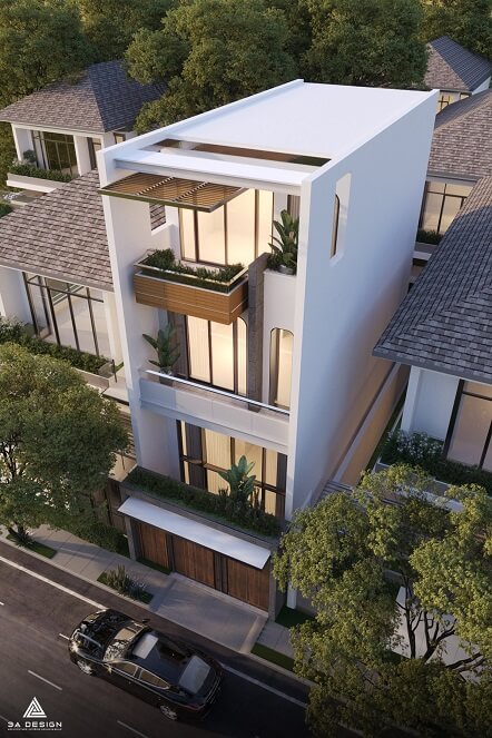 Tầng trệt (Tầng 1): Gara xe + kho, bếp và bàn ăn, wc, sân sau.
