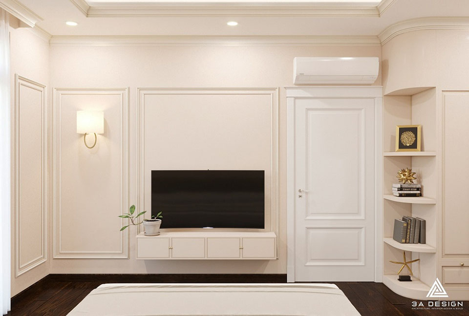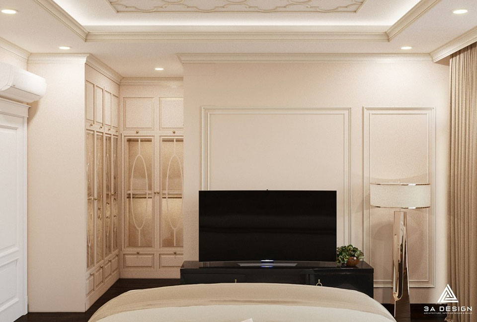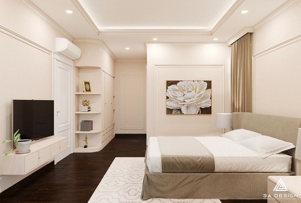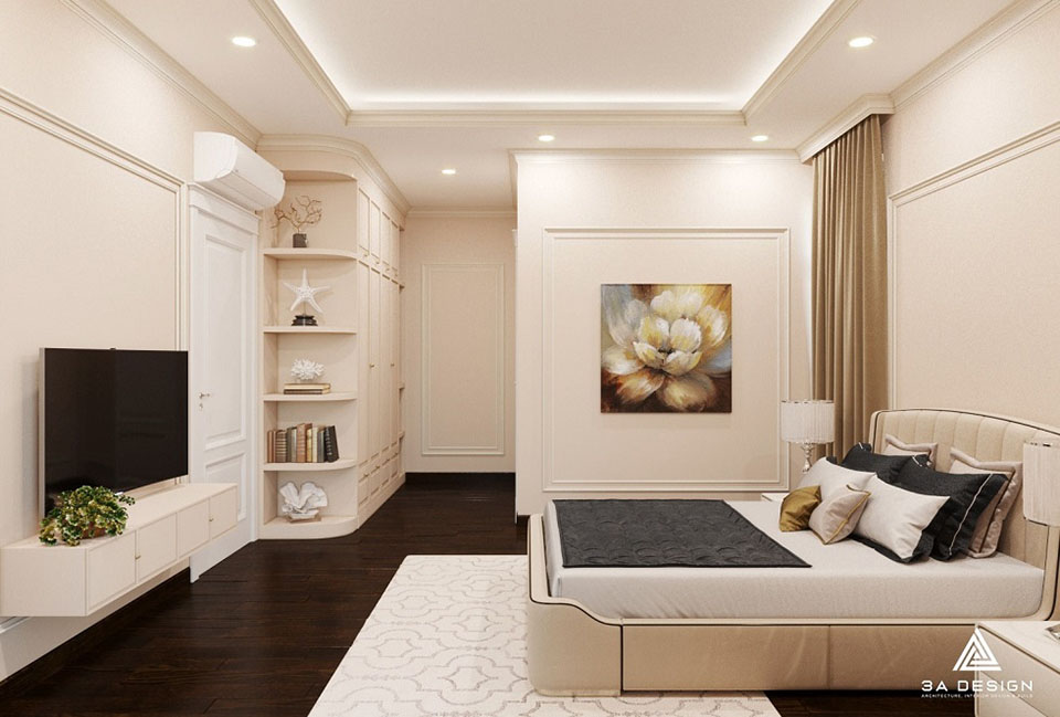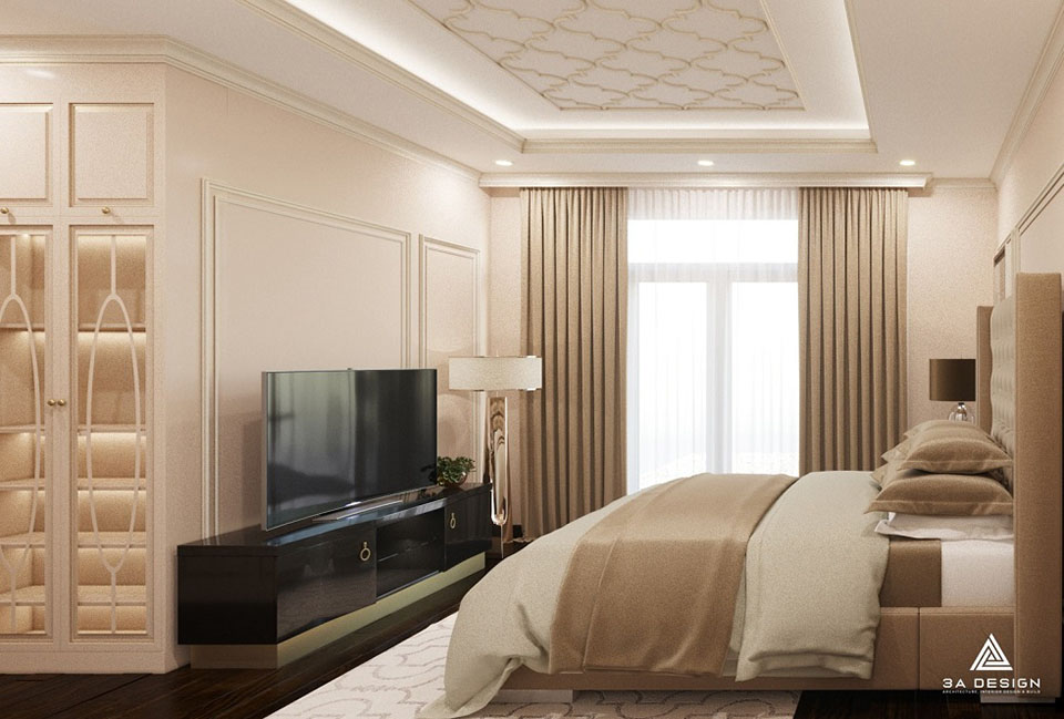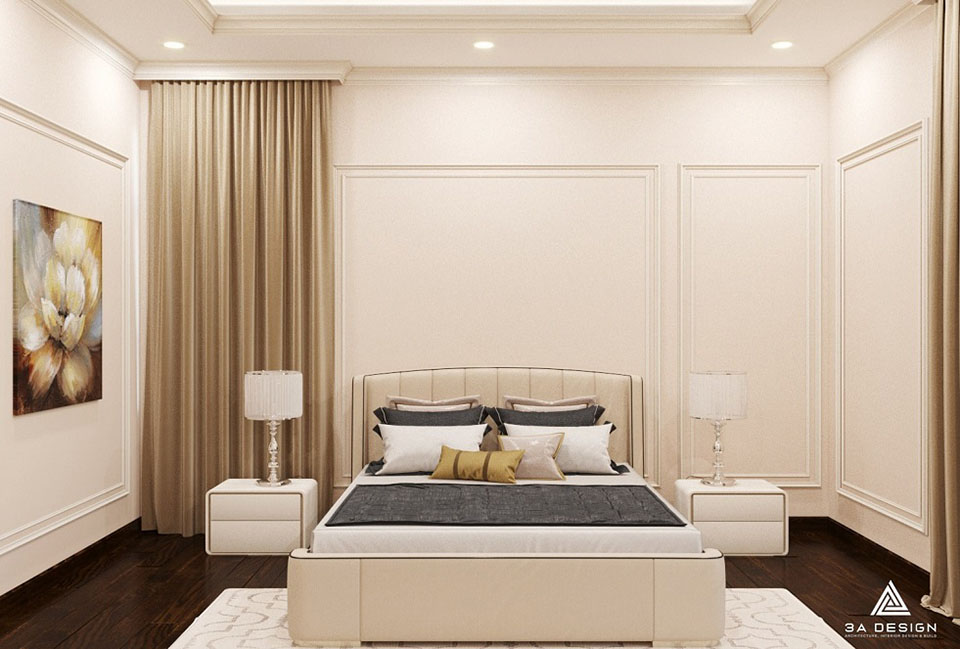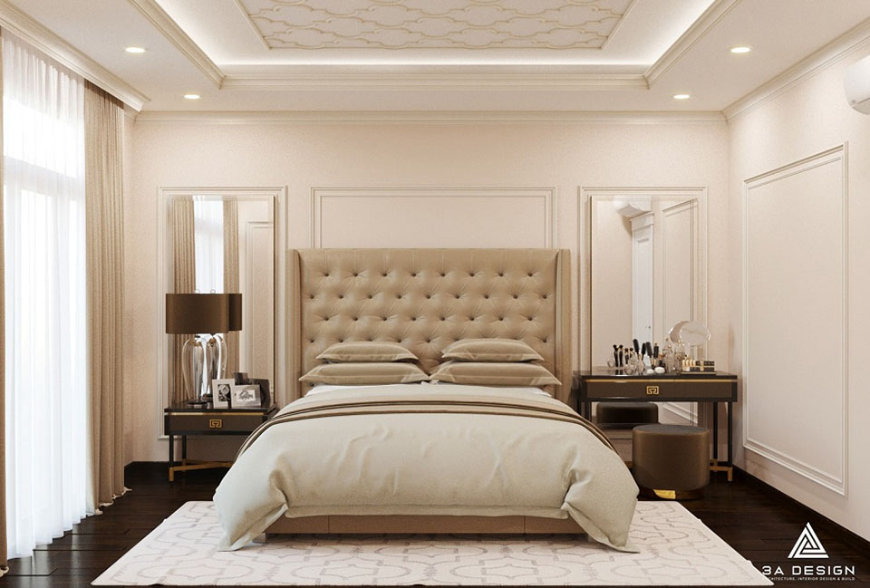 Phòng ngủ tân cổ điển thường mang đến sự thư giãn với giường ngủ sang trọng, drap và rèm cửa cổ điển. Đèn ngủ và các chi tiết trang trí như gương trang điểm và bàn trang điểm thể hiện vị thế và phong cách riêng biệt của gia chủ.
