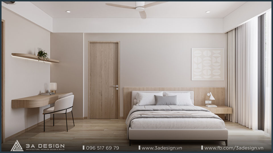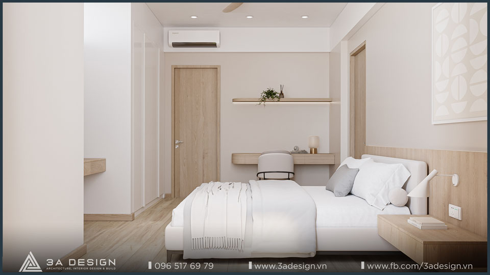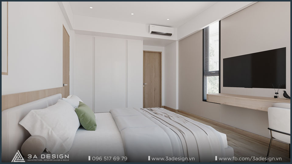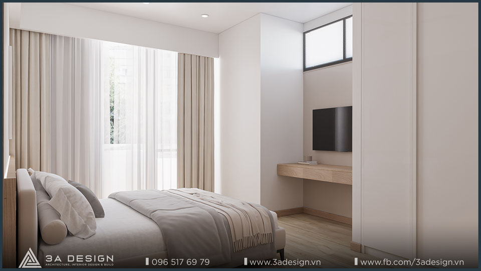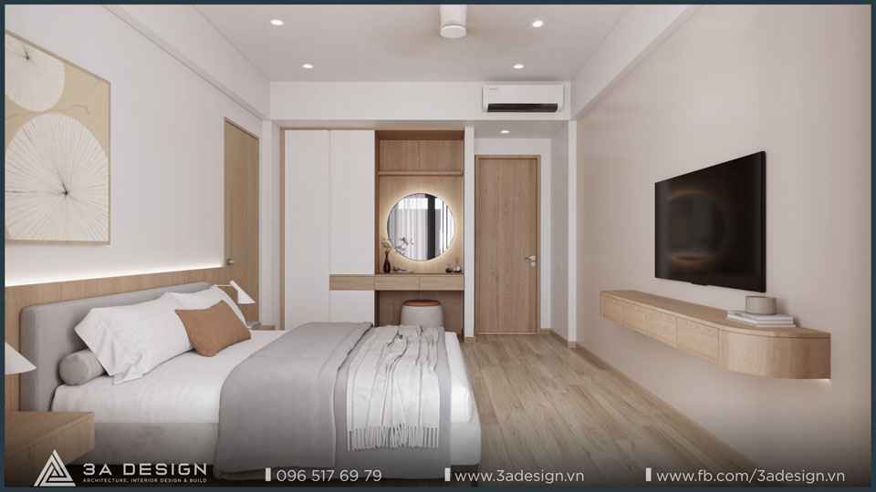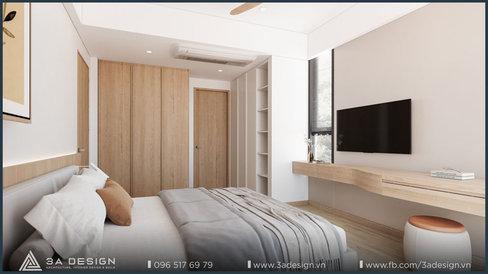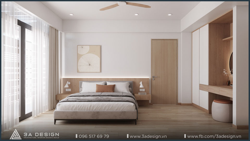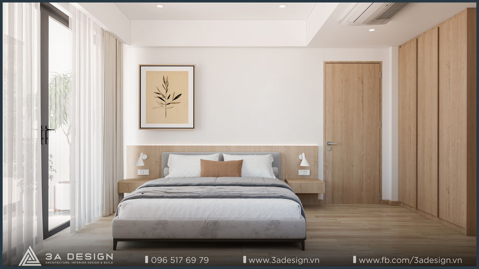 Nội thất phòng ngủ vẫn hướng đến sự đơn giản trong bài trí và lựa chọn các sản phẩm nội thất, không quá cầu kỳ nhưng vẫn đảm bảo tiện nghi và tính thẩm mỹ cho không gian. Thiết kế sử dụng Panel gỗ được hắt Led và tranh nhấn điều này giúp tạo nên một không gian thư giản thoải mái và ấm áp.