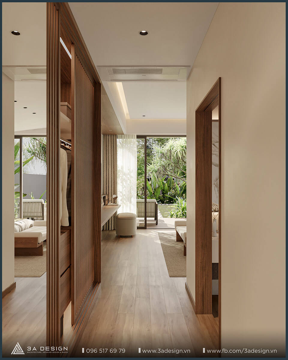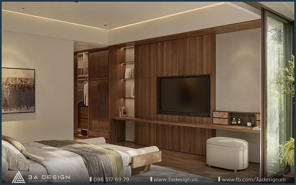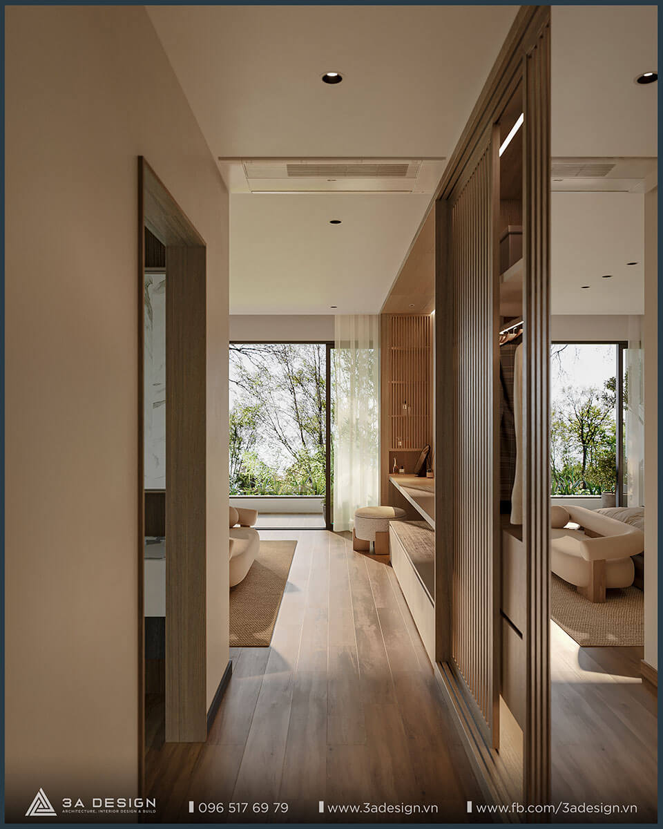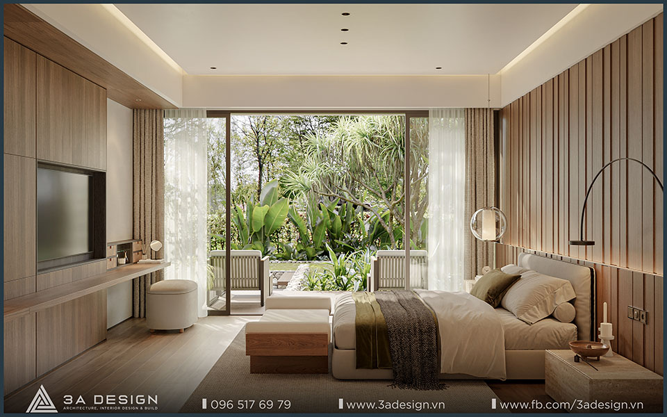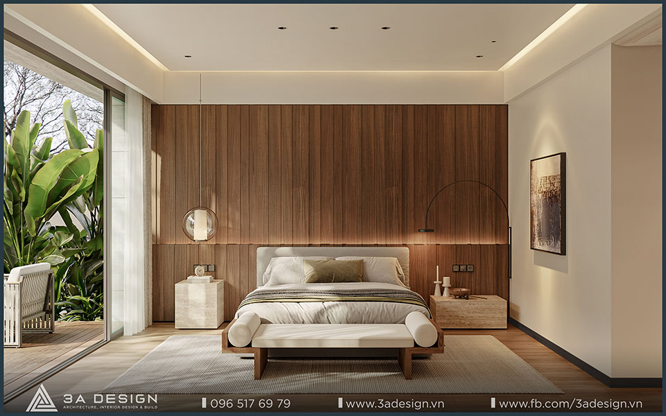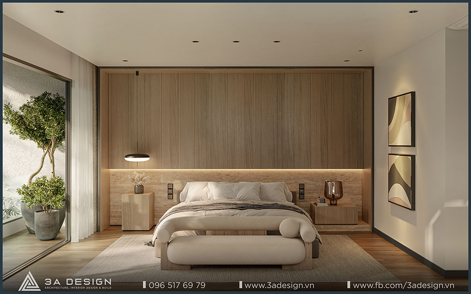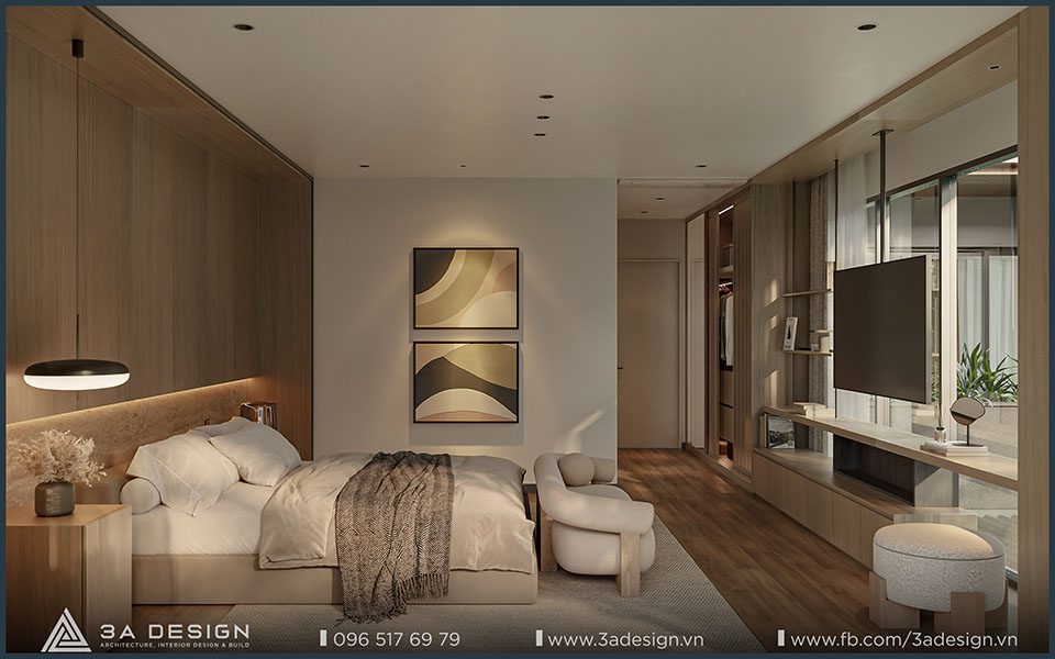 Thiết kế nội thất không gian phòng ngủ tạo nên cảm giác ấm cúng và tinh tế với diện tích rộng rãi, cửa sổ lớn đón ánh sáng tự nhiên.