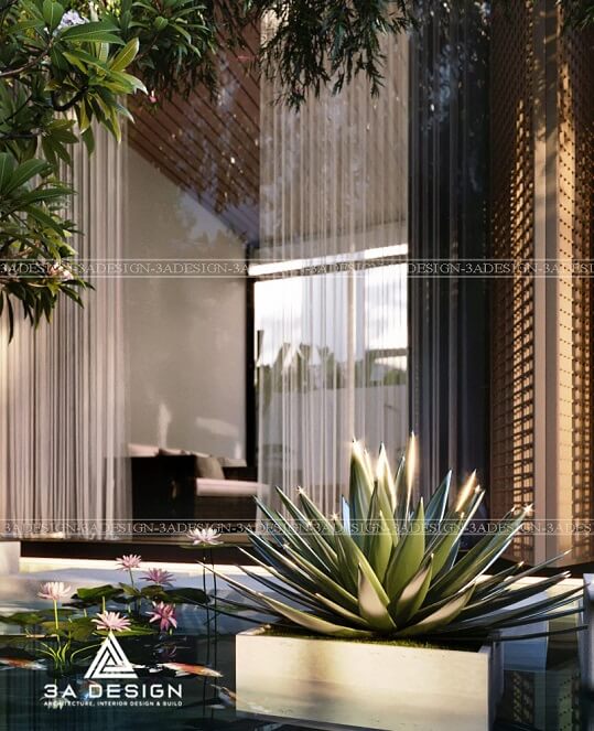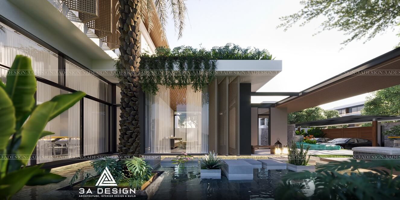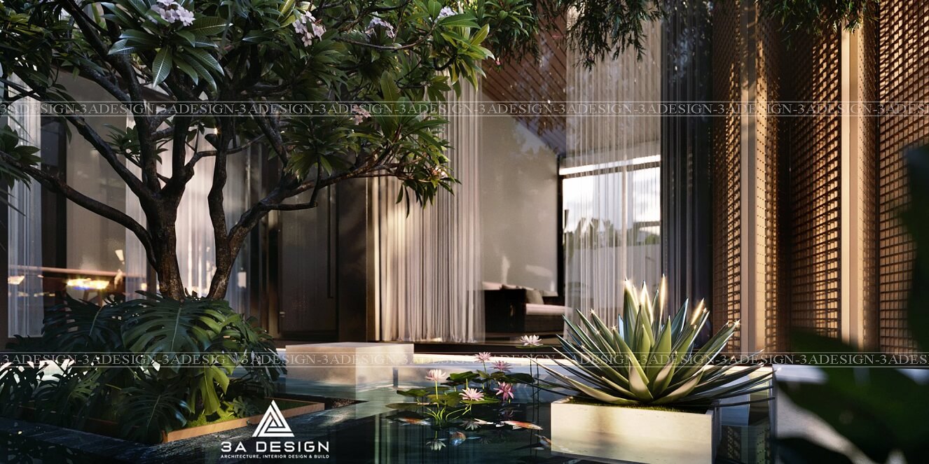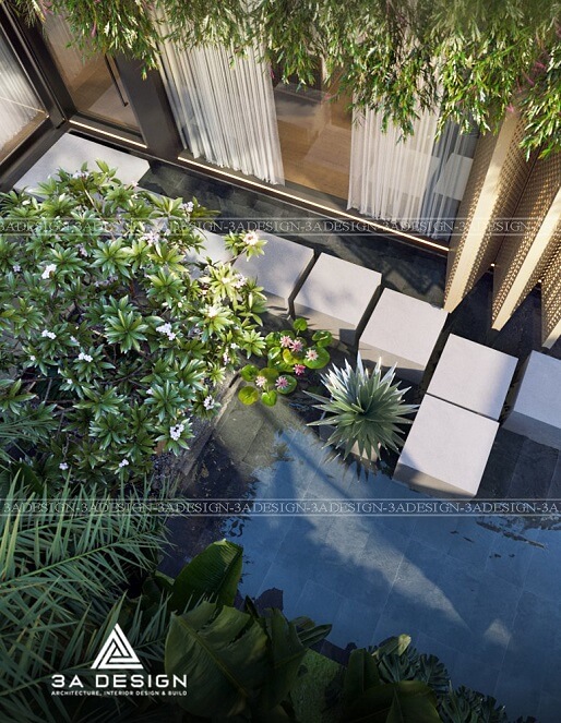 Điểm nhấn nổi bật của phần sân vườn là hồ nước được thiết kế cách điệu đầy tinh tế bao bọc bởi cây xanh. Tạo địa thế phong thủy “tựa sơn – hướng thủy” mang đến vượng khí cho gia chủ. Sân vườn không chỉ là nơi sinh hoạt chung của các thành viên trong gia đình. Mà còn là điểm hẹn lý tưởng cho những buổi tiệc nướng ngoài trời cùng người thân và bạn bè, có sức chứa lên đến 20 người.