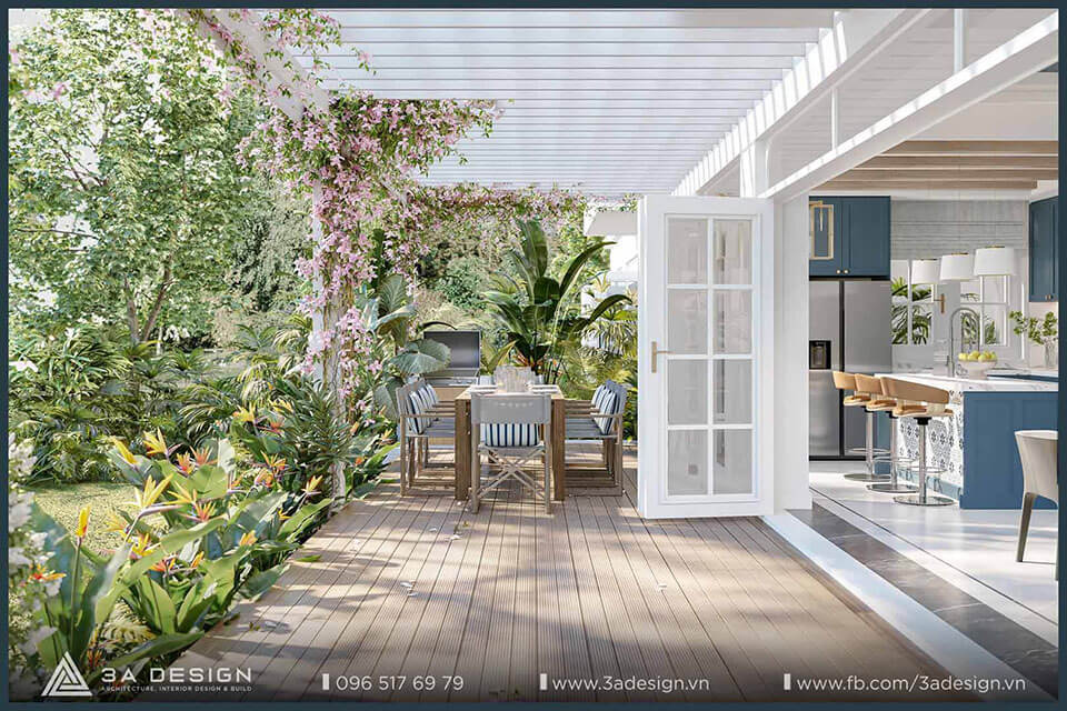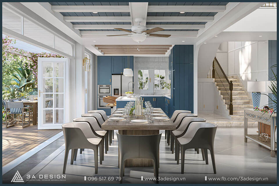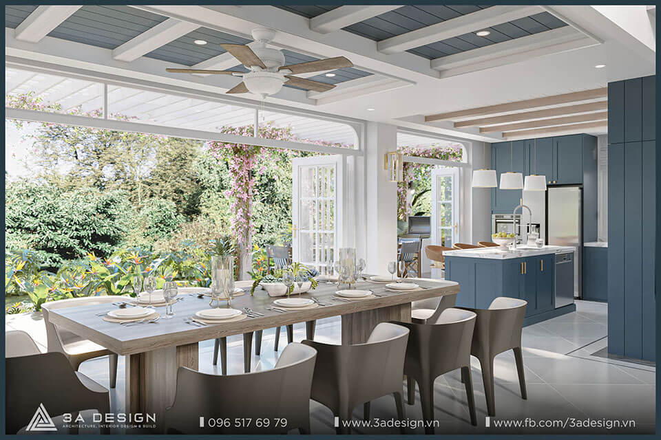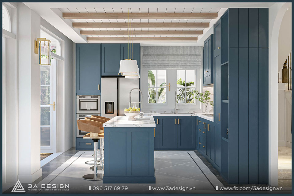 Tone màu trắng kết hợp với màu nhấn chủ đạo xanh biển tạo ra một không gian gần gũi và sang trọng. Khu vực bếp được các KTS 3A Design thiết kế kết nối với không gian vườn phía sau. Việc phá bỏ bức tường ngăn cách phía sau nhà giúp cho khu vực bếp giờ đây trở nên rộng rãi và thông thoáng hơn bao giờ hết.