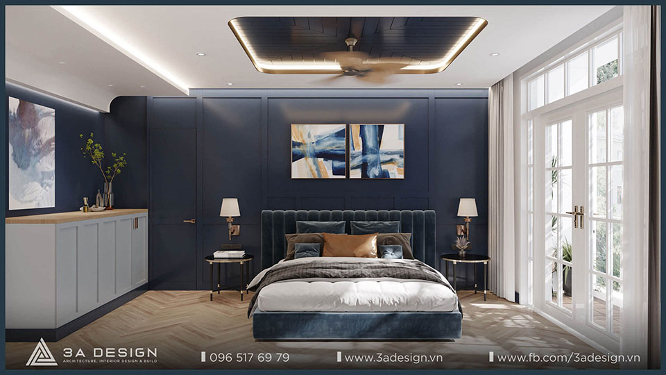 Phòng master của T Villa có tone màu xanh đậm hơn những không gian khác, tạo nên một không gian riêng tư và ấm cúng cho chủ nhà. Với điểm nhấn là những đường cong phào chỉ được sử dụng theo sở thích của gia chủ, kết hợp với vật liệu inox mạ đồng tạo nên những chi tiết tinh tế và đẹp mắt.