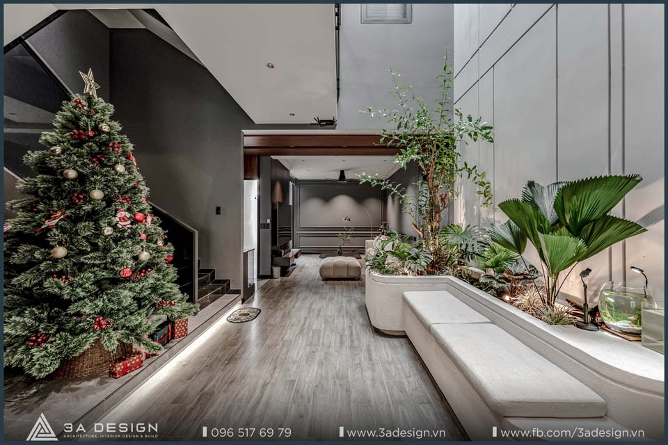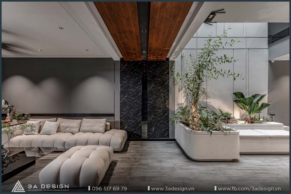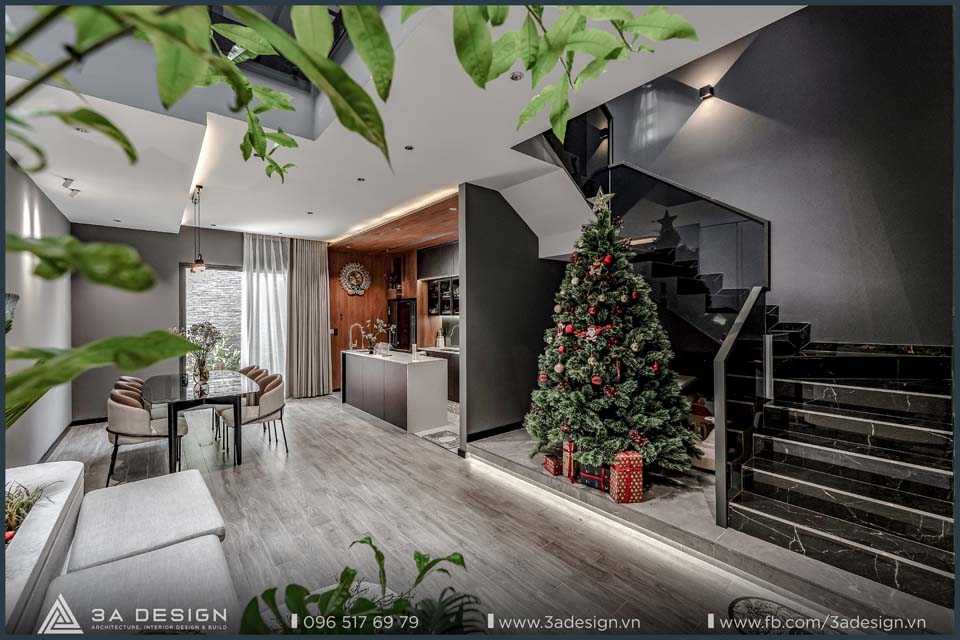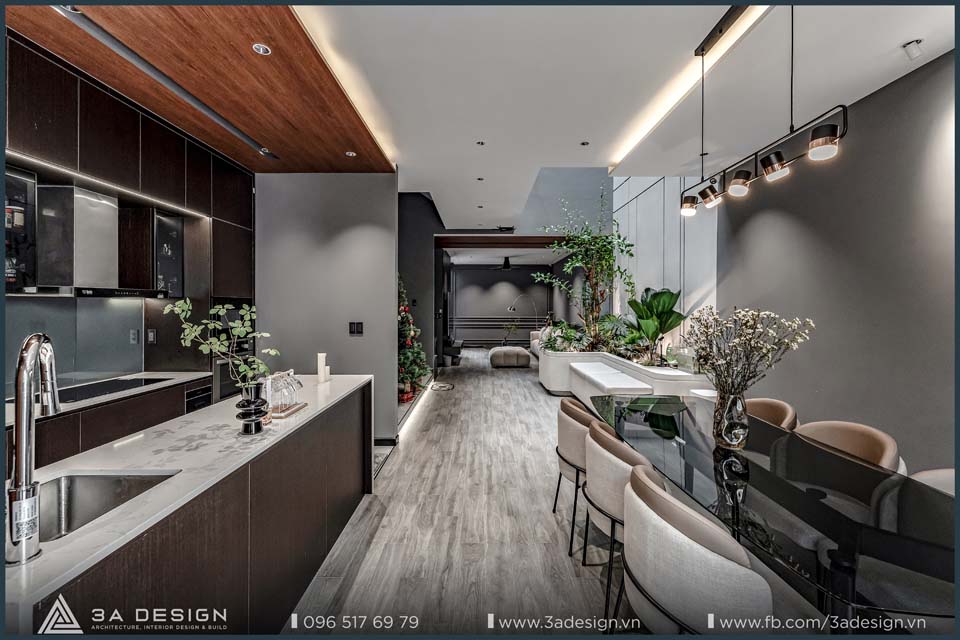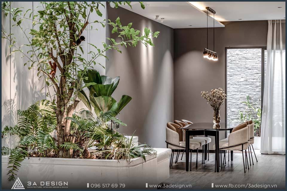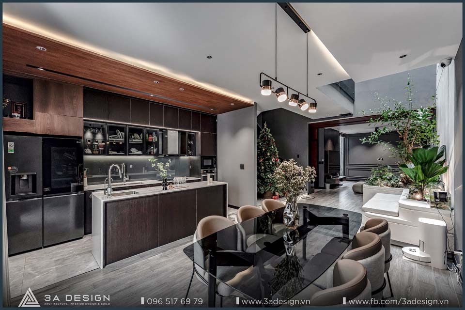 Khu vực phòng khách và bếp ăn được bố trí liền kề, tạo cảm giác rộng rãi và thoáng mát. Điểm nhấn của khu vực này là không gian thông tầng với tiểu cảnh và bệ ngồi, mang đến nơi thư giãn lý tưởng cho gia chủ.