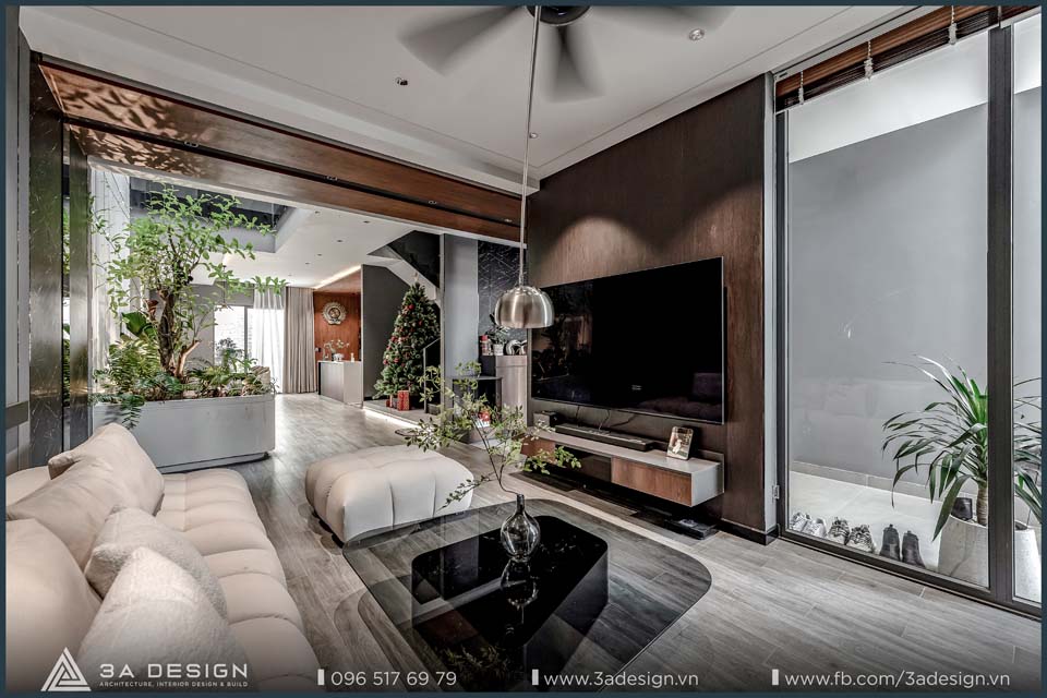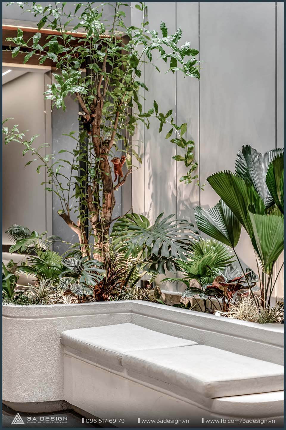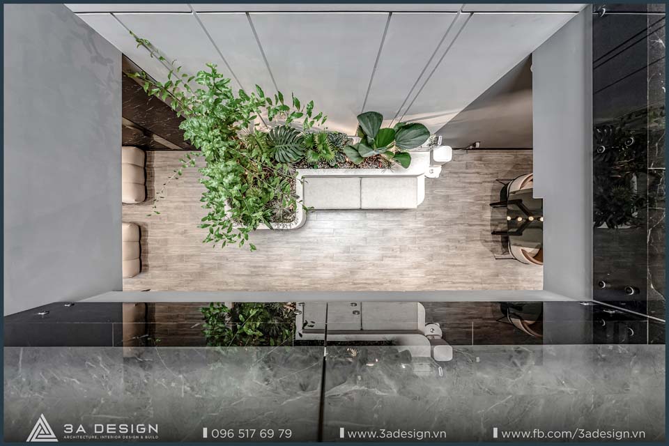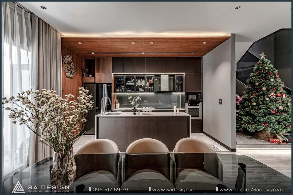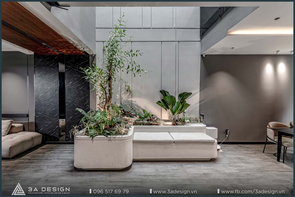 Khu vực phòng khách và bếp ăn được bố trí liền kề, tạo cảm giác rộng rãi và thoáng mát. Điểm nhấn của khu vực này là không gian thông tầng với tiểu cảnh và bệ ngồi, mang đến nơi thư giãn lý tưởng cho gia chủ.