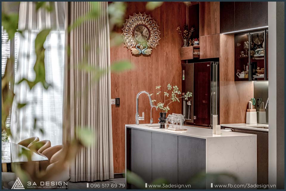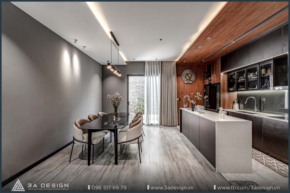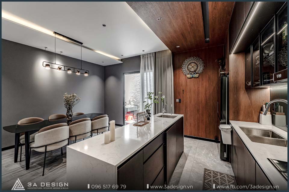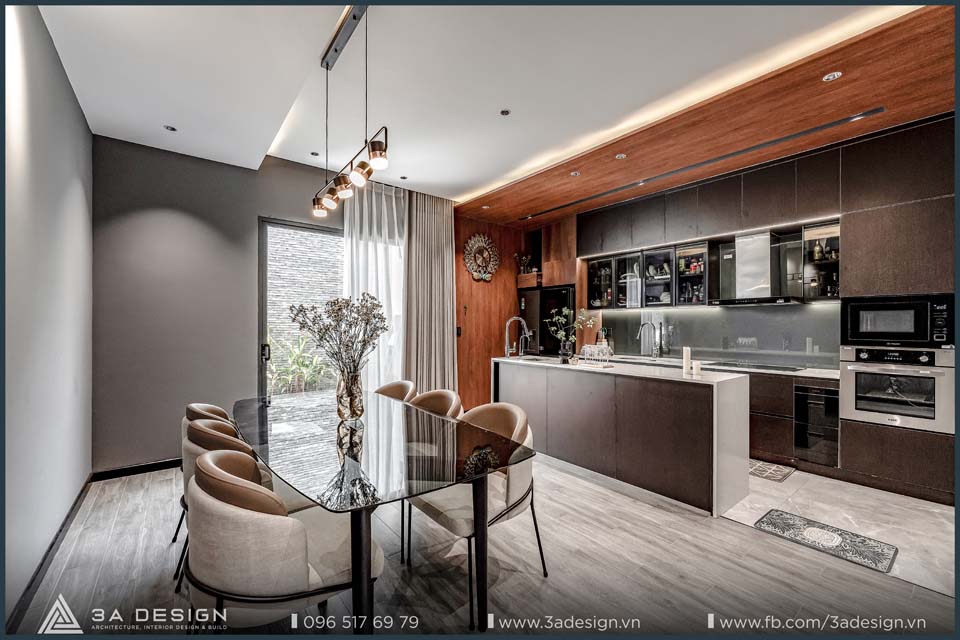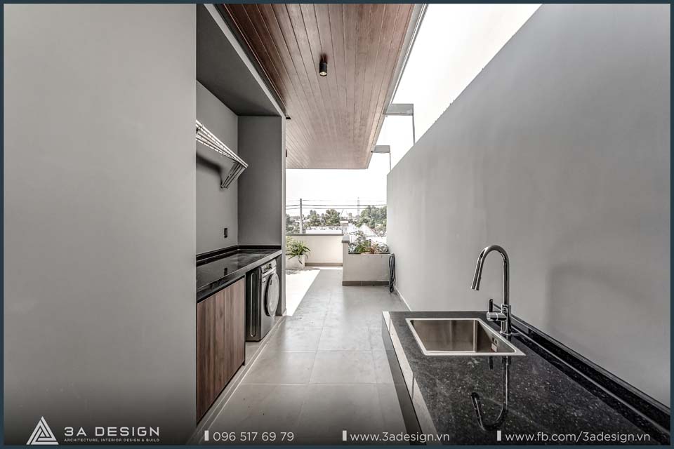 Phòng bếp hiện đại được trang bị đầy đủ thiết bị cao cấp, giúp việc nấu nướng trở nên dễ dàng và tiện lợi hơn. Phía sau nhà là khu vực tiểu cảnh nhỏ giúp lấy sáng và cân bằng màu sắc, tạo không gian xanh mát, đầy sức sống.