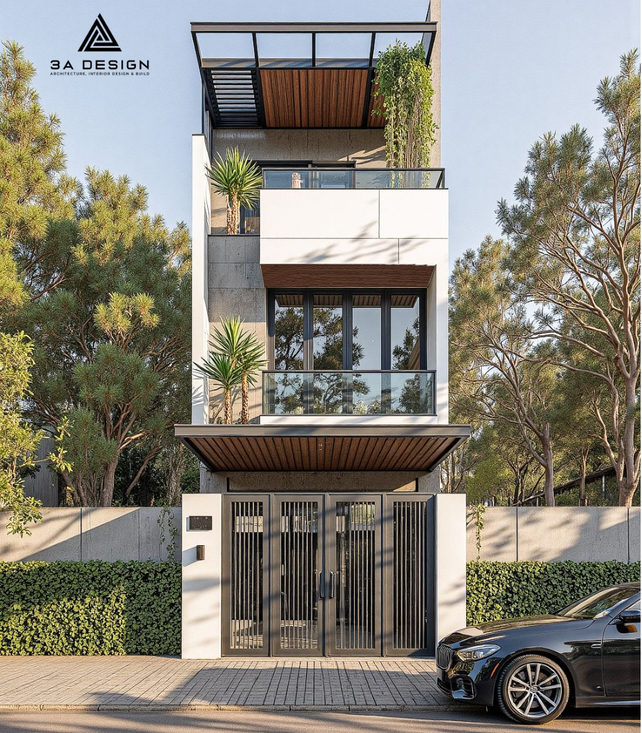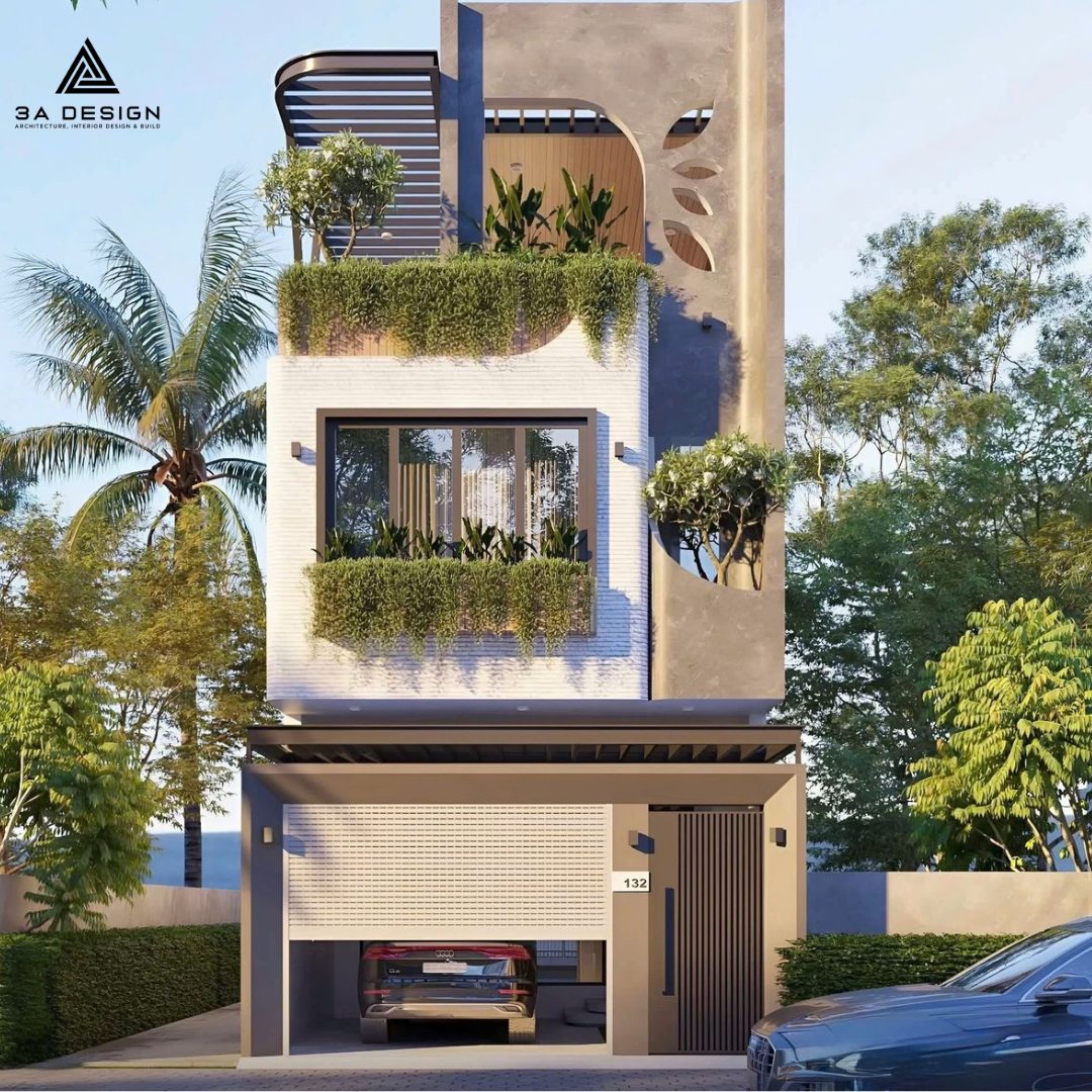 - Thiết kế xanh (Biophilic Design): Không chỉ là vài chậu cây ở ban công, các mẫu nhà phố 3 tầng hiện đại giờ đây tích hợp hệ thống vườn treo, tường đứng và luống rau sạch ngay trên sân thượng, giúp thanh lọc không khí và giảm nhiệt độ trong nhà.