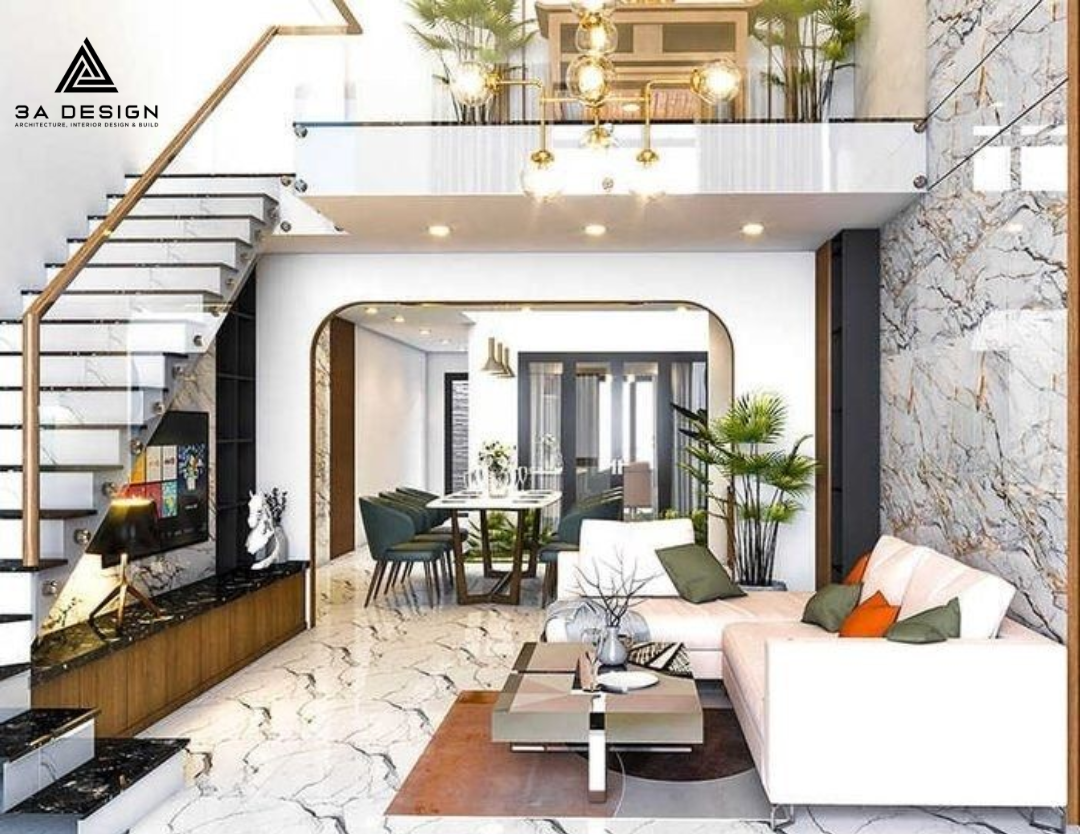 Tầng lửng giúp phòng khách có trần cao gấp đôi bình thường, tạo ra một không gian cực kỳ thoáng đãng và đẳng cấp. Đây là mẫu nhà phố 3 tầng hiện đại thường thấy trong các khu đô thị cao cấp.