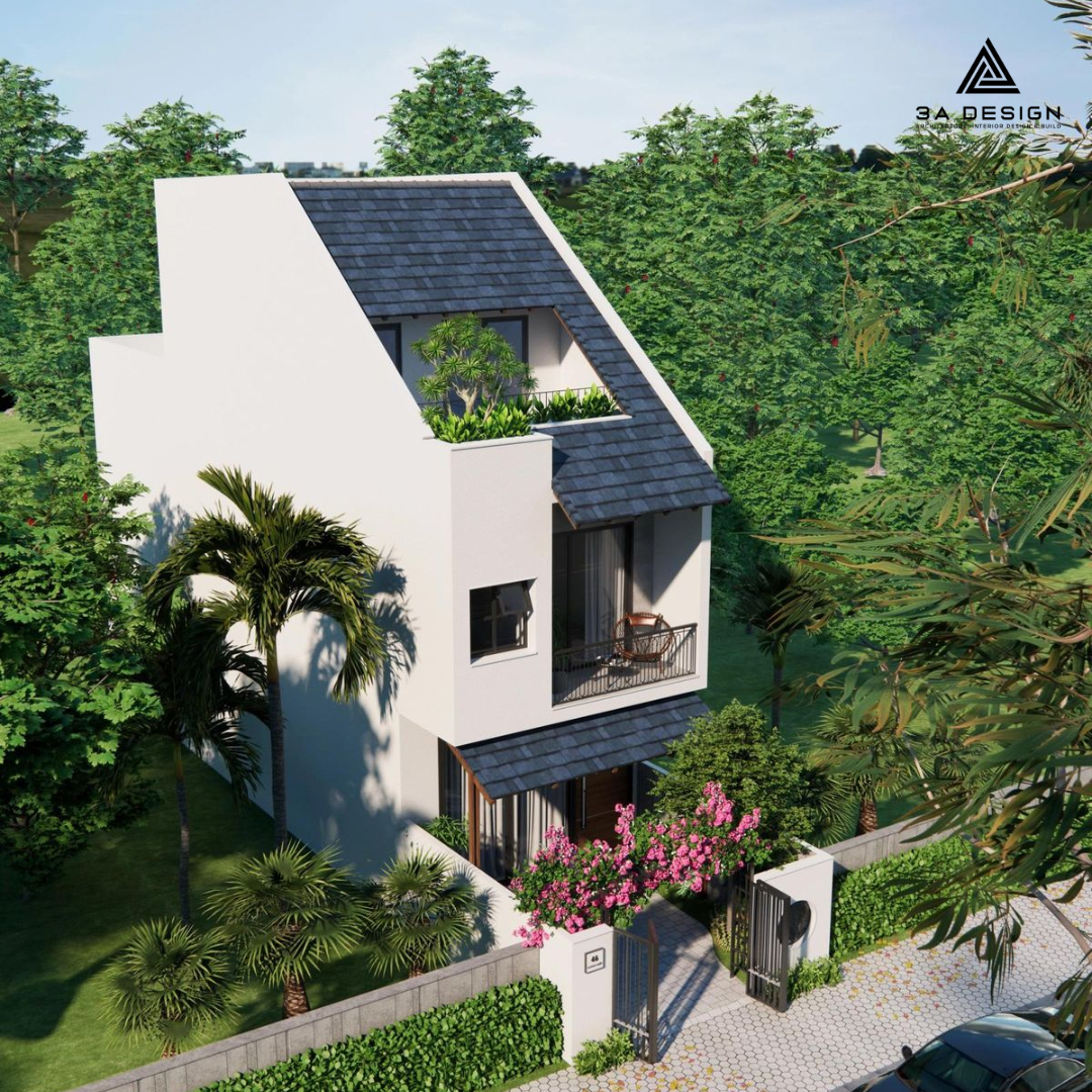 Sự kết hợp giữa hình khối hiện đại và hệ mái Thái truyền thống giúp ngôi nhà trông cao ráo, thanh thoát và có khả năng thoát nước, chống nóng cực tốt dưới thời tiết khắc nghiệt của Việt Nam.
