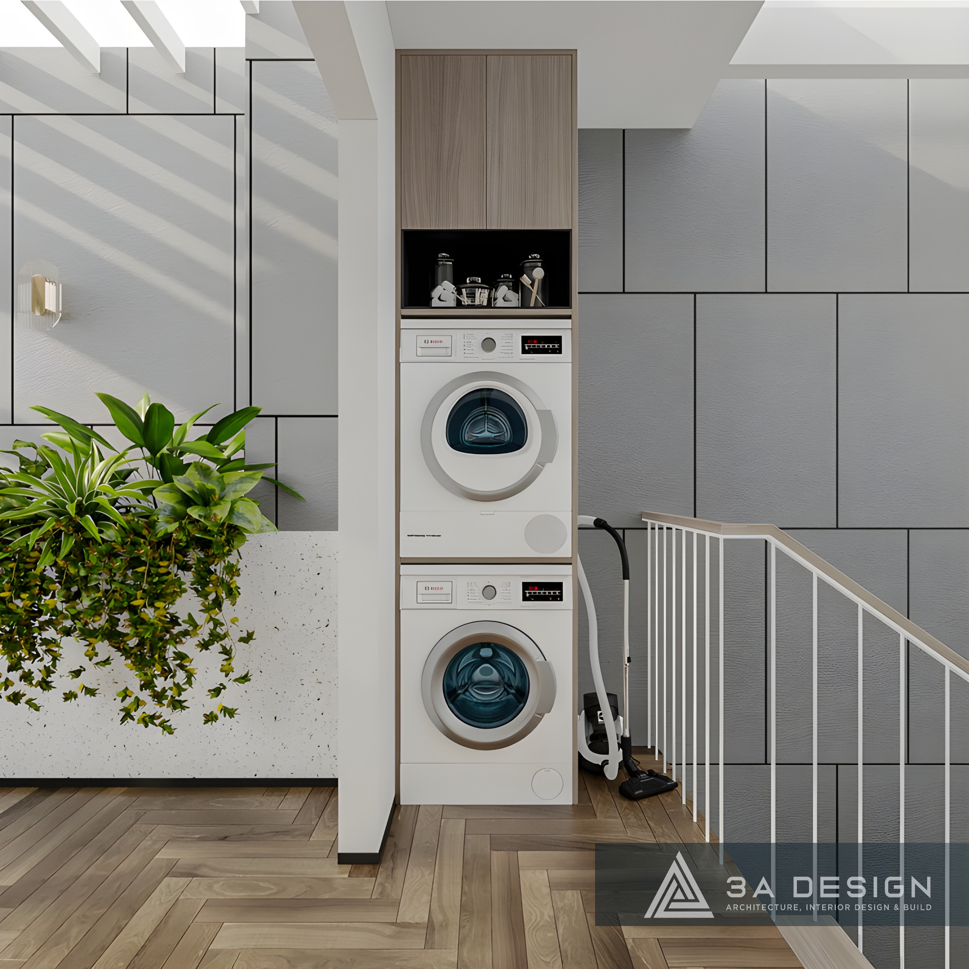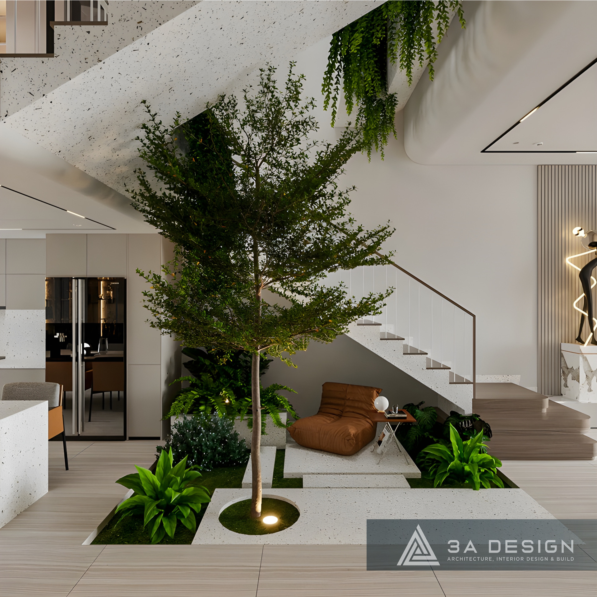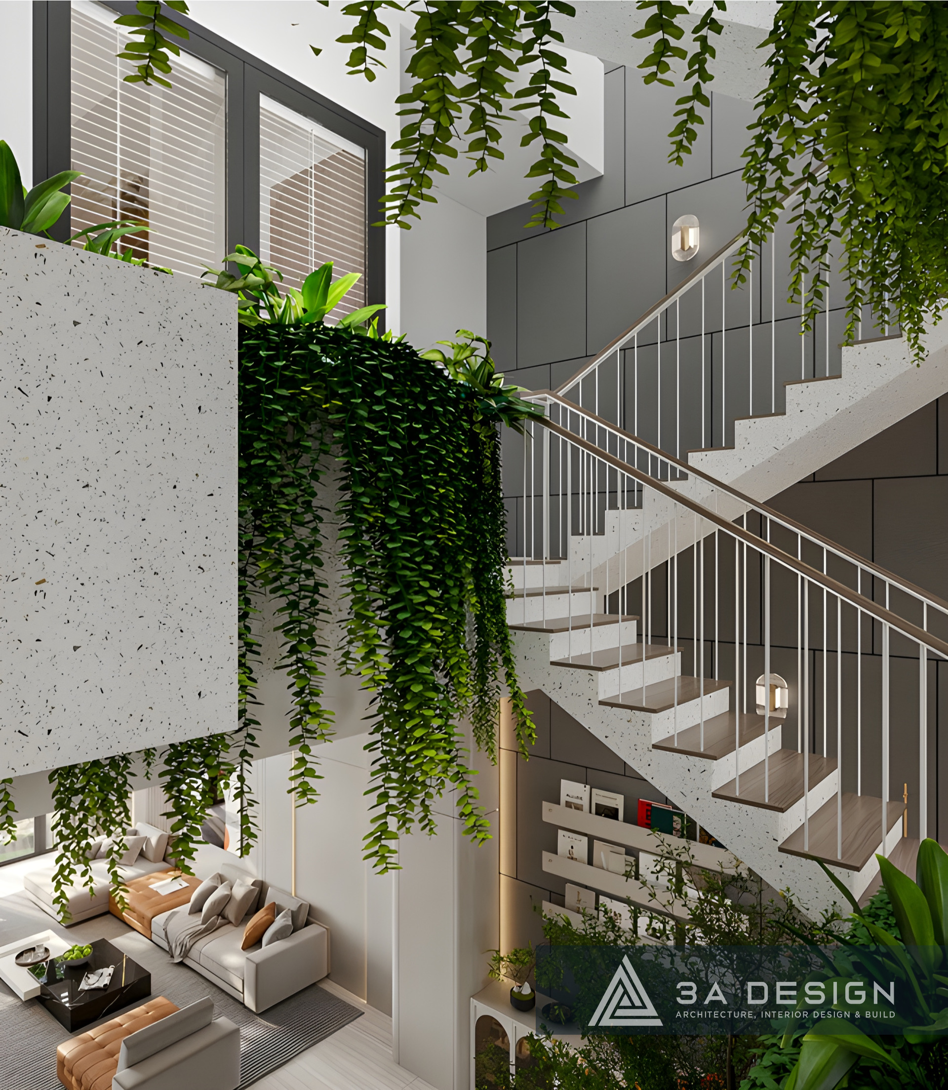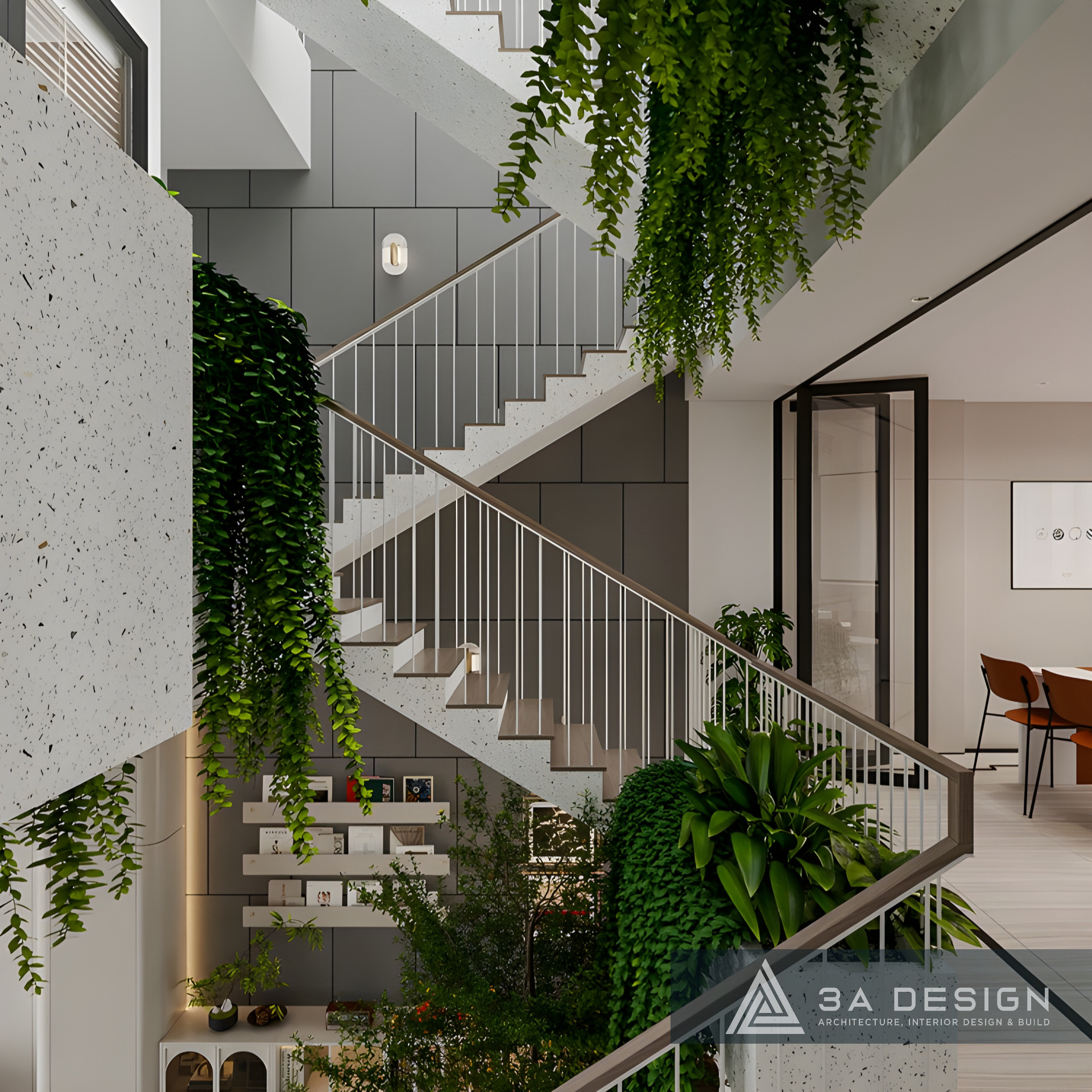 Đặc biệt, khu vực cầu thang được thiết kế thành một tiểu cảnh xanh ấn tượng, mang trọn hơi thở thiên nhiên vào trung tâm ngôi nhà. Chi tiết này không chỉ tăng tính thẩm mỹ mà còn cải thiện chất lượng không khí, nhấn mạnh triết lý sống xanh của gia chủ.
