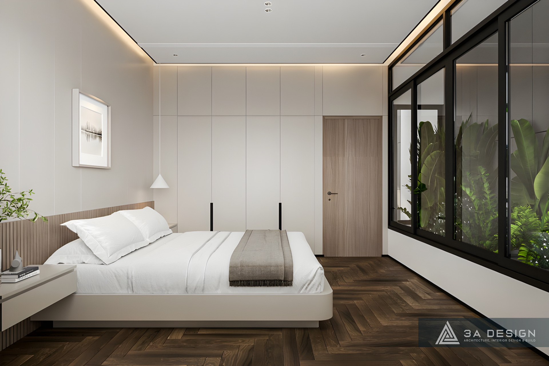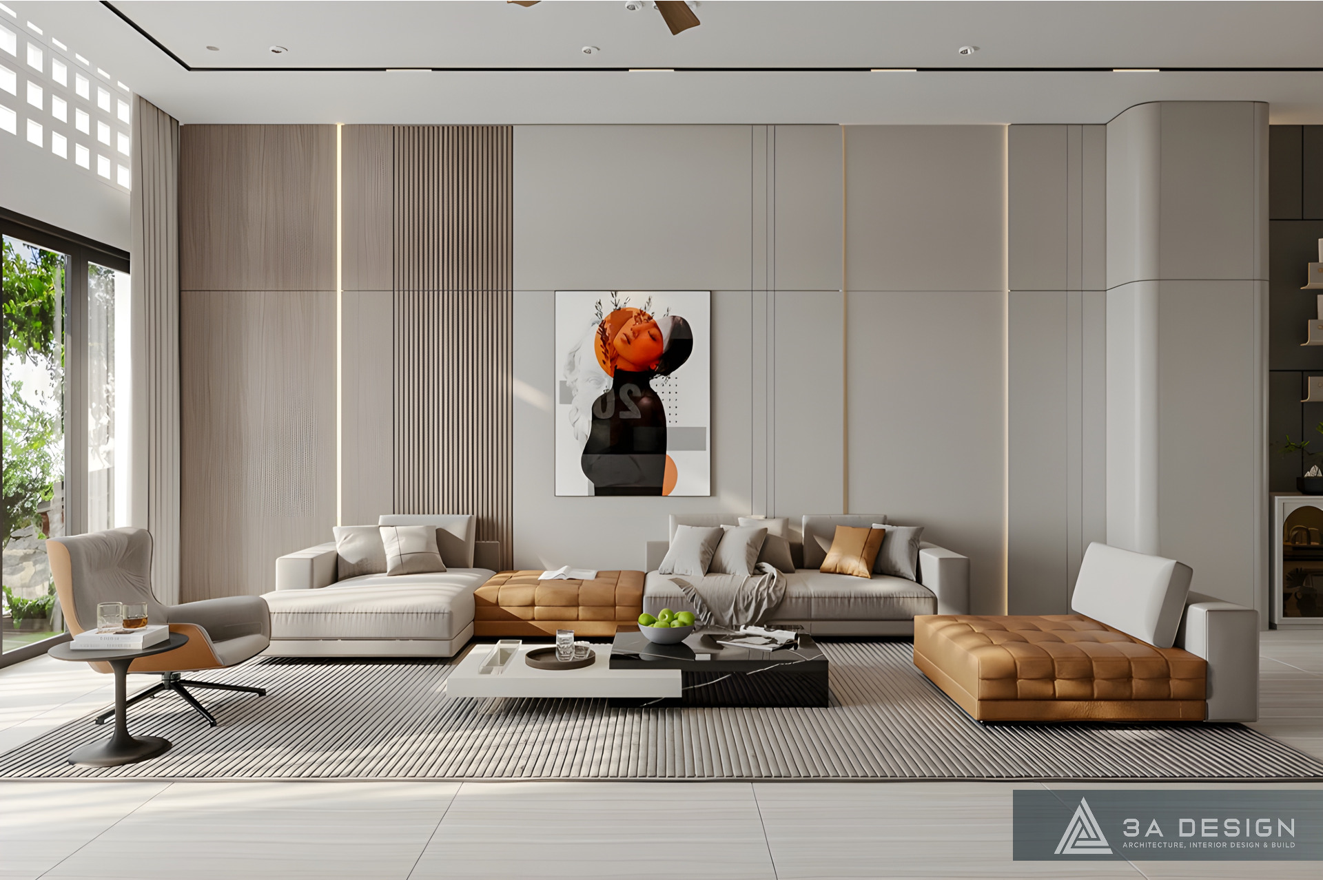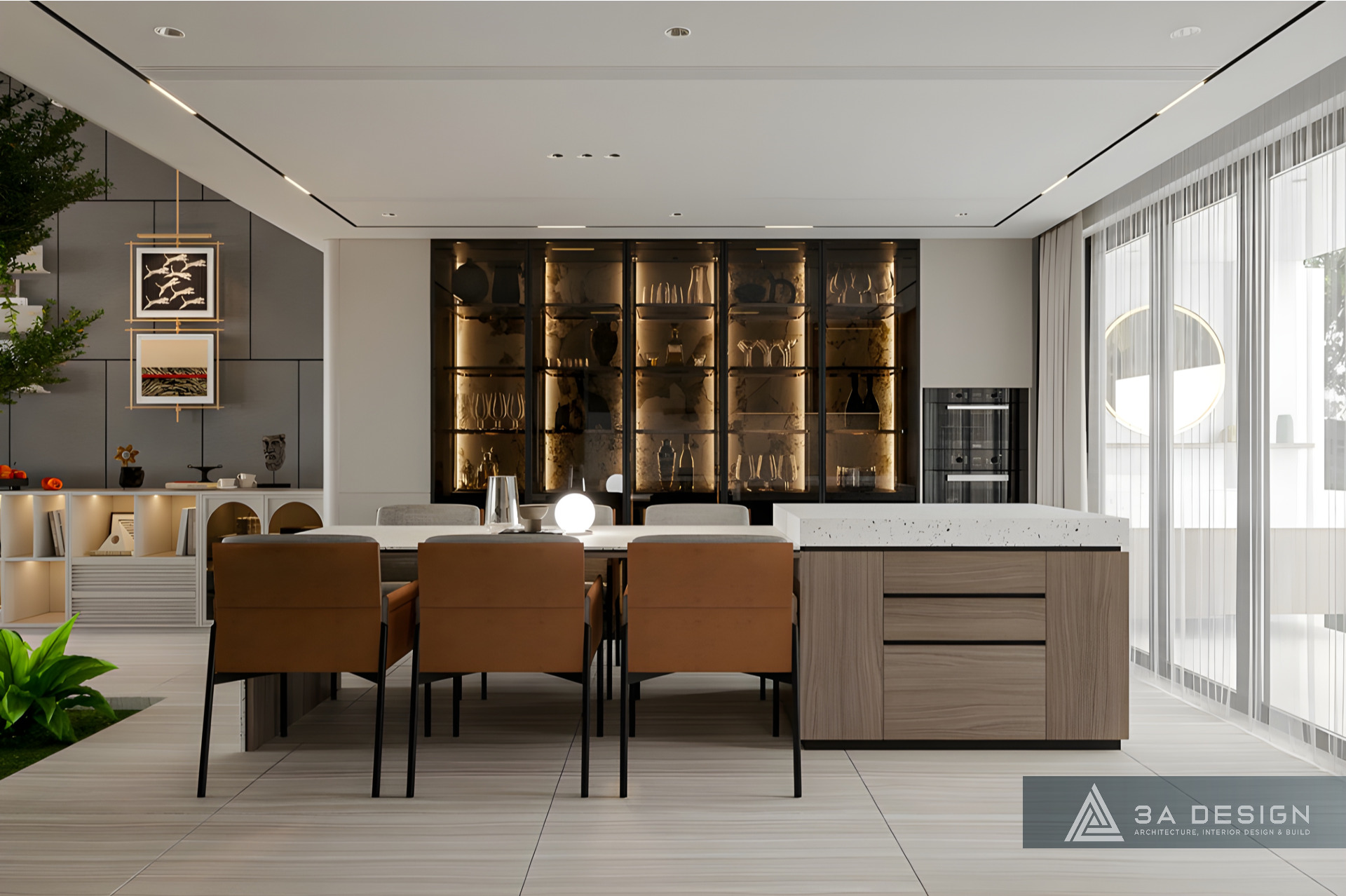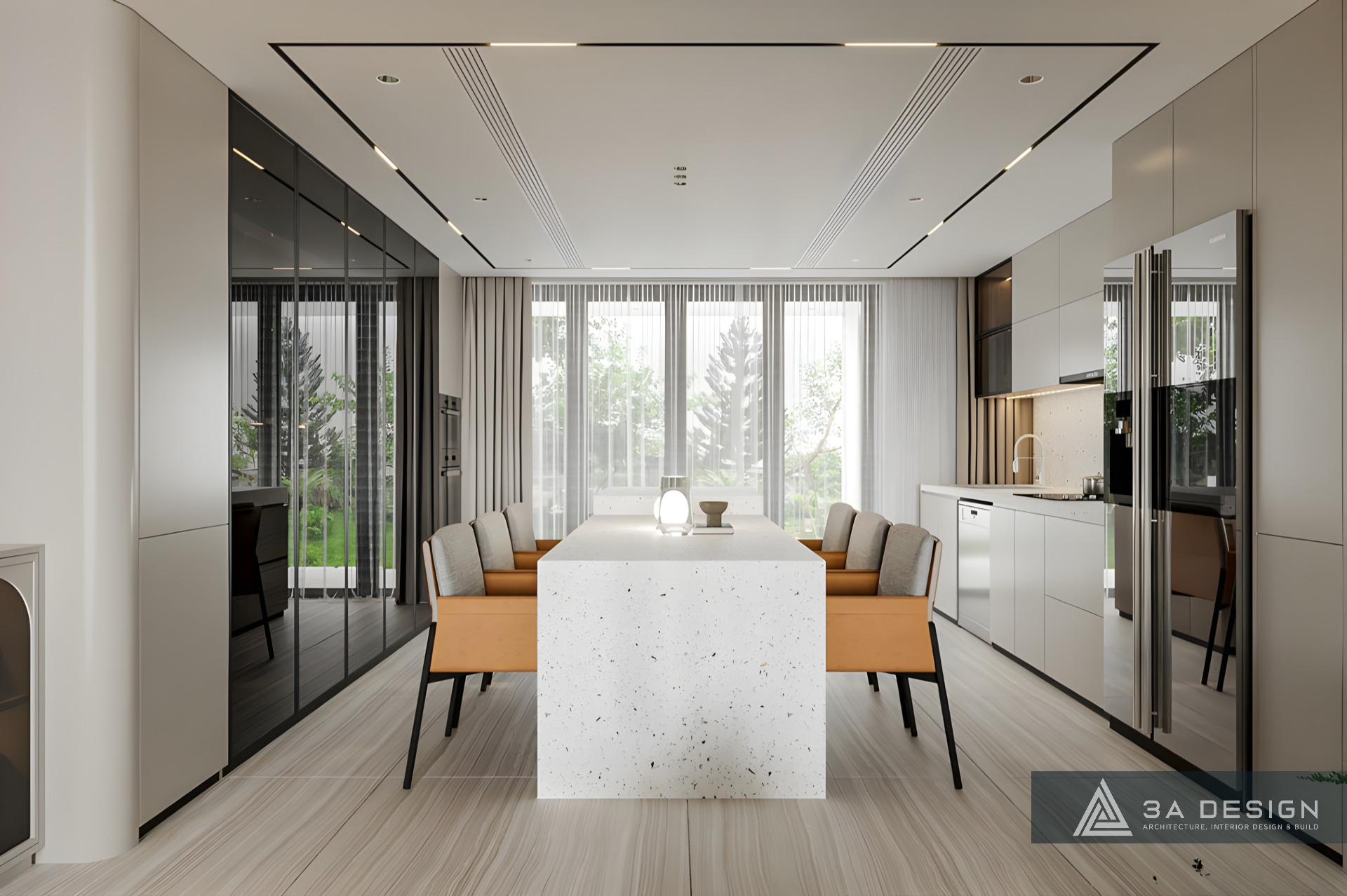 Gia chủ yêu thích sự tối giản và không gian mở. Vì thế, các Kiến trúc sư của 3A Design đã khéo léo tận dụng ánh sáng tự nhiên thông qua hệ thống khung cửa kính lớn bố trí tại những vị trí chiến lược. Ánh sáng tràn ngập không chỉ tôn lên vẻ đẹp tinh tế, mượt mà từ đường nét nội thất tối giản mà còn tạo cảm giác rộng mở, giúp đối lưu không khí trong lành, tăng thêm sức sống cho công trình.
